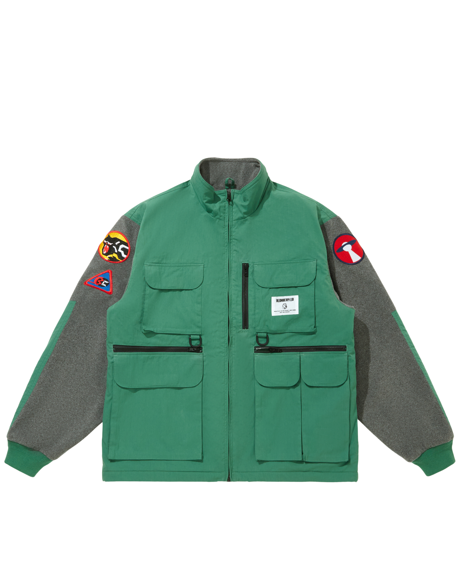 This Hunting Jacket features contrast sleeves, multiple utility pockets, zip closures, and embroidered patches.