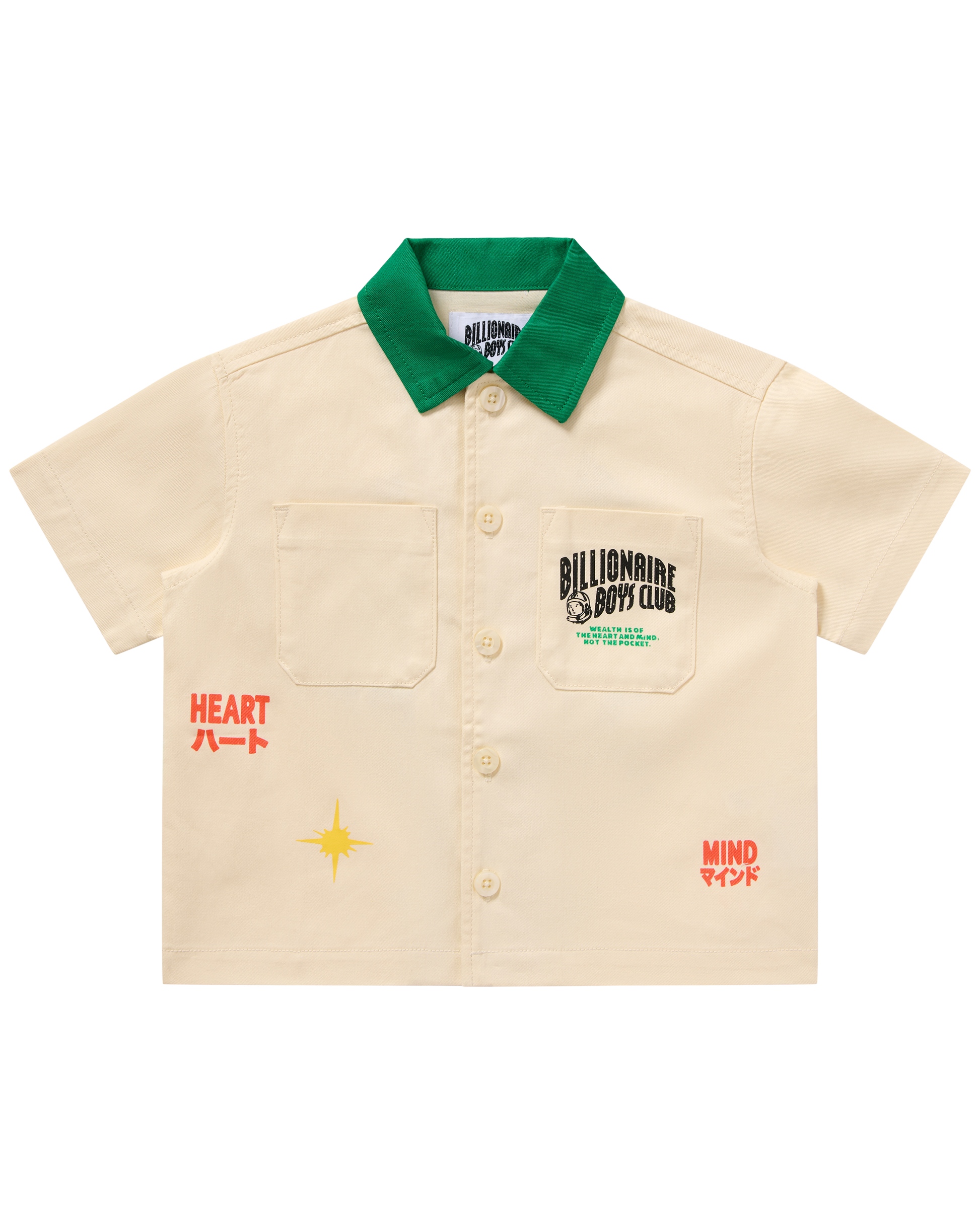 Buzzard SS Woven features a contrasting green collar and Signature Billionnaire Boys Club graphics throughout.