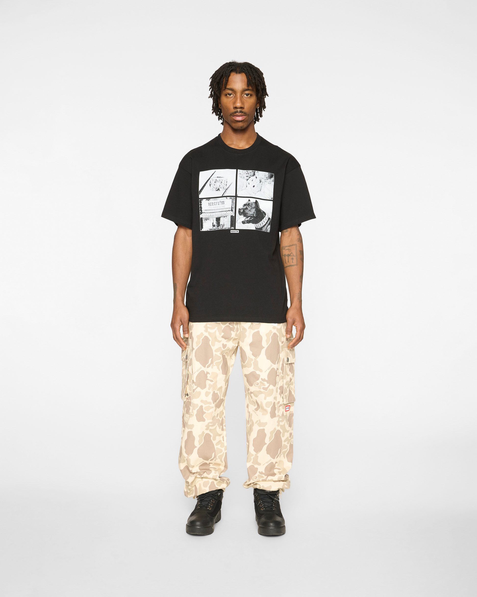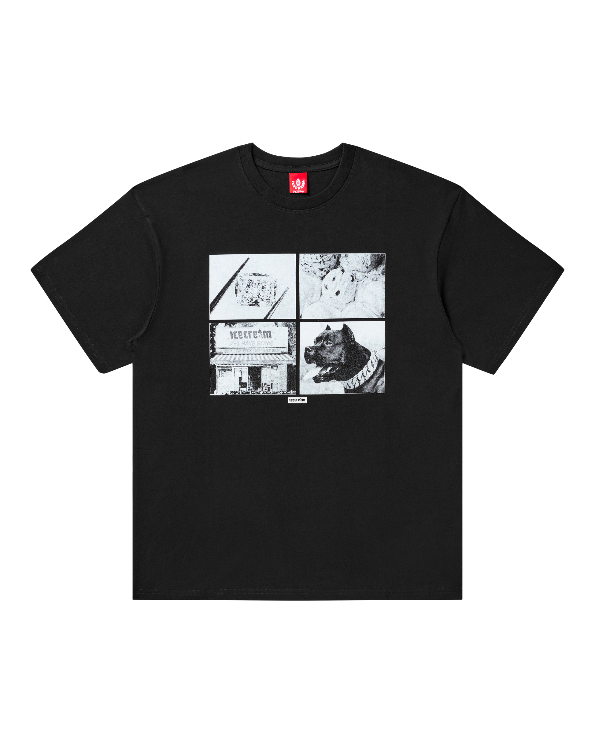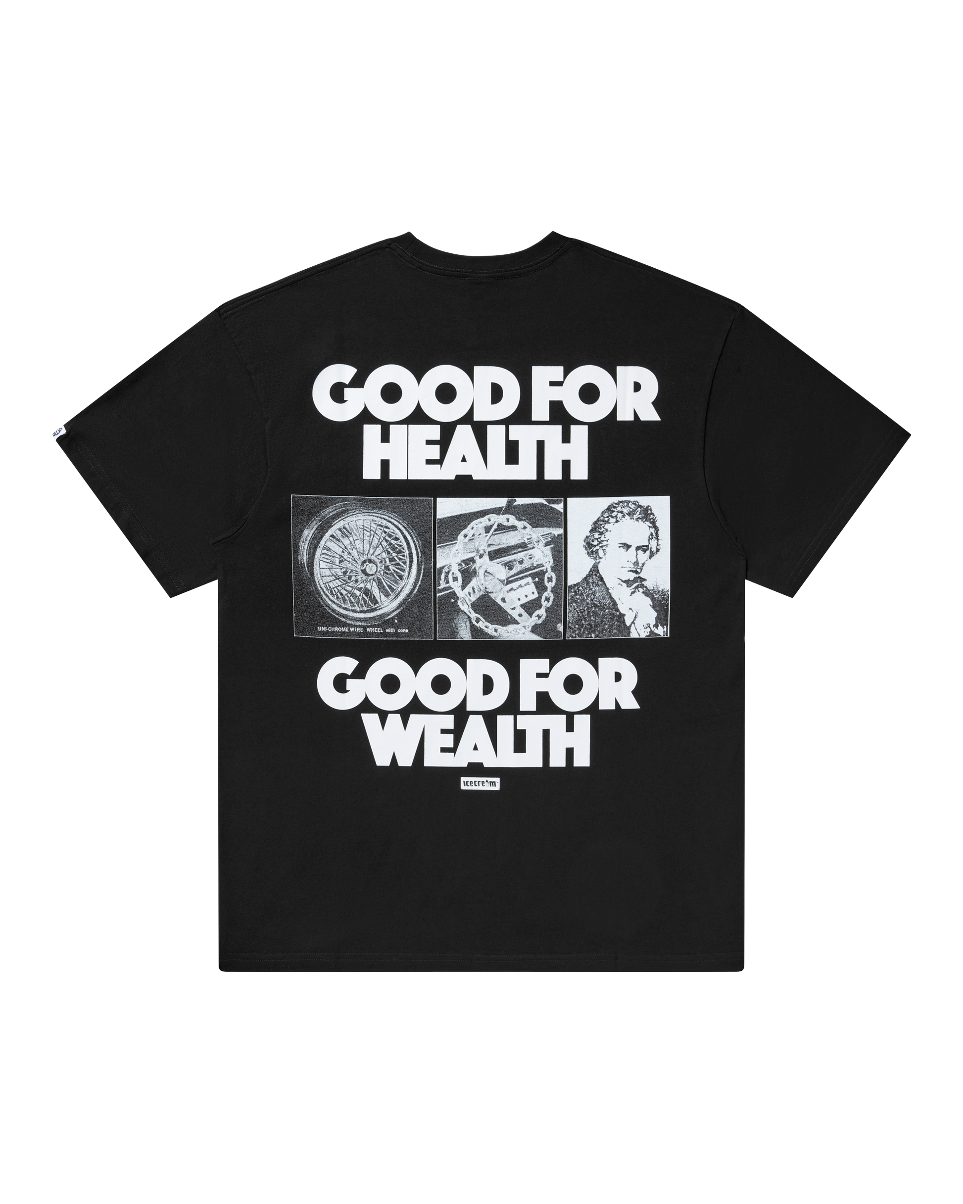 The Good for Health Tee features four vintage-style images, including the Icecream storefront and a dog portrait, and prints stacked with clean typography and three monochrome photo panels on the back.