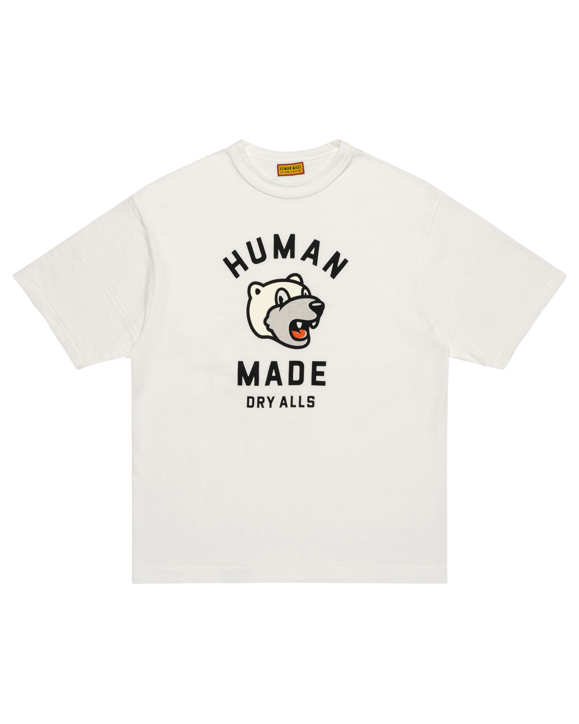 Human Made’s standard slub yarn T-shirt featuring a Polar bear graphic on the front and Single heart logo on the back.