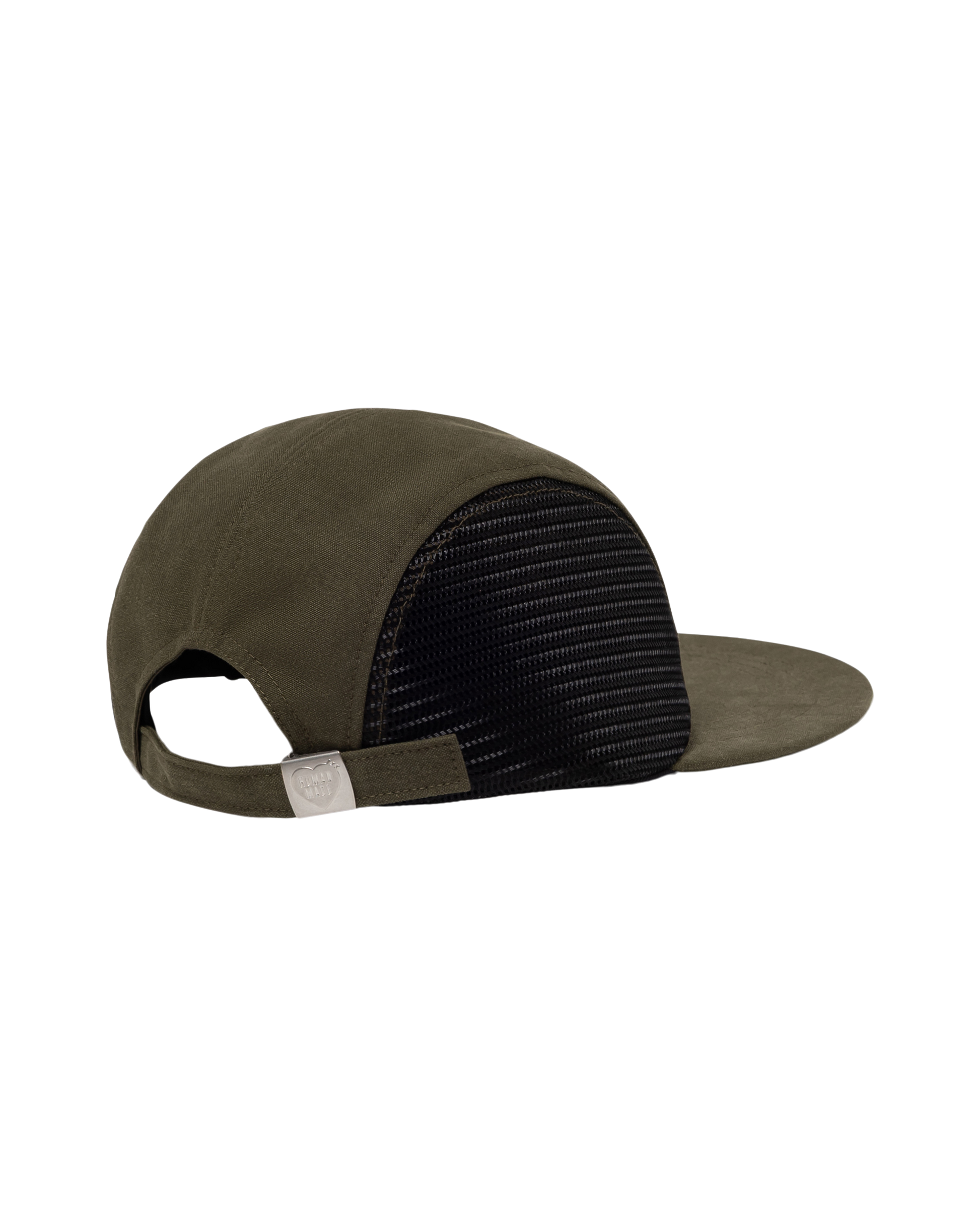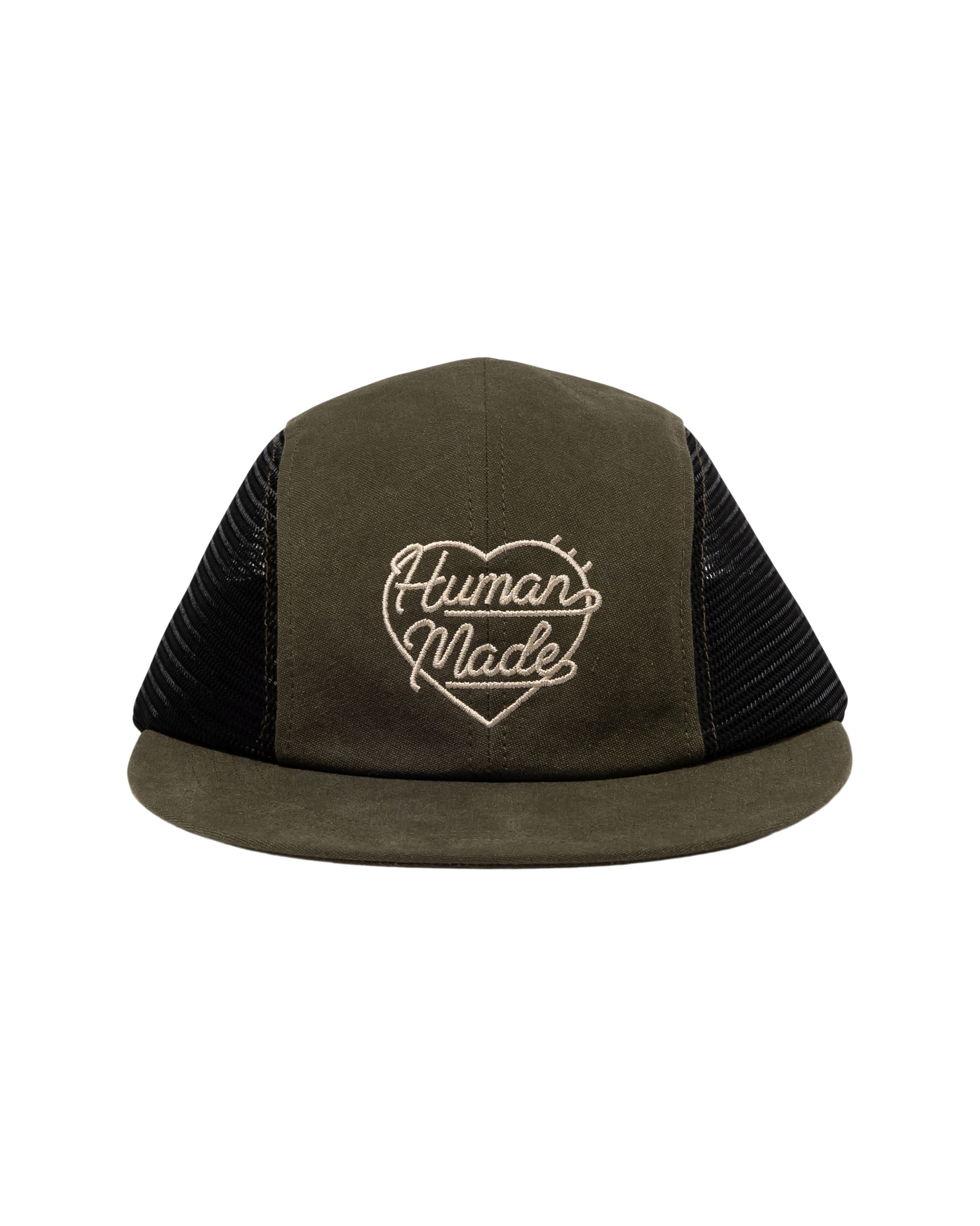 Long bill cap with a four-panel design features a long, flat brim, a heart logo embroidered on the front, and an adjustable strap at the back.
