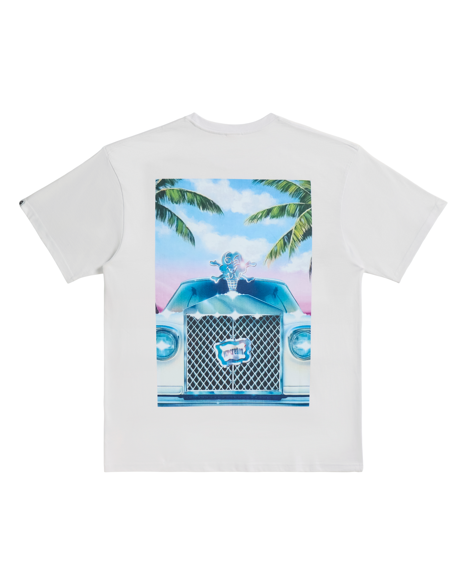 The Miami SS Tee features the Soft Serve logo printed on the front and a luxury car scene with tropical accents and signature Icecream detailing on the back.