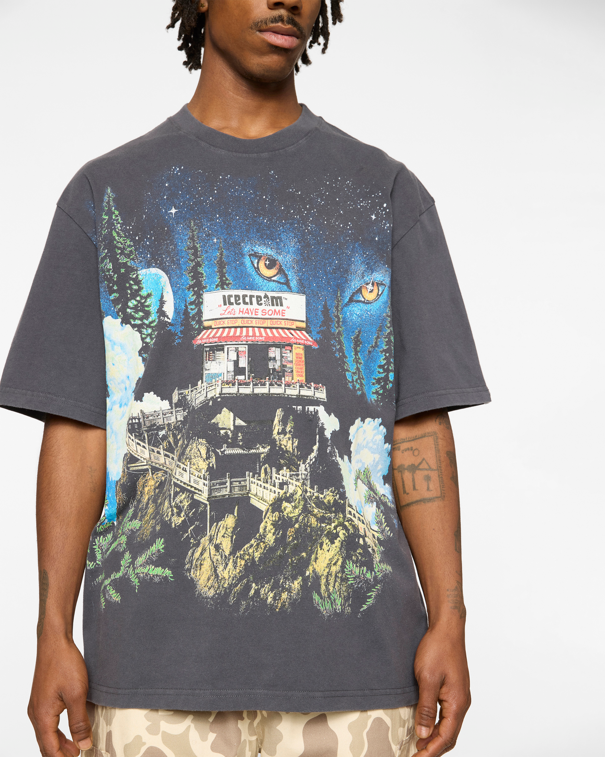 The Pagoda Tee features a detailed scenic illustration, showing an Icecream storefront built into a mountain cliffside with surrounding forest views, along with the IC Signet printed on the back neck.