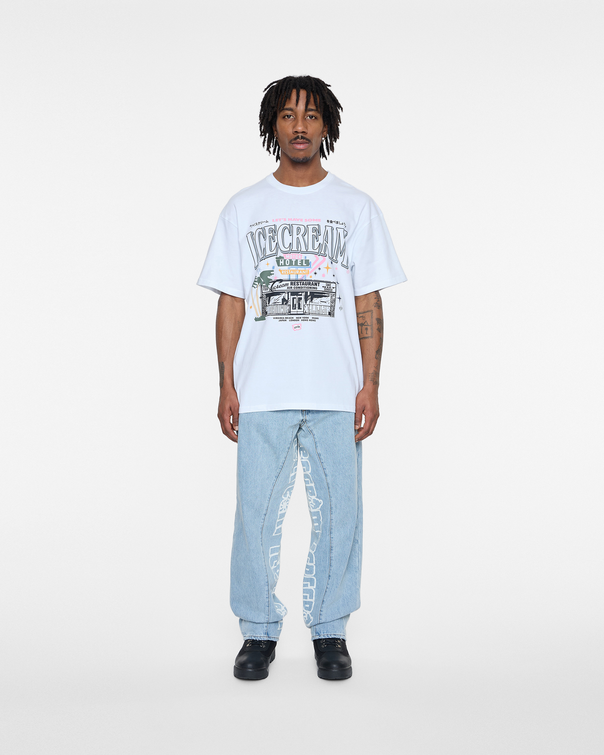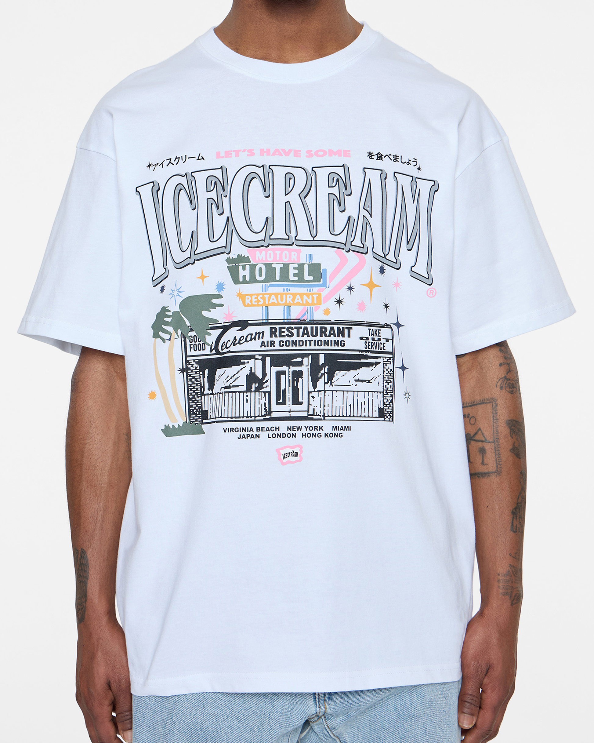 The Store Front SS Tee features a vintage diner-inspired Icecream graphic with retro motel signage, restaurant artwork, and playful color accents on the front. The back features the IC Signet.
