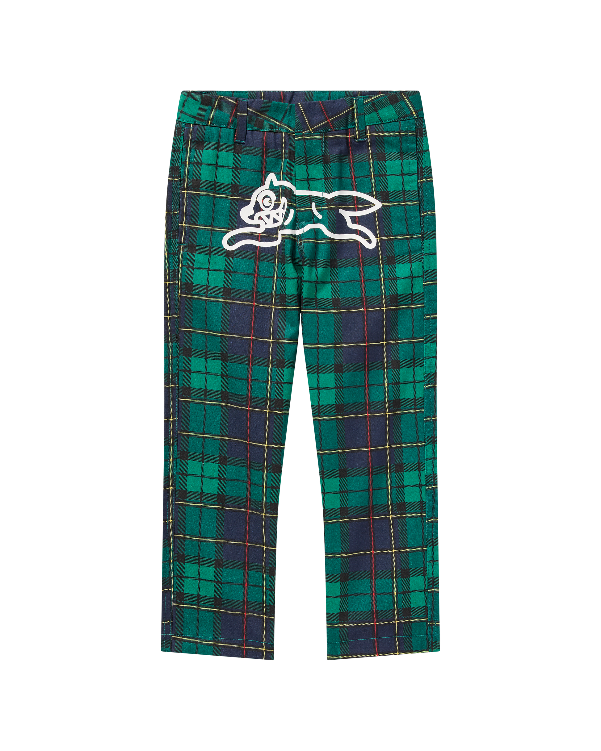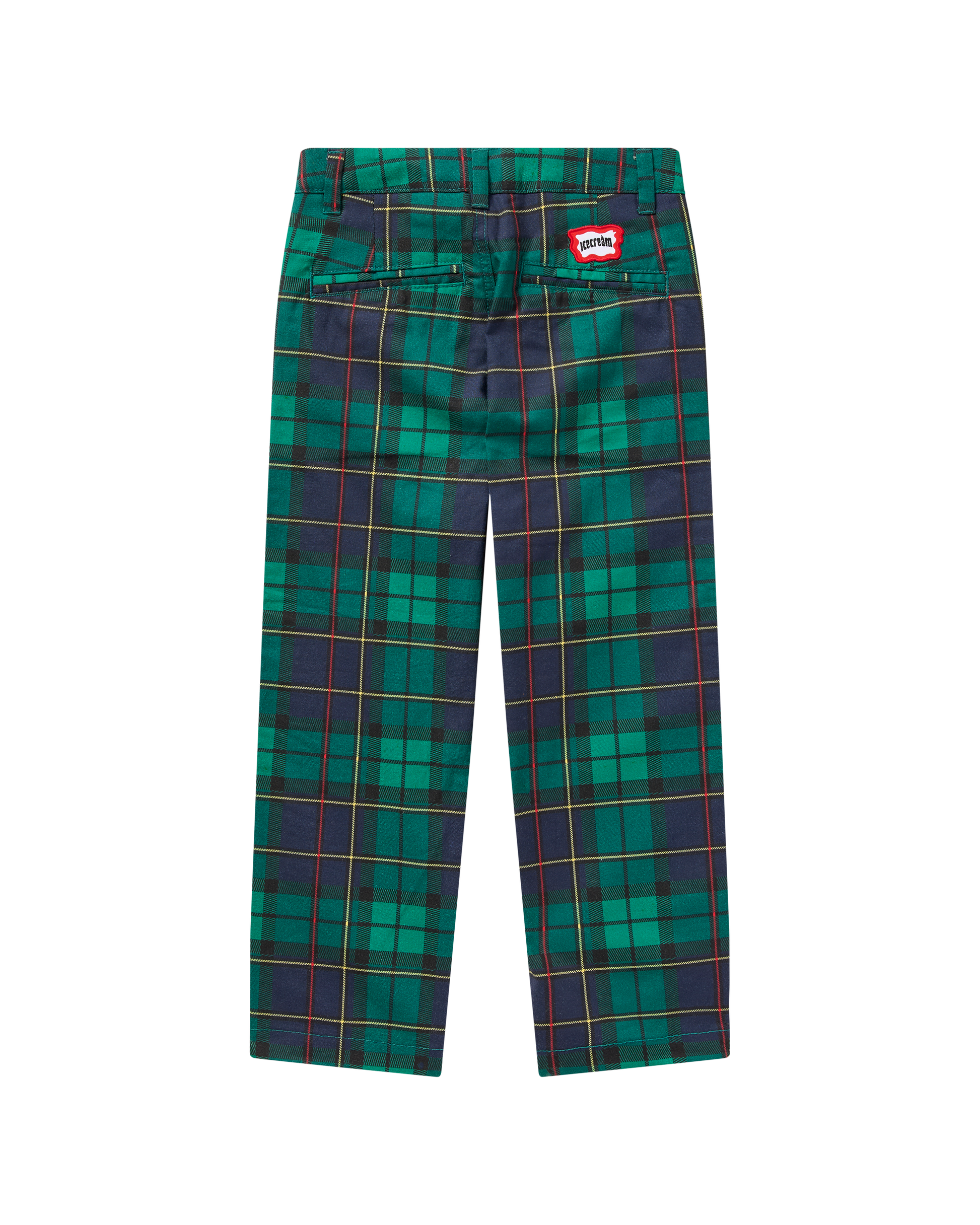The Tar Pant features a plaid design, the Running Dog printed on the front, and a woven label on the back pocket.