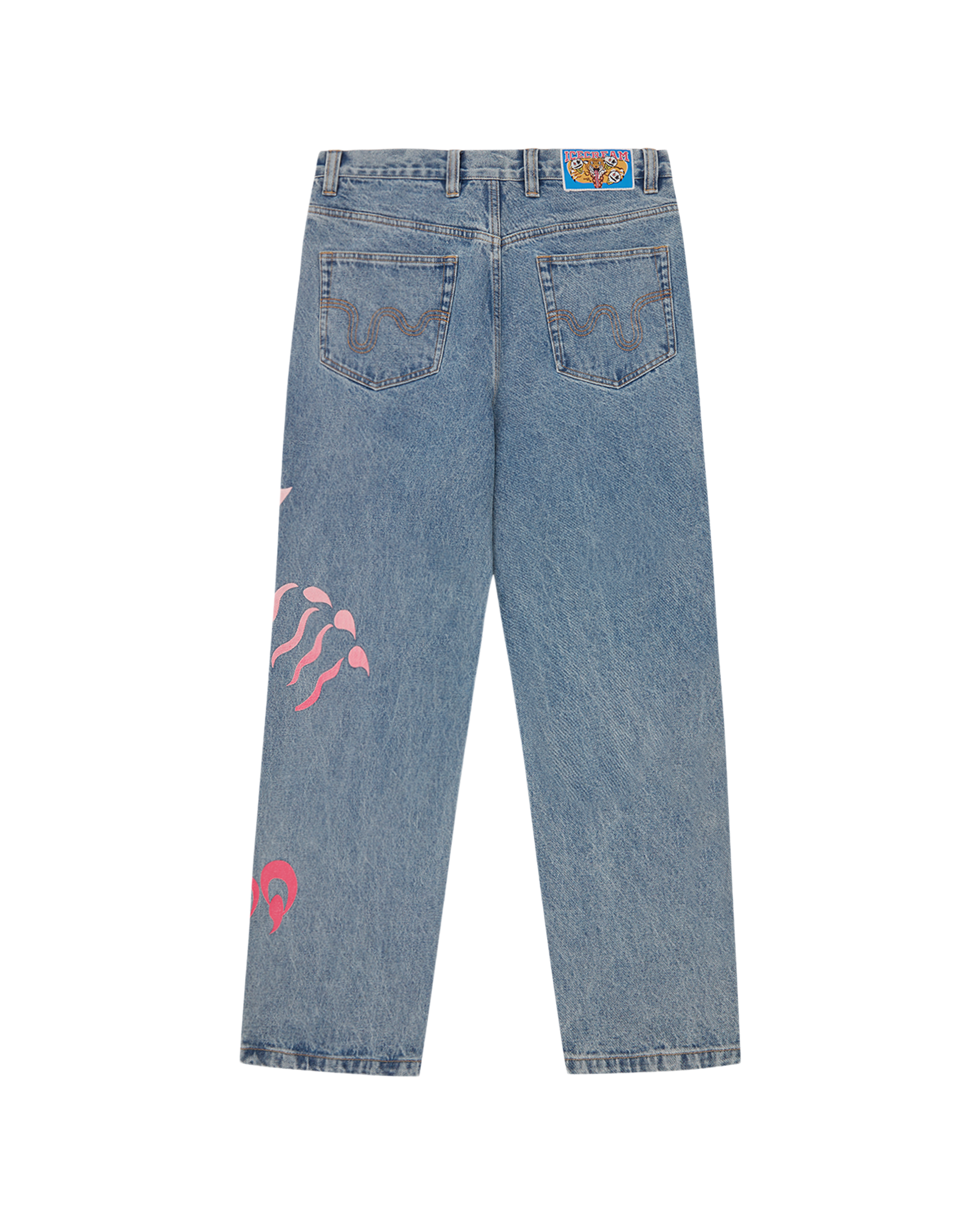 Tiger Triple Scoop Denim Pants featuring bold Icecream graphics on the front and back. The front showcases an oversized pink Running Dog graphic down the leg, the back keeps it classic with signature pocket drip stitching.
