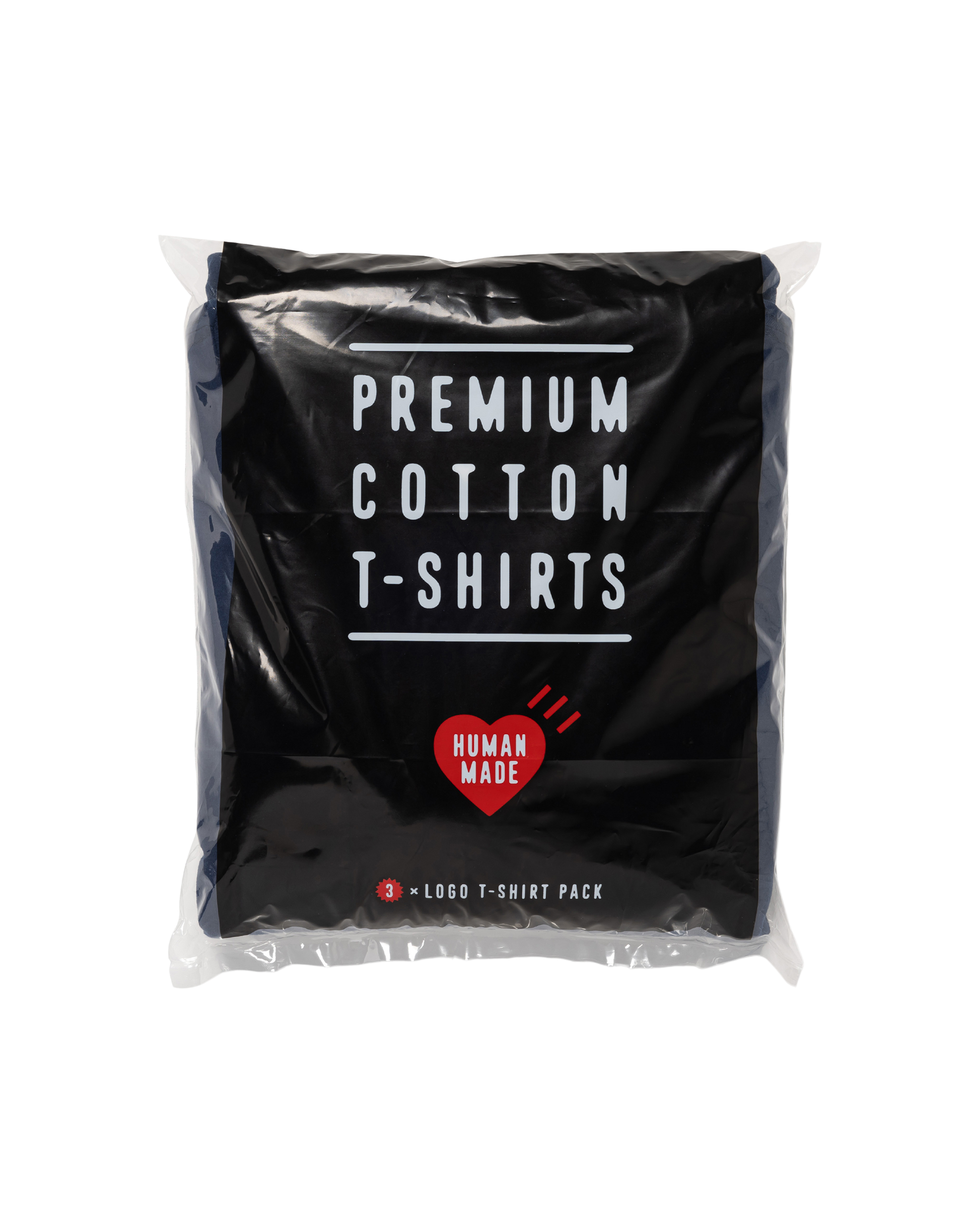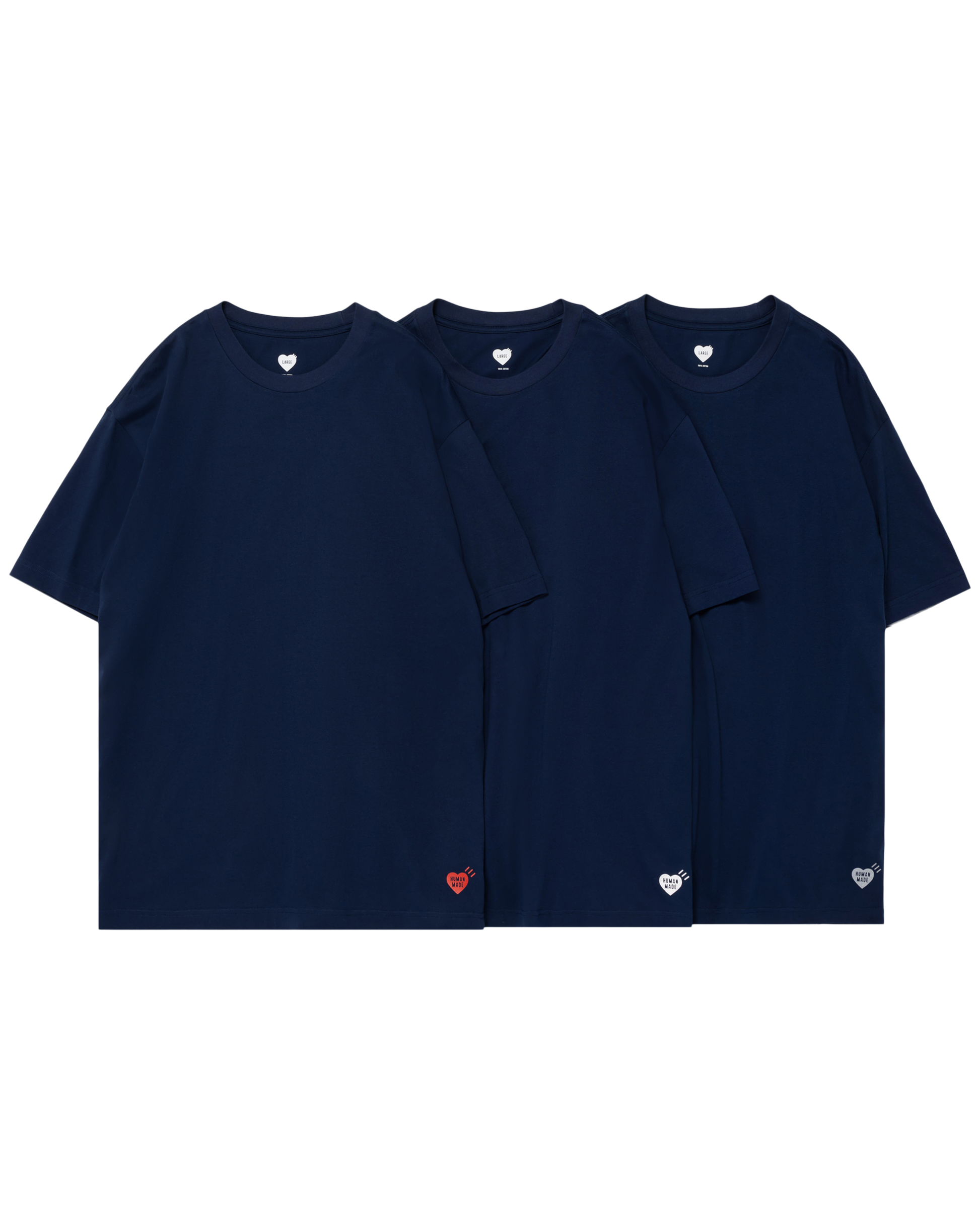 This 3-pack T-shirt set features three shirts, each featuring a unique heart logo in different colors printed on the left hem.