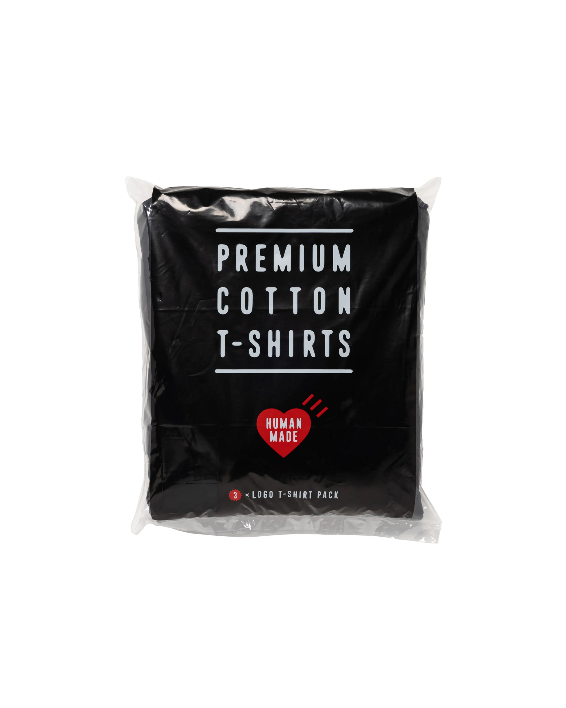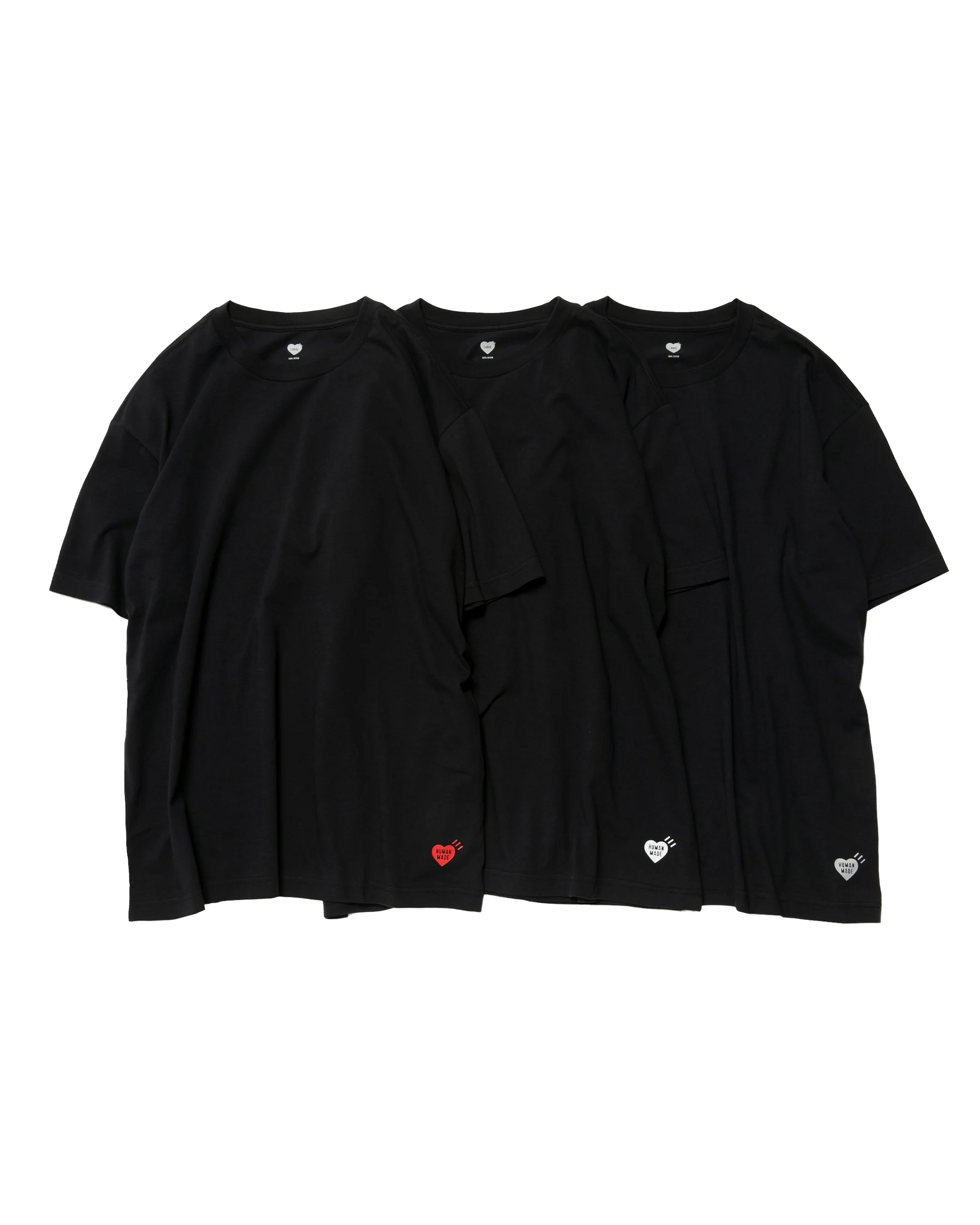 This 3-pack T-shirt set features three shirts, each featuring a unique heart logo in different colors printed on the left hem.