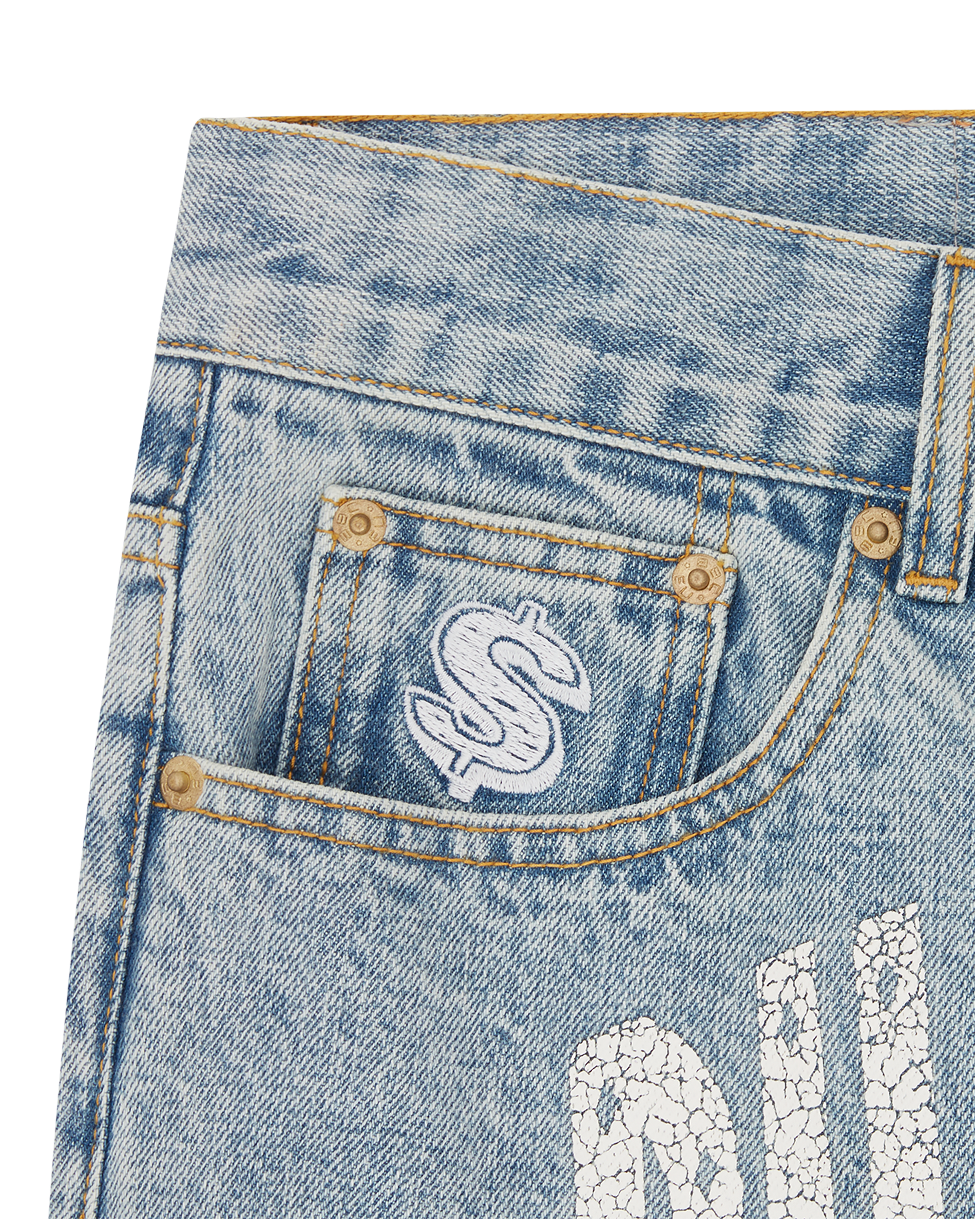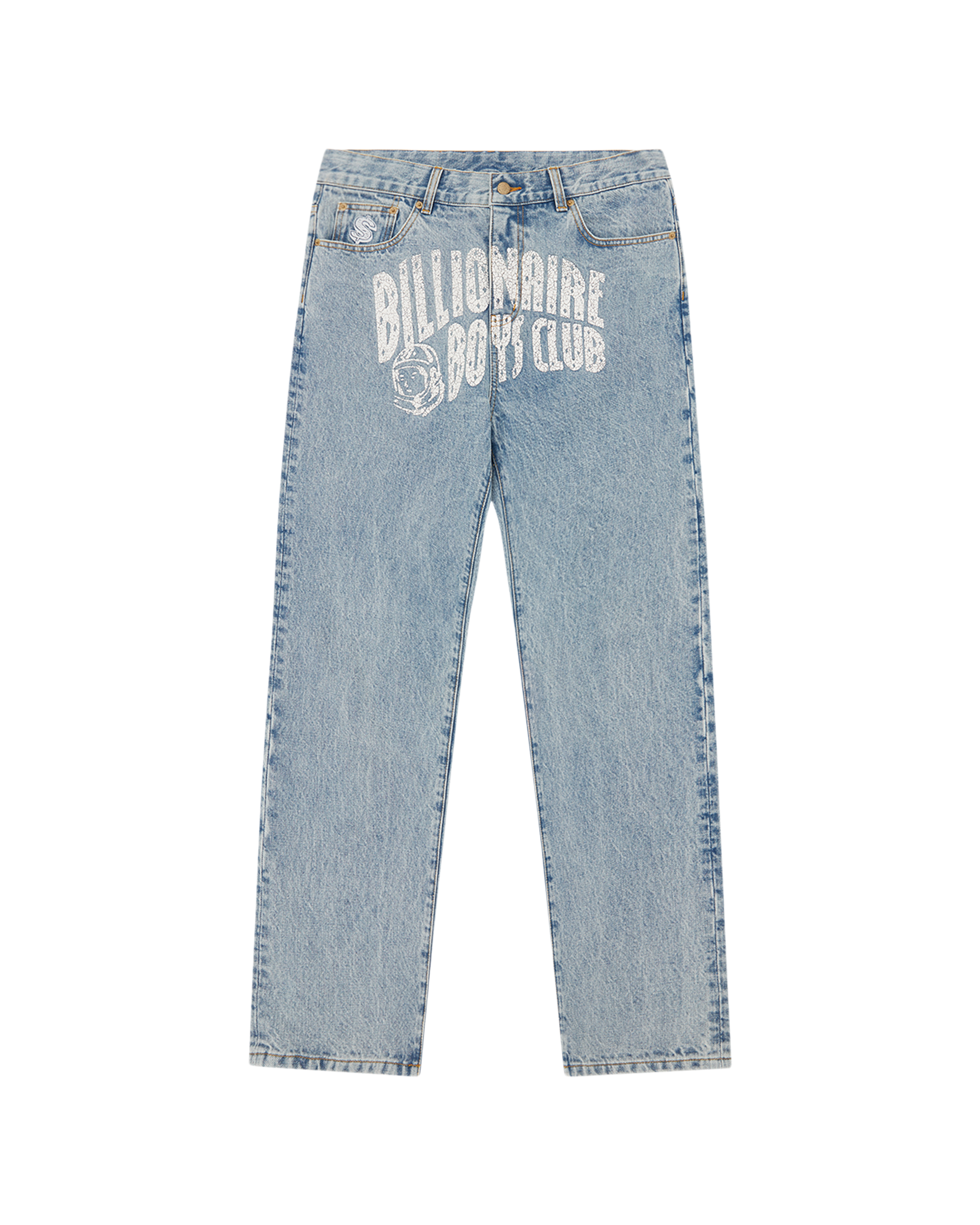 Arch Logo Denim Pant presenting the cracked ink Billionaire Boys Club logo on the front and the embroidered Astro helmet on both the back pockets. It is detailed with the dollar signet at coin pocket.
