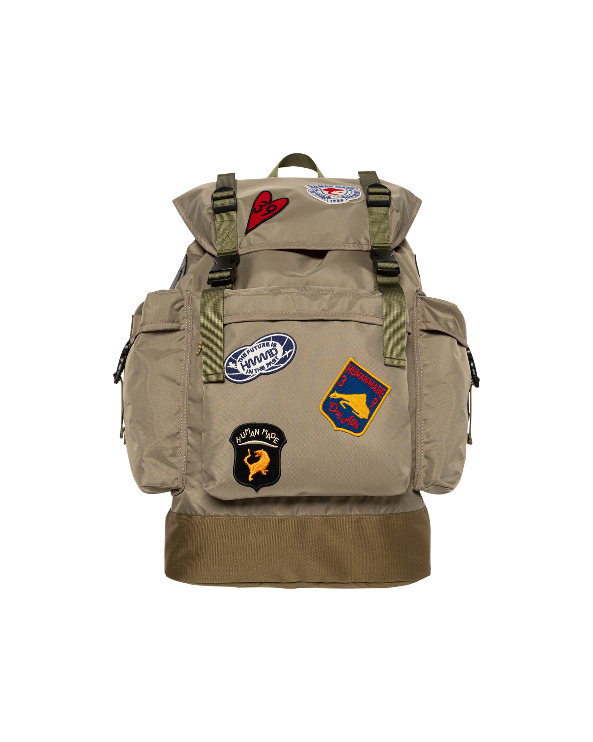 Durable backpack with embroidered patches, drawstring main compartment, front zip pocket, side buckle pockets, and padded mesh back for comfort.