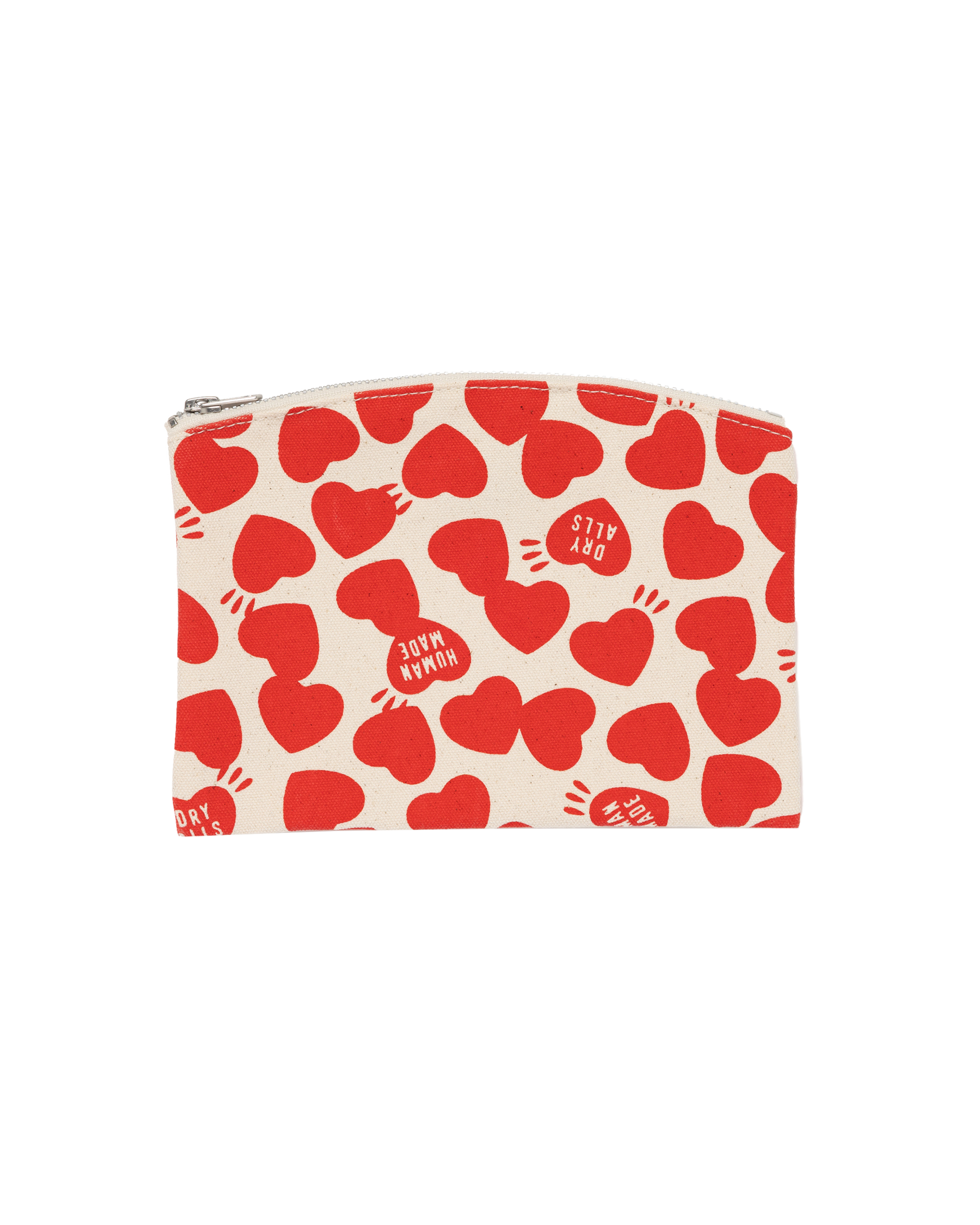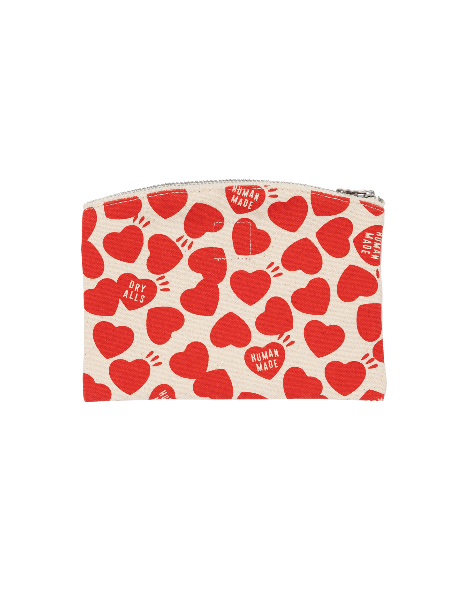 This bank pouch is made from durable cotton canvas and features a charming all-over heart print. Its rounded upper edges and flat design make it easy to slip into your pocket or bag for convenient carrying.