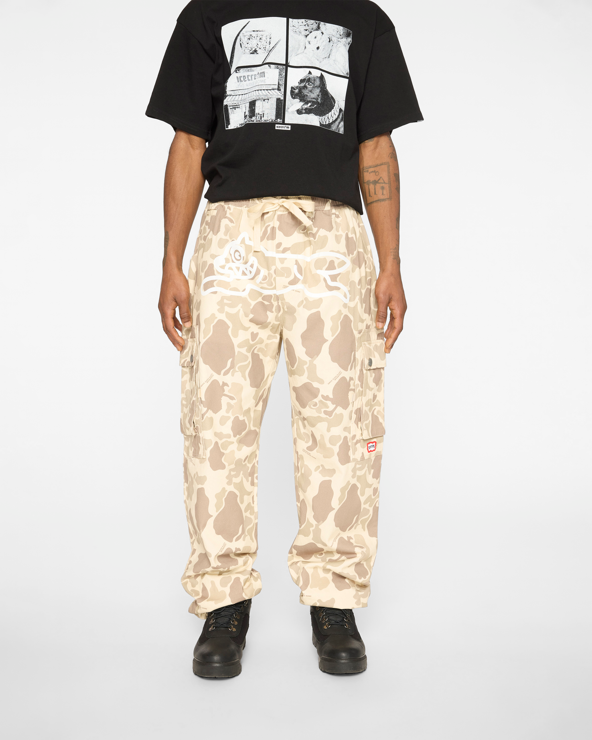 The Brush Cargo Pants feature a camo print, an adjustable waistband, and the Running Dog printed on the front crotch.