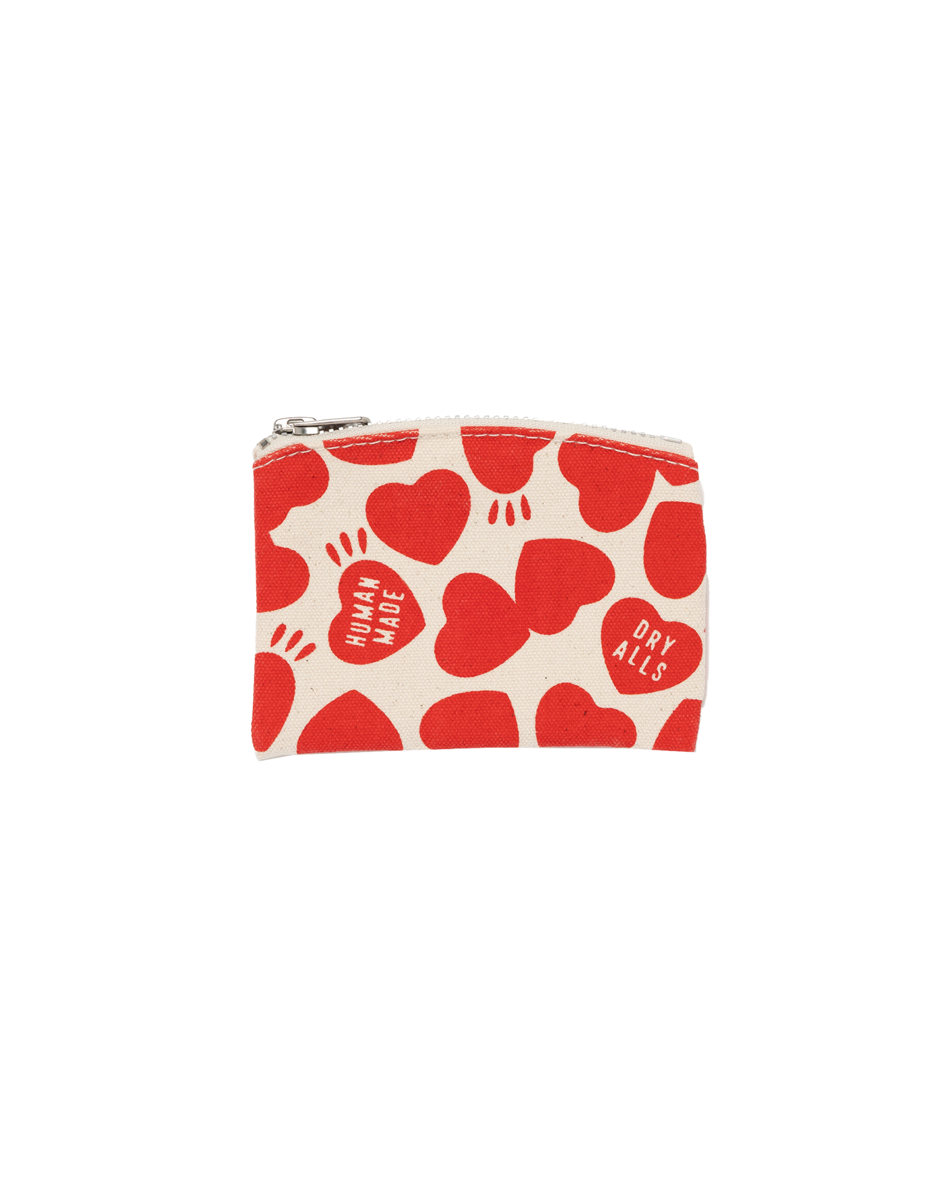 This card case is made from durable cotton canvas and showcases a charming all-over heart motif. Its rounded upper edges add a subtle touch of style, while the slim, flat design ensures it fits comfortably into your pocket for easy carrying.