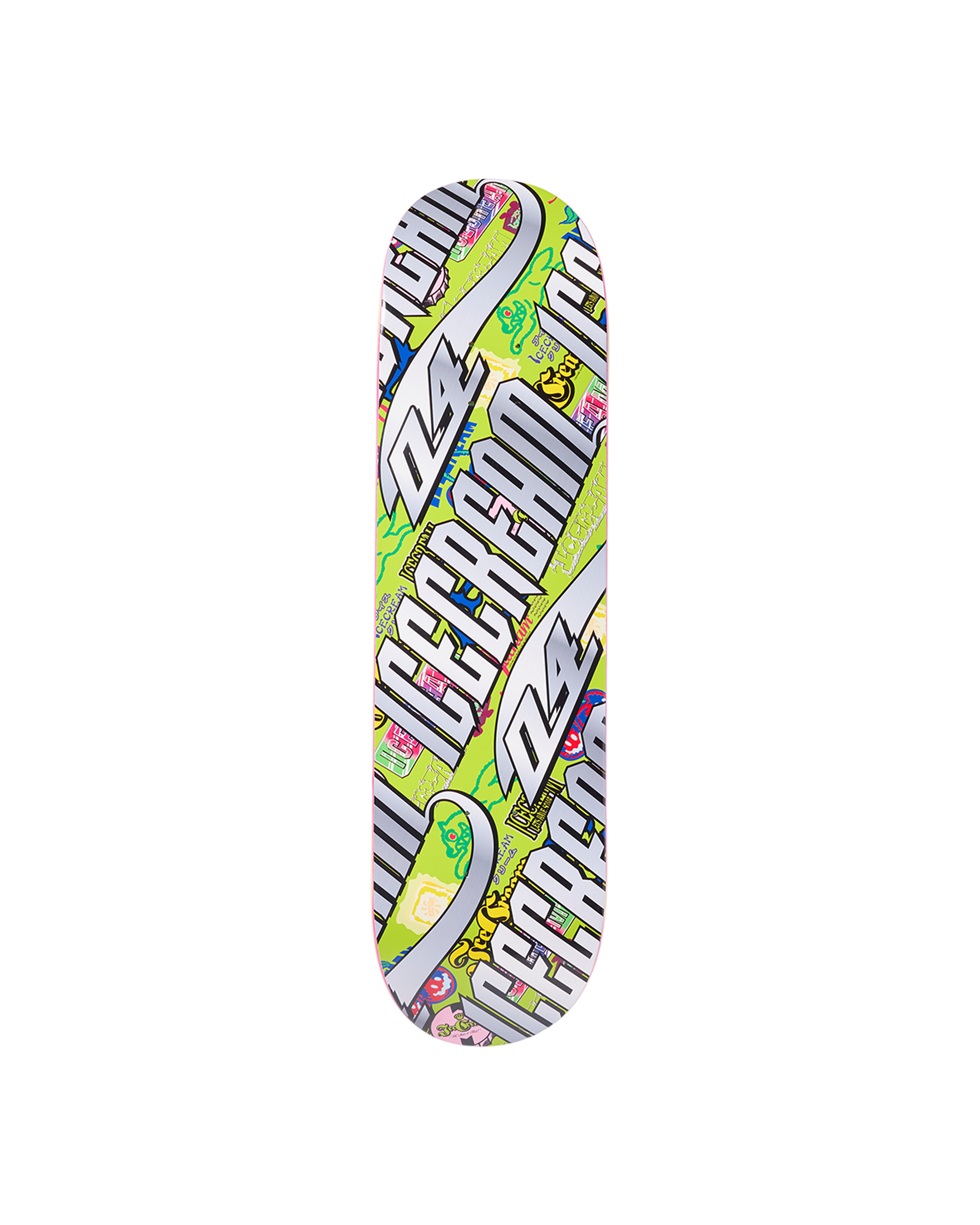 The Chrome Logo Aop Skate Deck showcases bright designs with vintage comic-inspired elements and the Icecream logo all over.