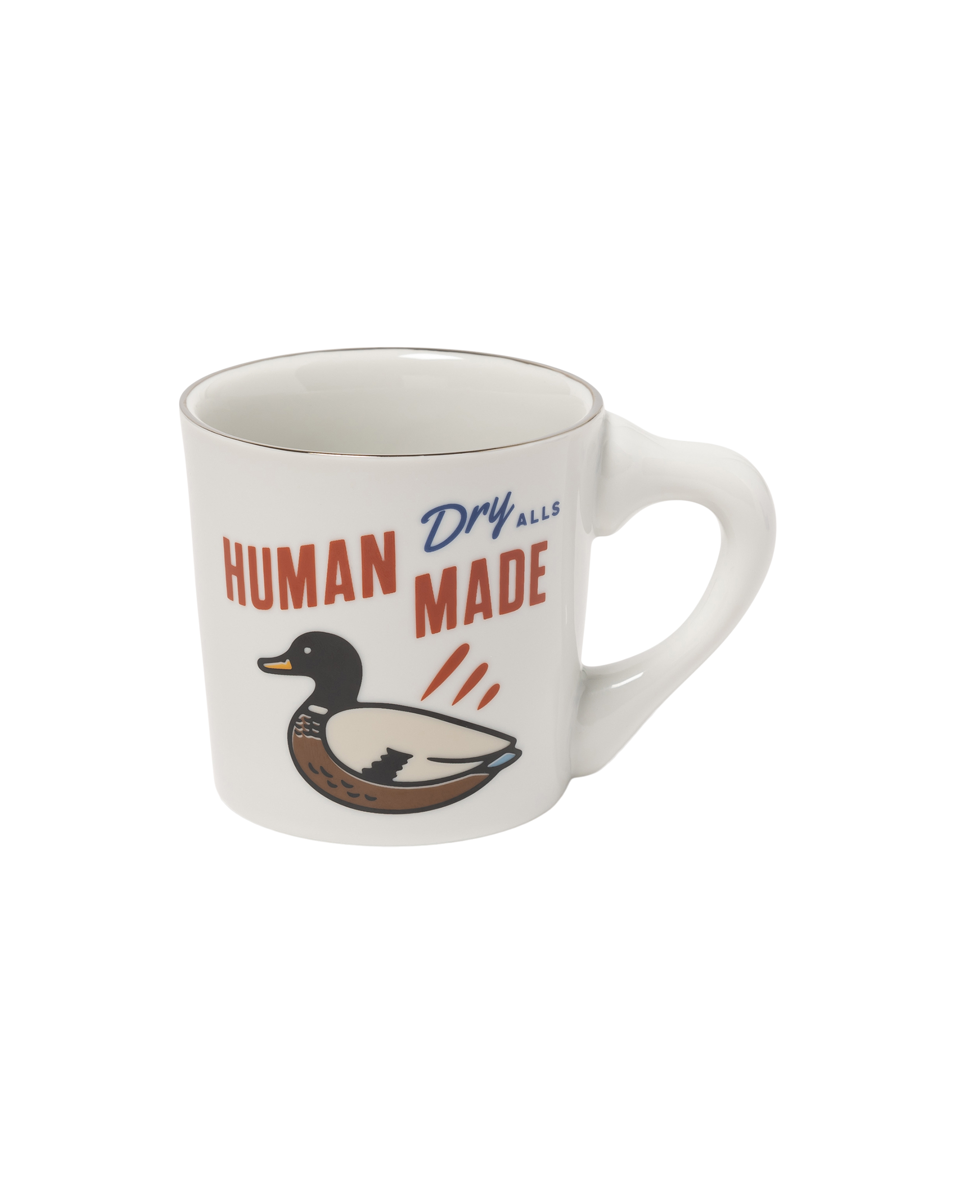 This coffee mug features a distinctive duck graphic alongside the Human Made heart logo.