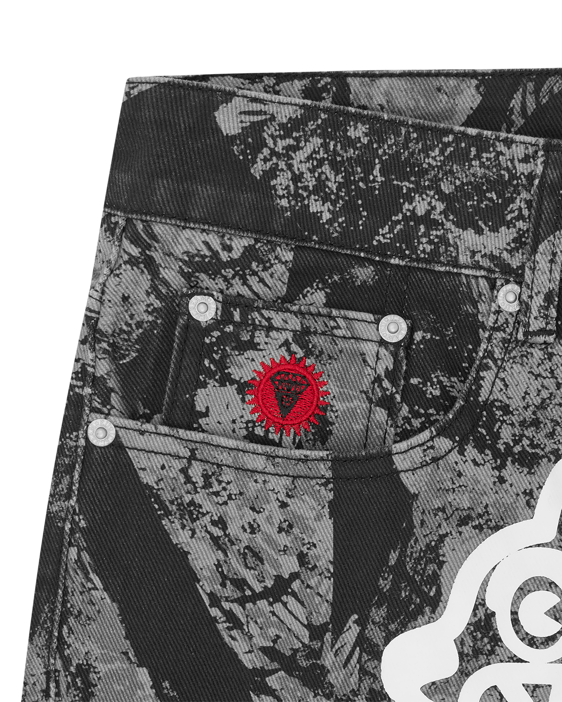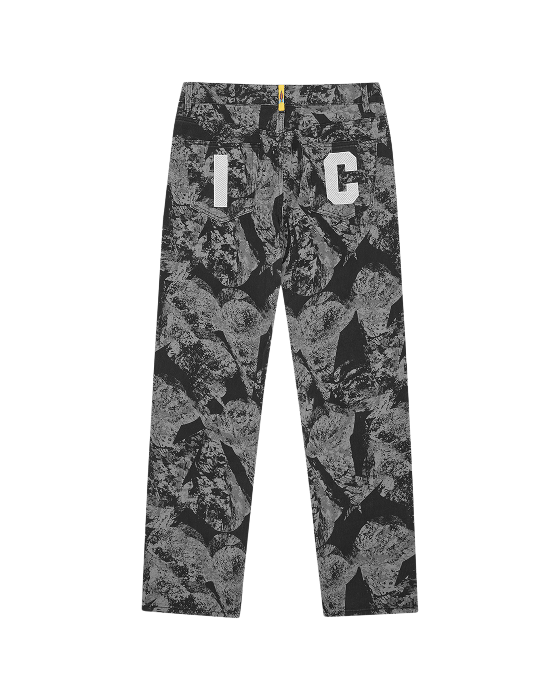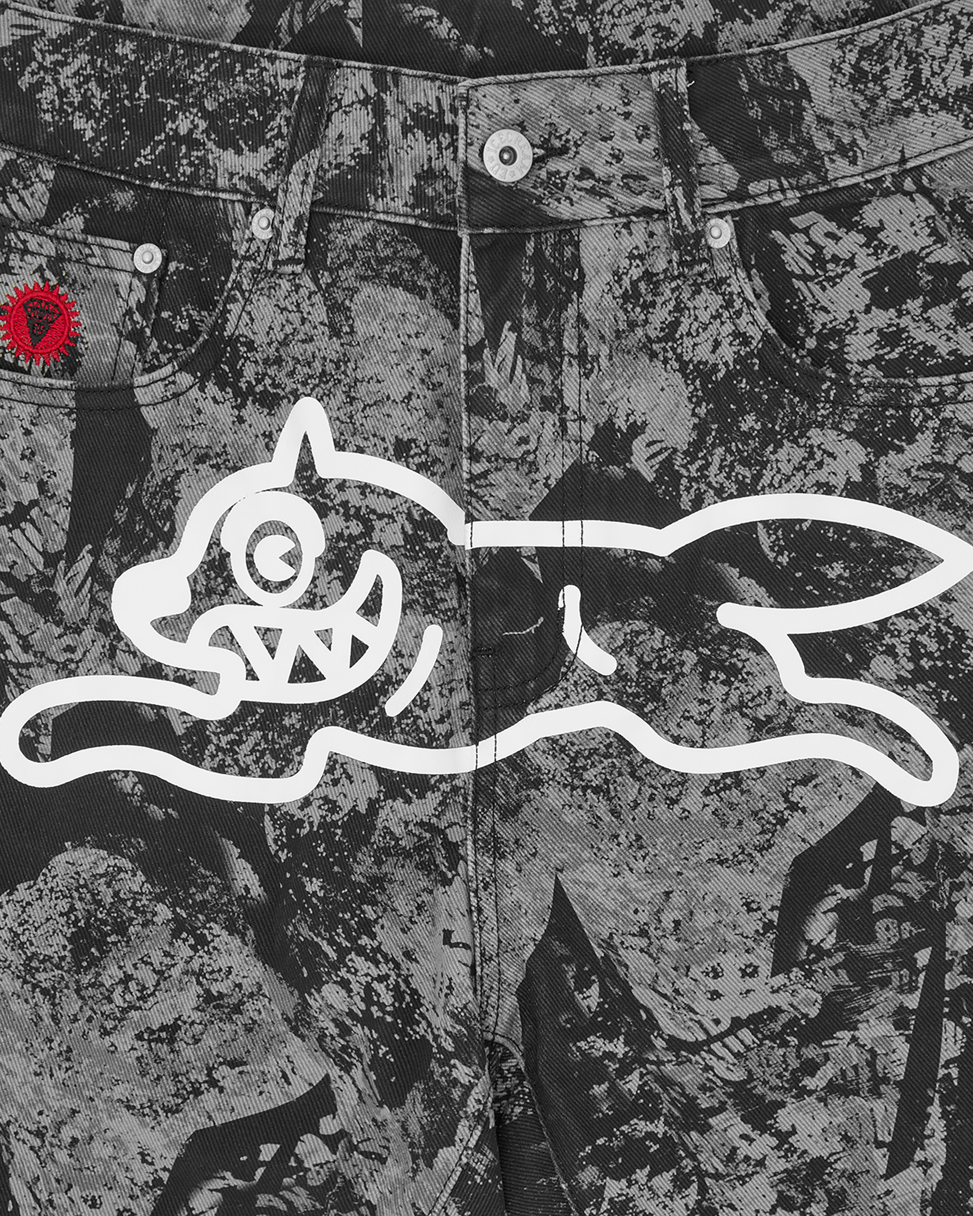 Cone Stamp Running Dog Denim Pants, feature an all-over soft hand cone stamp print, the screen-printed running dog graphic on the front, embroidered IC signet, embroidered "IC" lettering on the back pockets, and a zip-fastened fly.
