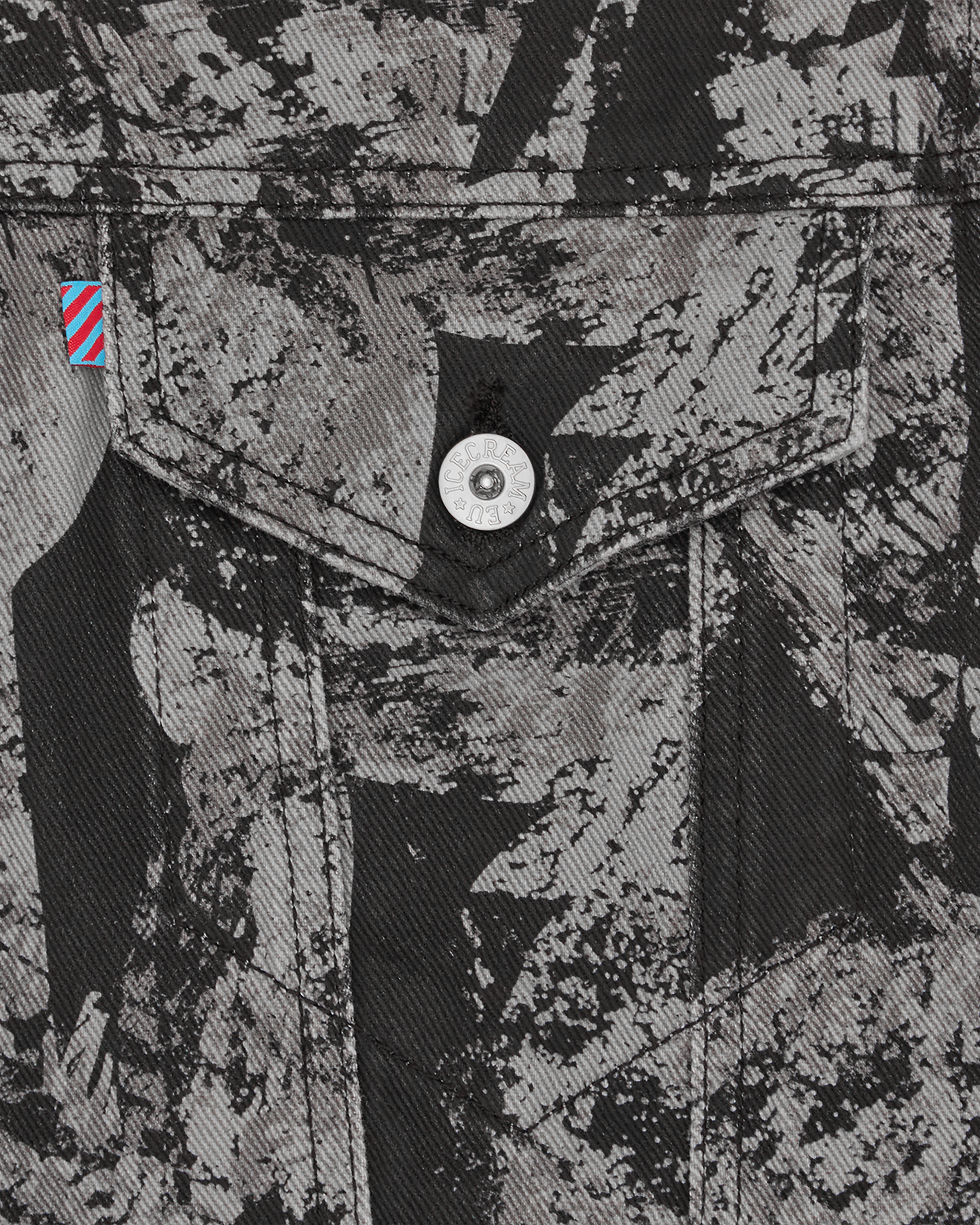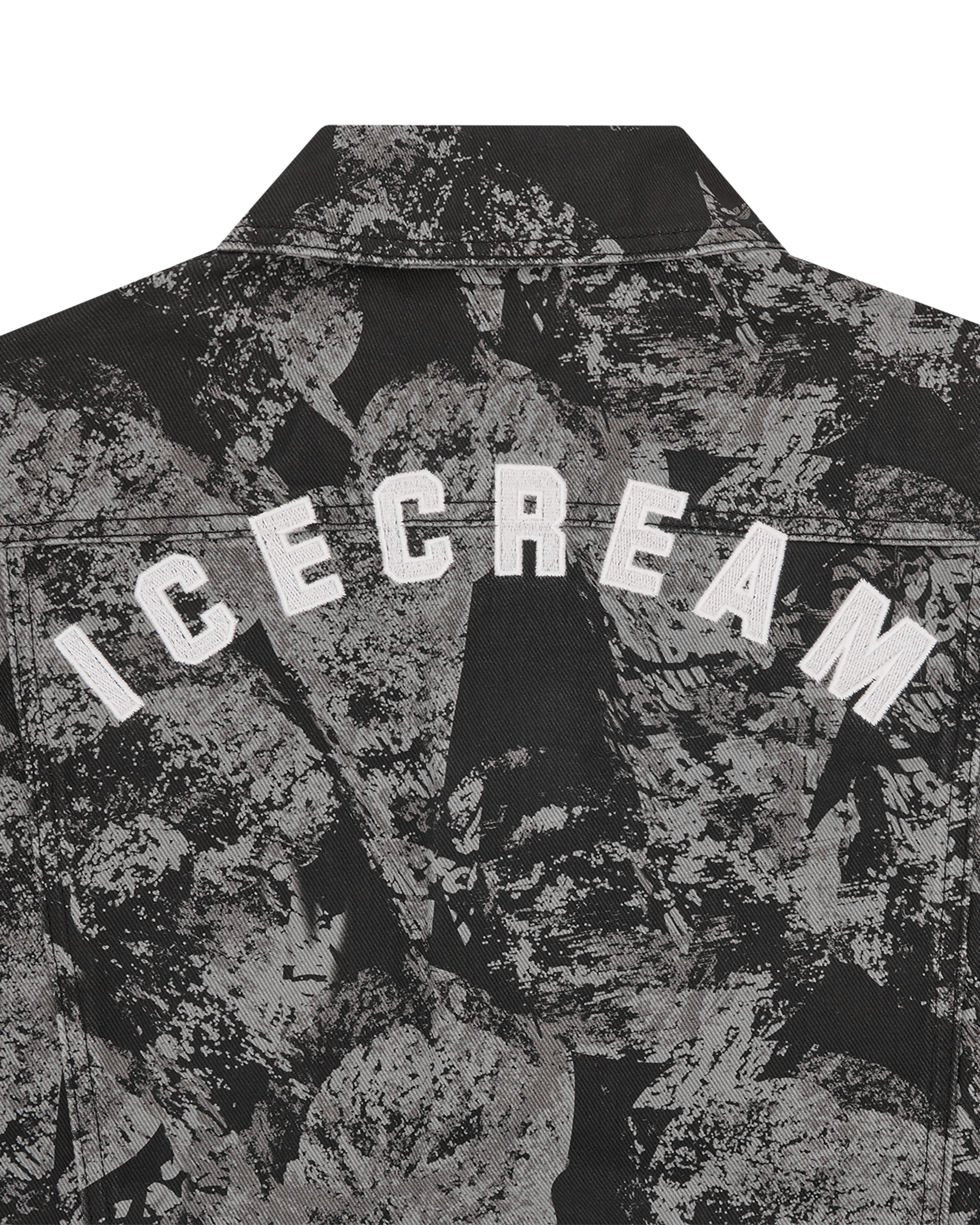 This Cone Stamp Denim Trucker Jacket utilises an all-over cone stamp tonal print on a grey denim and it presents the embroidered ICECREAM logo at the back.