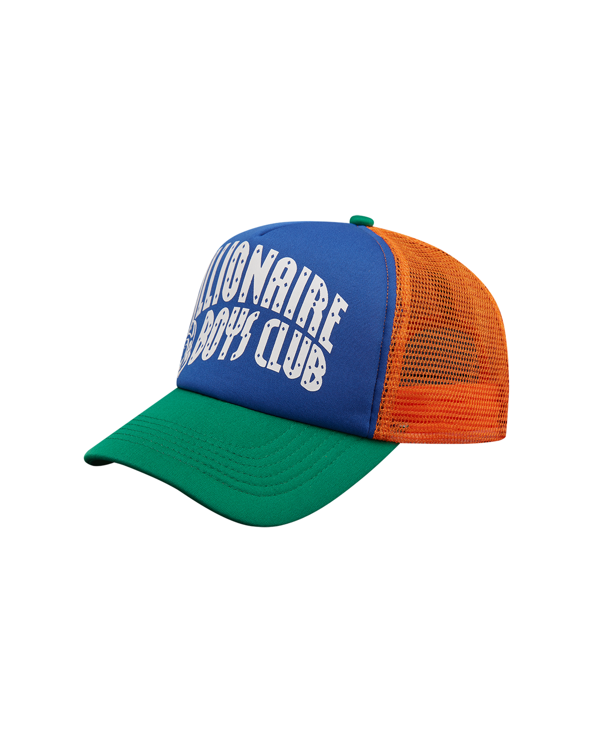Billionaire Boys Club Contrast Arch Logo Trucker Cap in bold colorblock design. Features a vibrant blue crown, green brim, and orange mesh back with the iconic arched BBC logo on the front. Breathable mesh panels keep you comfortable all day.