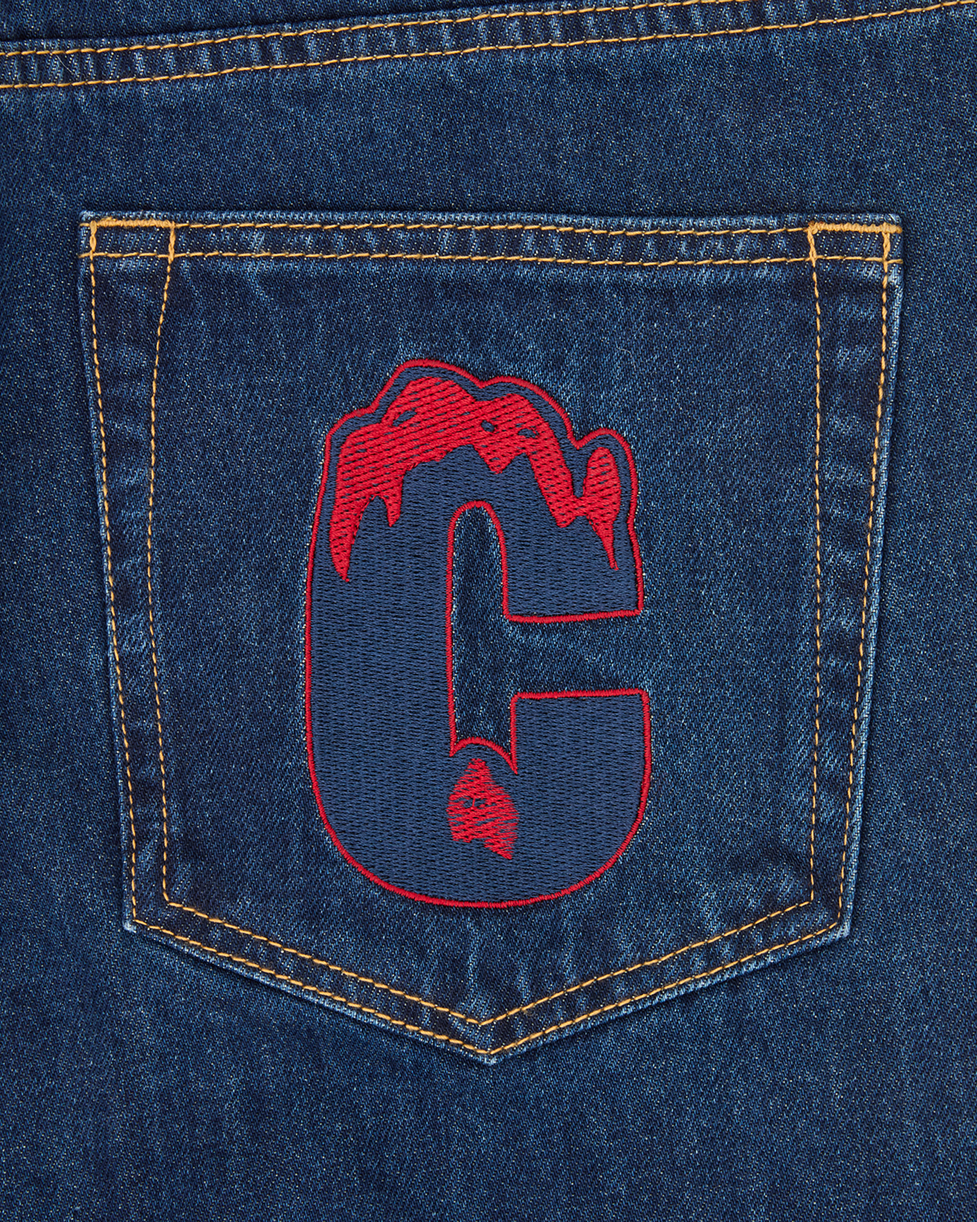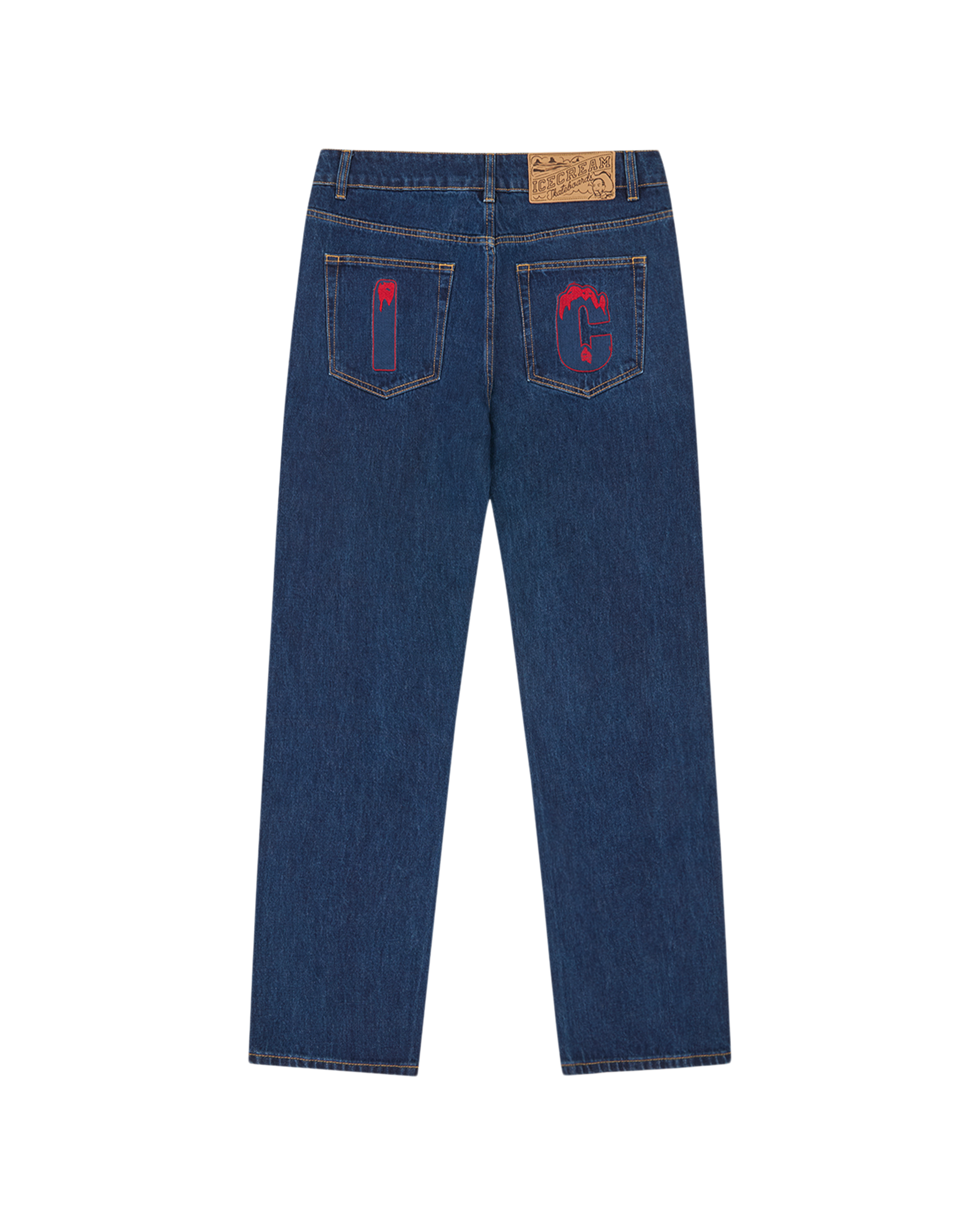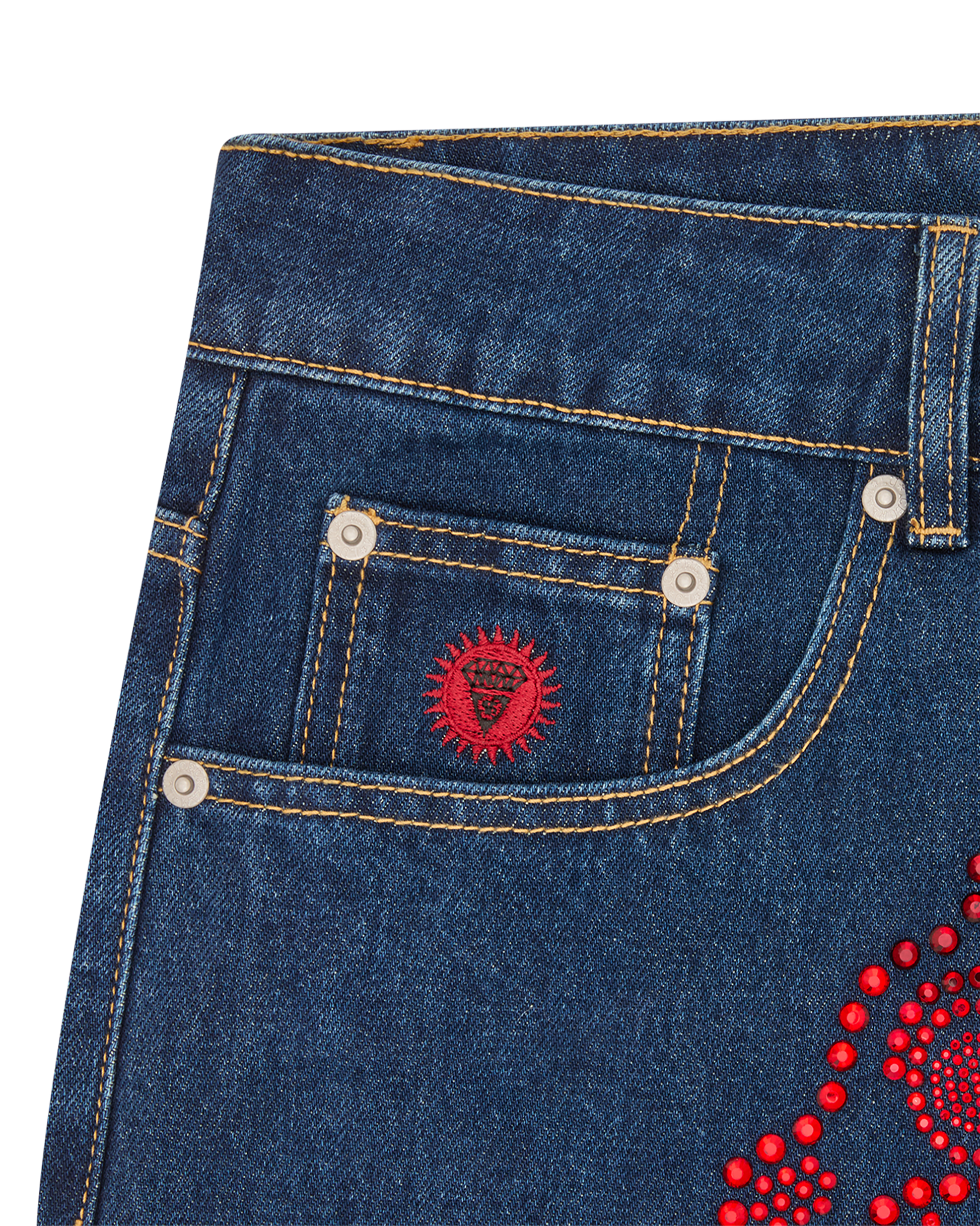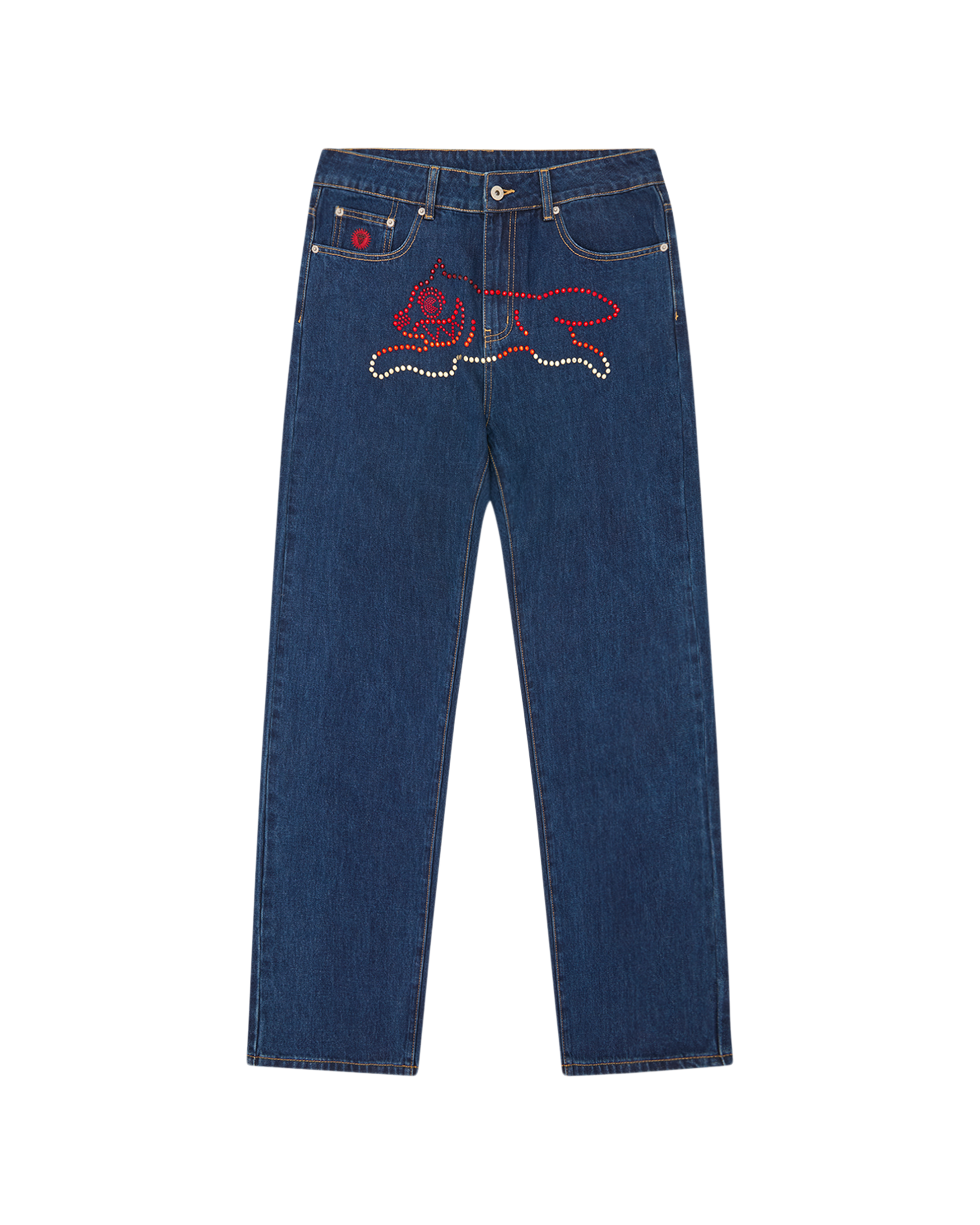 Crystal Running Dog Denim Pant features the iconic Running Dog in multi-colour crystal on the front, embroidered IC signet, embroidered "IC" lettering on the back pockets, and a zip-fastened fly. available.