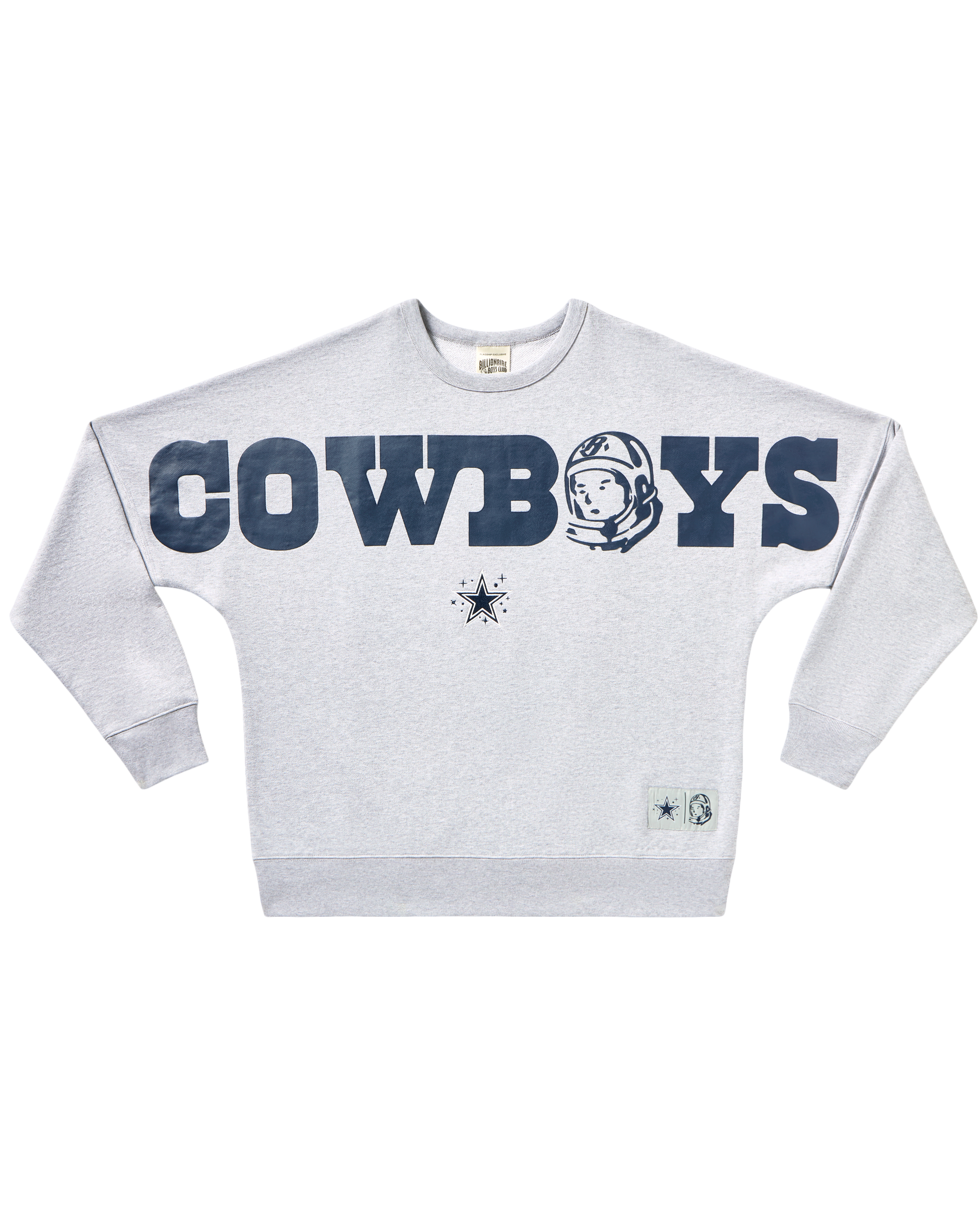Dallas Cowboys Crewneck with puff print logos on the front and back. Features the Cowboys logo, Helmet Head logo, Star, and Standing Astronaut logo.