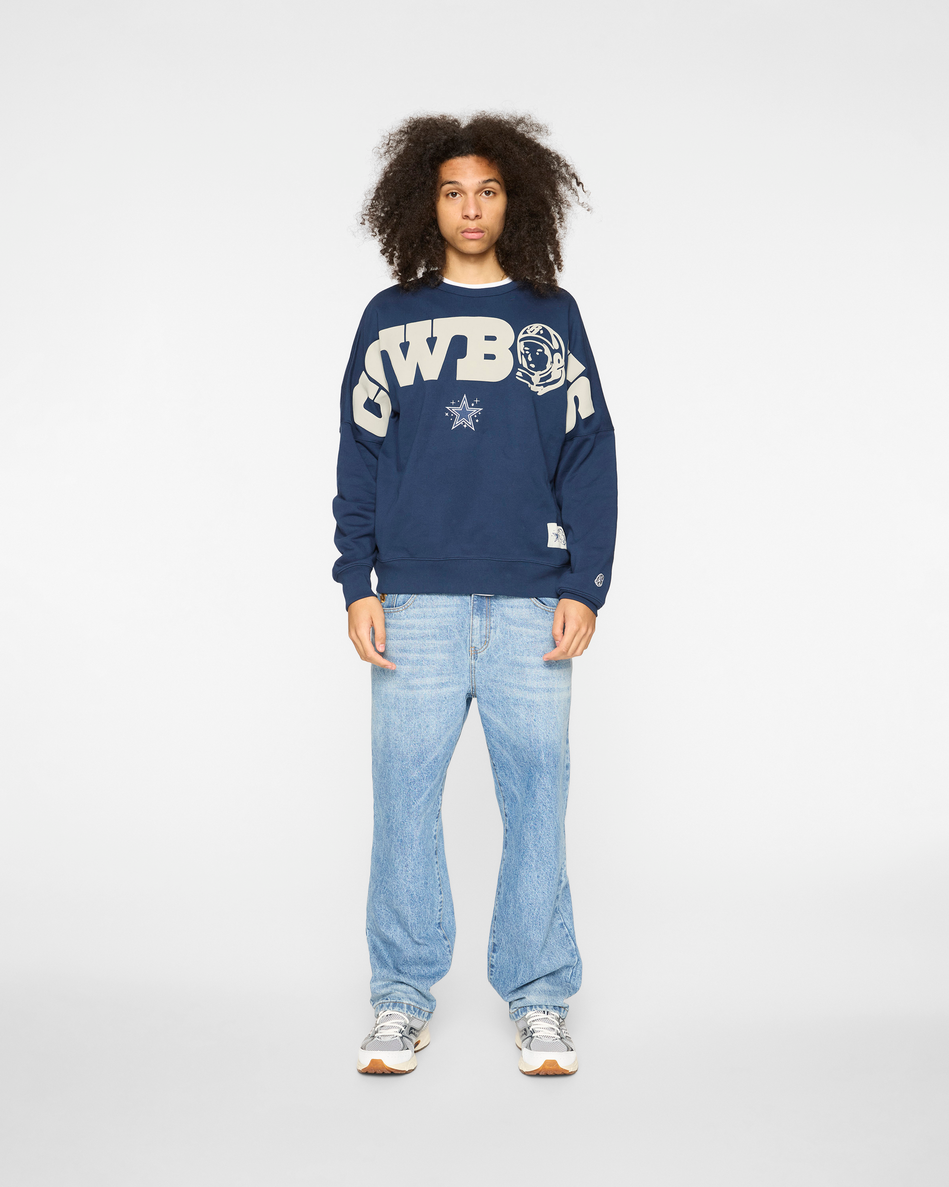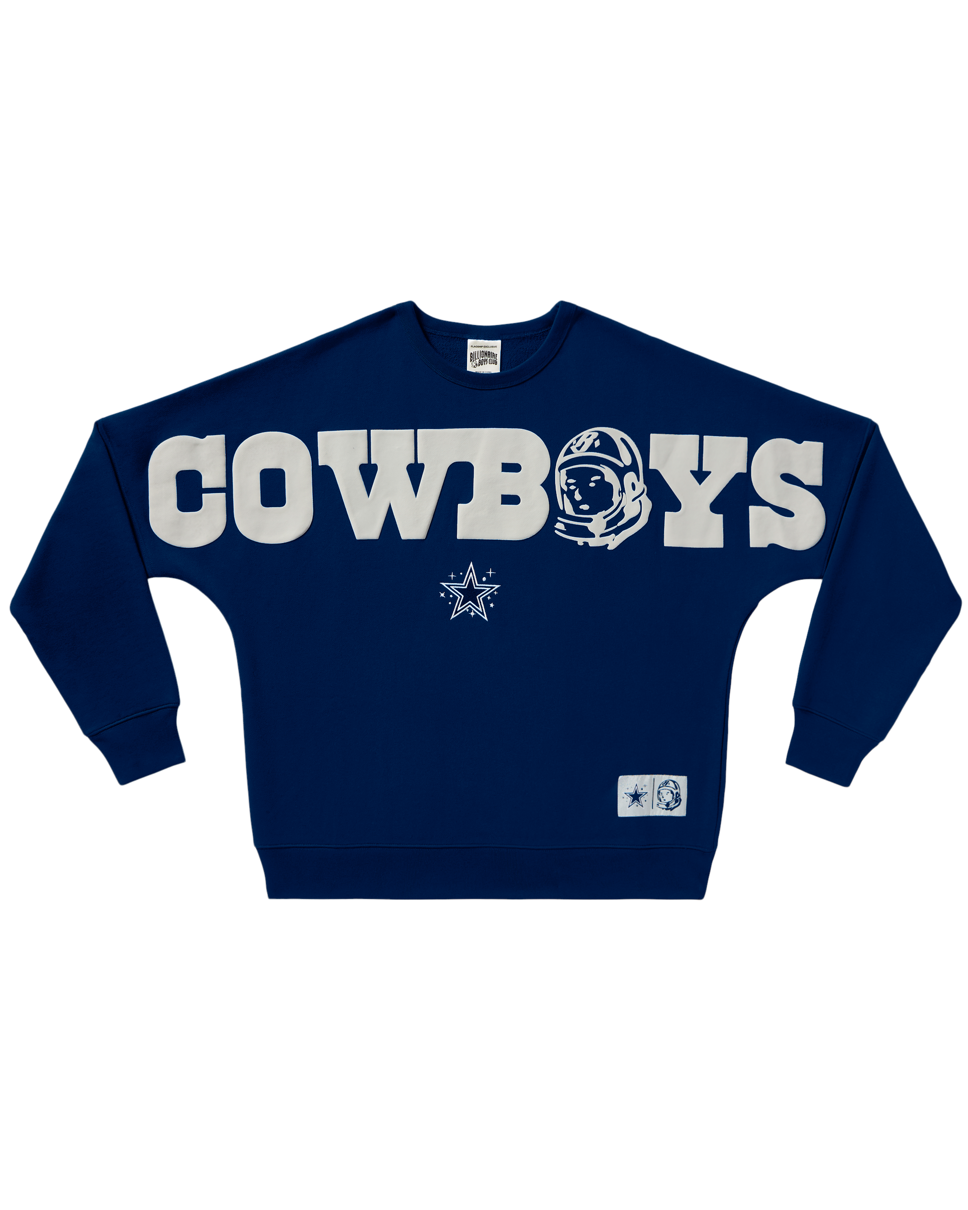 Dallas Cowboys Crewneck with puff print logos on the front and back. Features the Cowboys logo, Helmet Head logo, Star, and Standing Astronaut logo.
