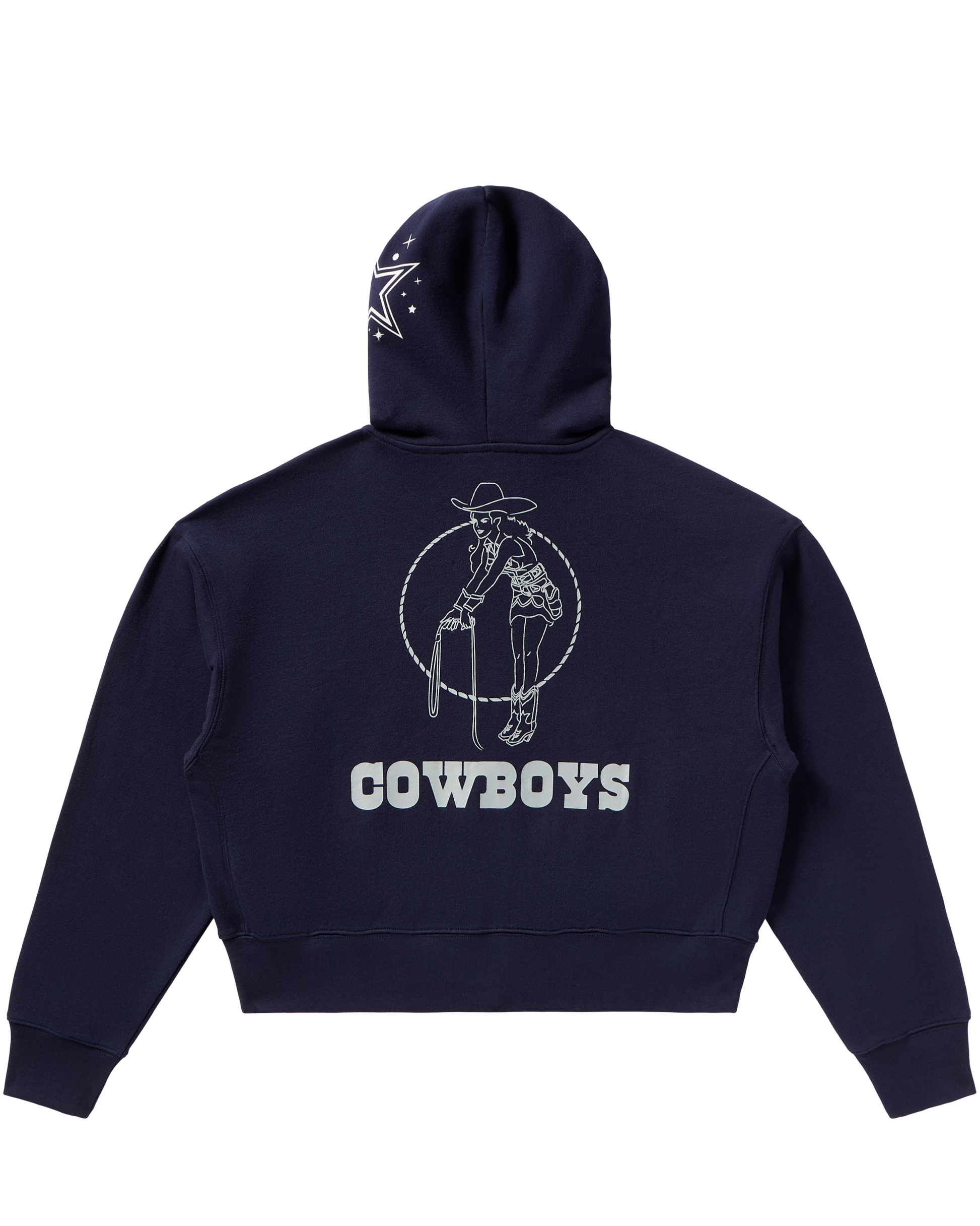 Dallas Cowboys Cropped Hoodie with zip closure and drawstring hood. Features a Billionaire Girls Club and a cowboy boot logo on the front, plus a cowgirl and "Cowboys" graphic on the back.
