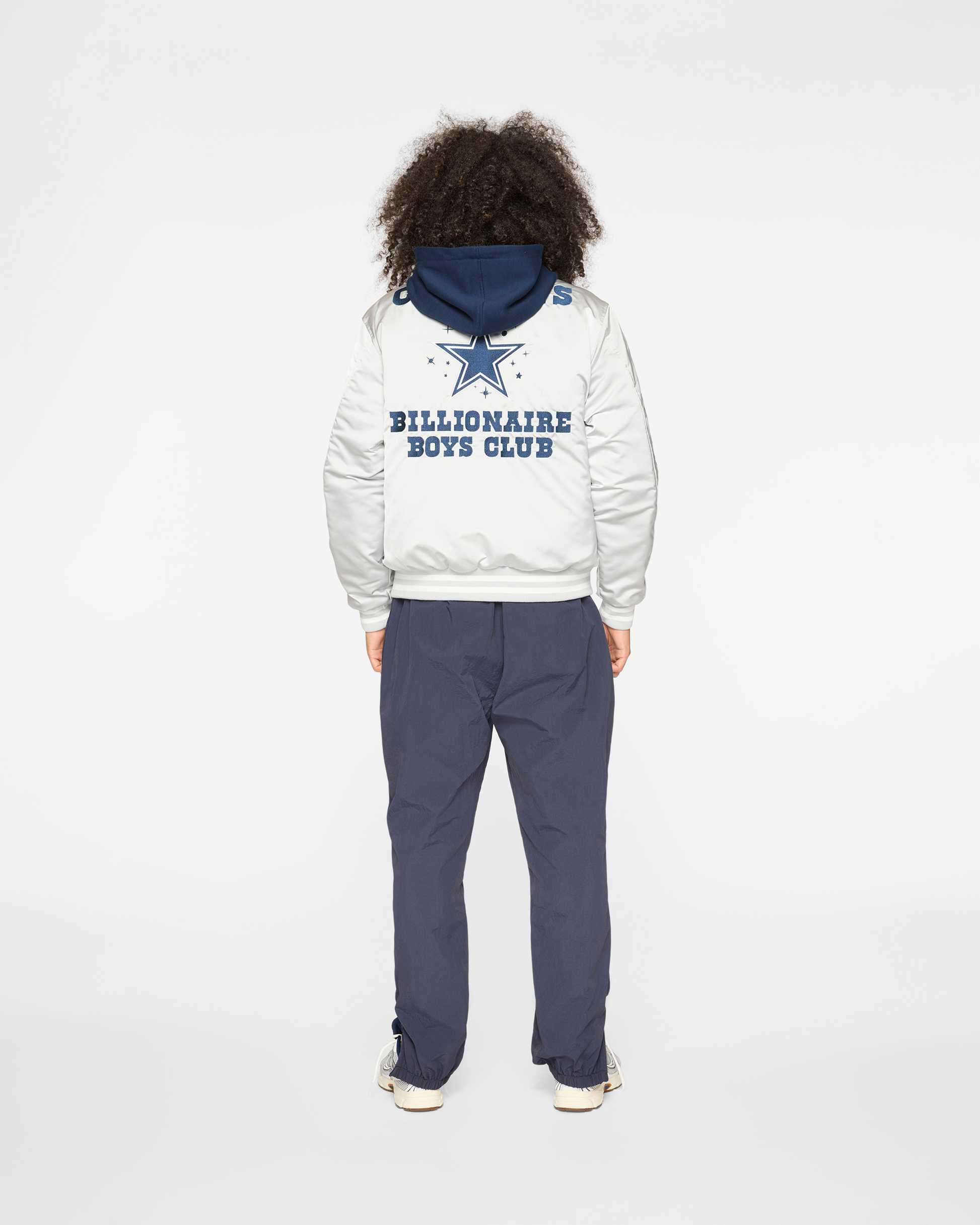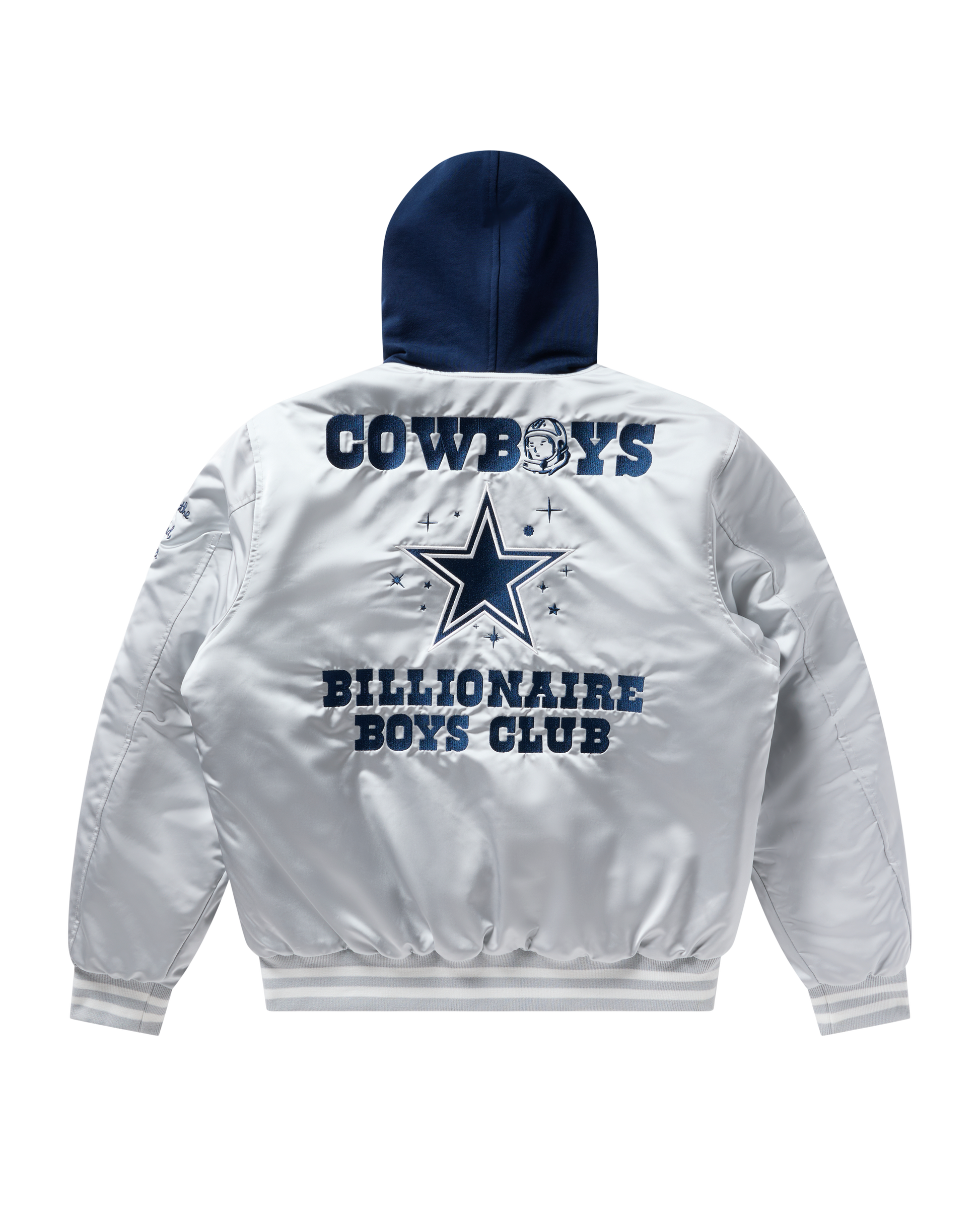 Dallas Cowboys Satin Jacket with snap closure, ribbed cuffs, and drawstring hood. Features embroidered Cowboys logo on front, championship years along sleeves, and the Cowboys x Billionaire Boys Club graphic on back.