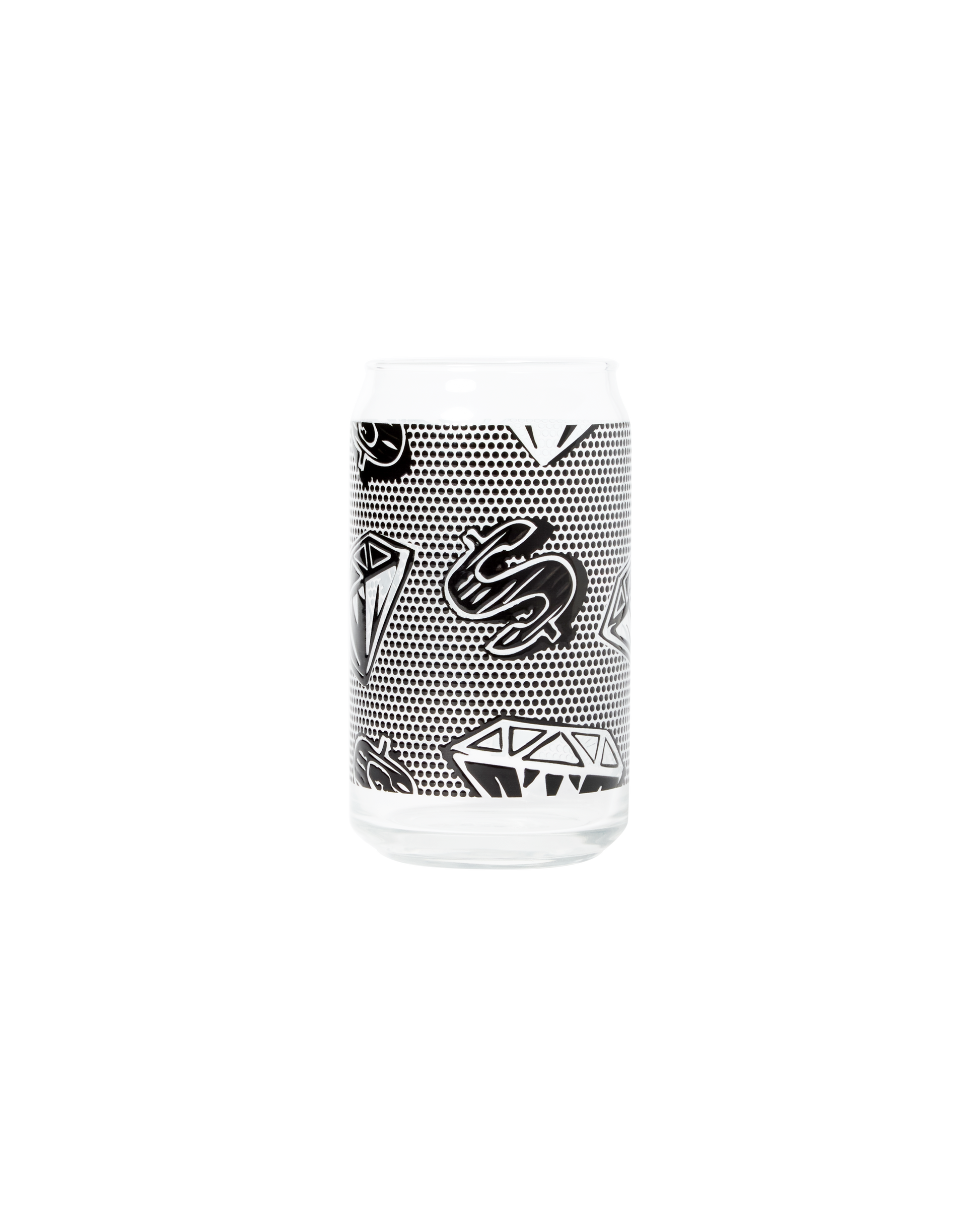 The Diamonds & Dollars Soda Can Glass features a repeat print of the Diamonds & Dollars pattern.