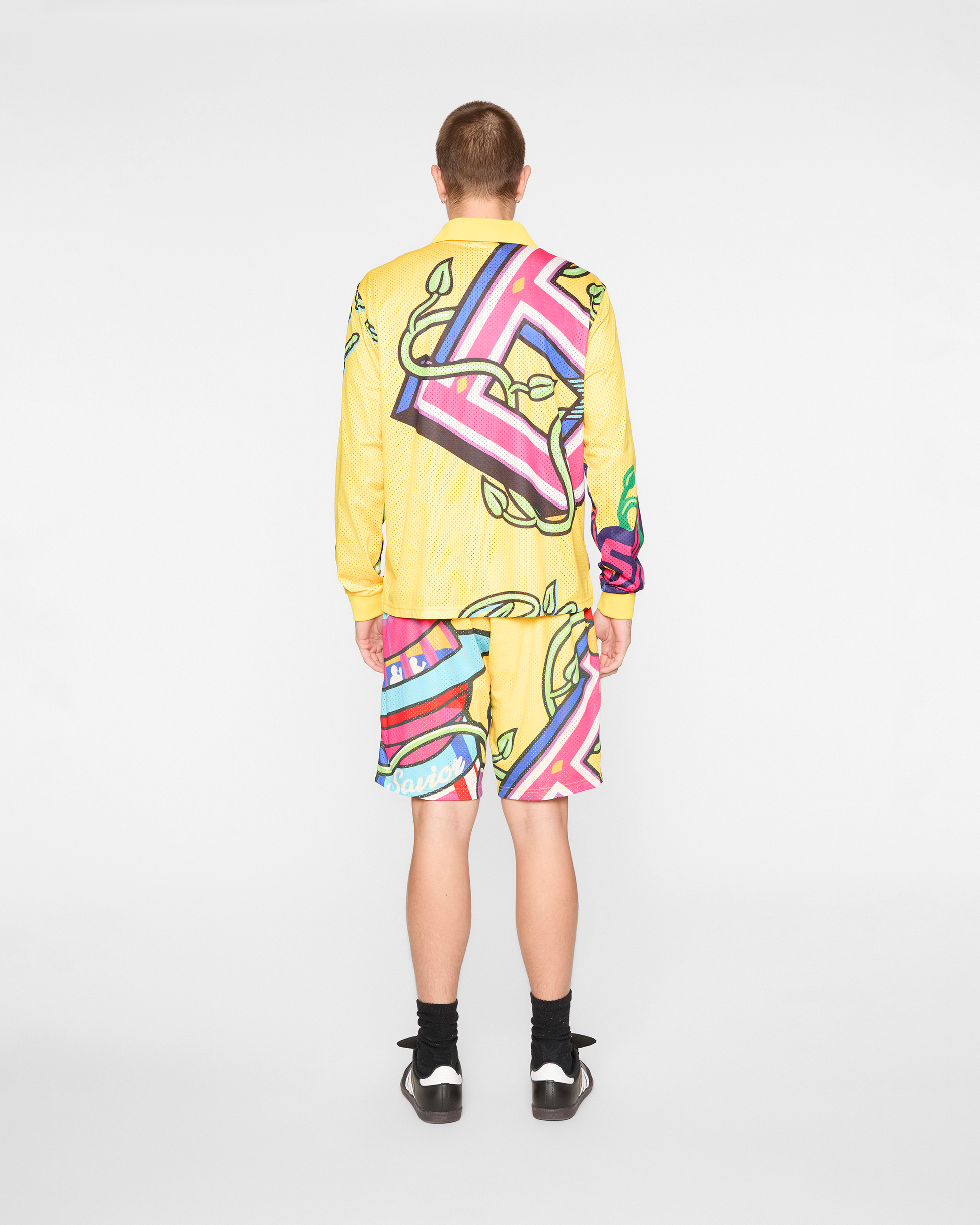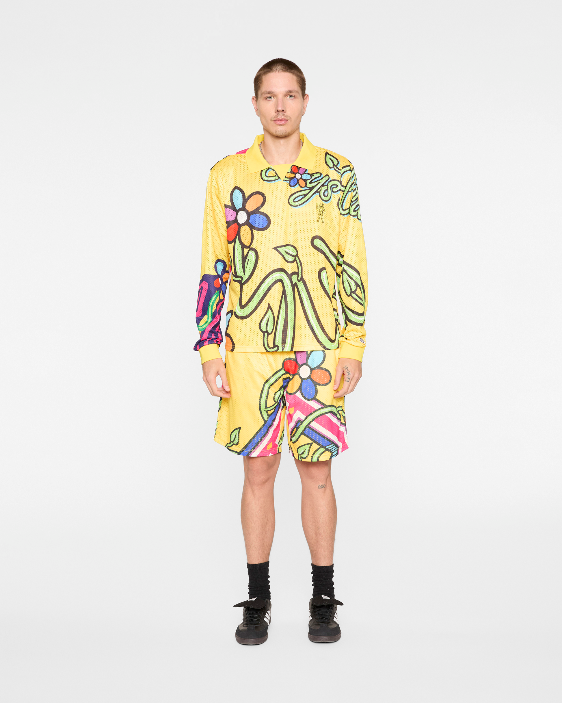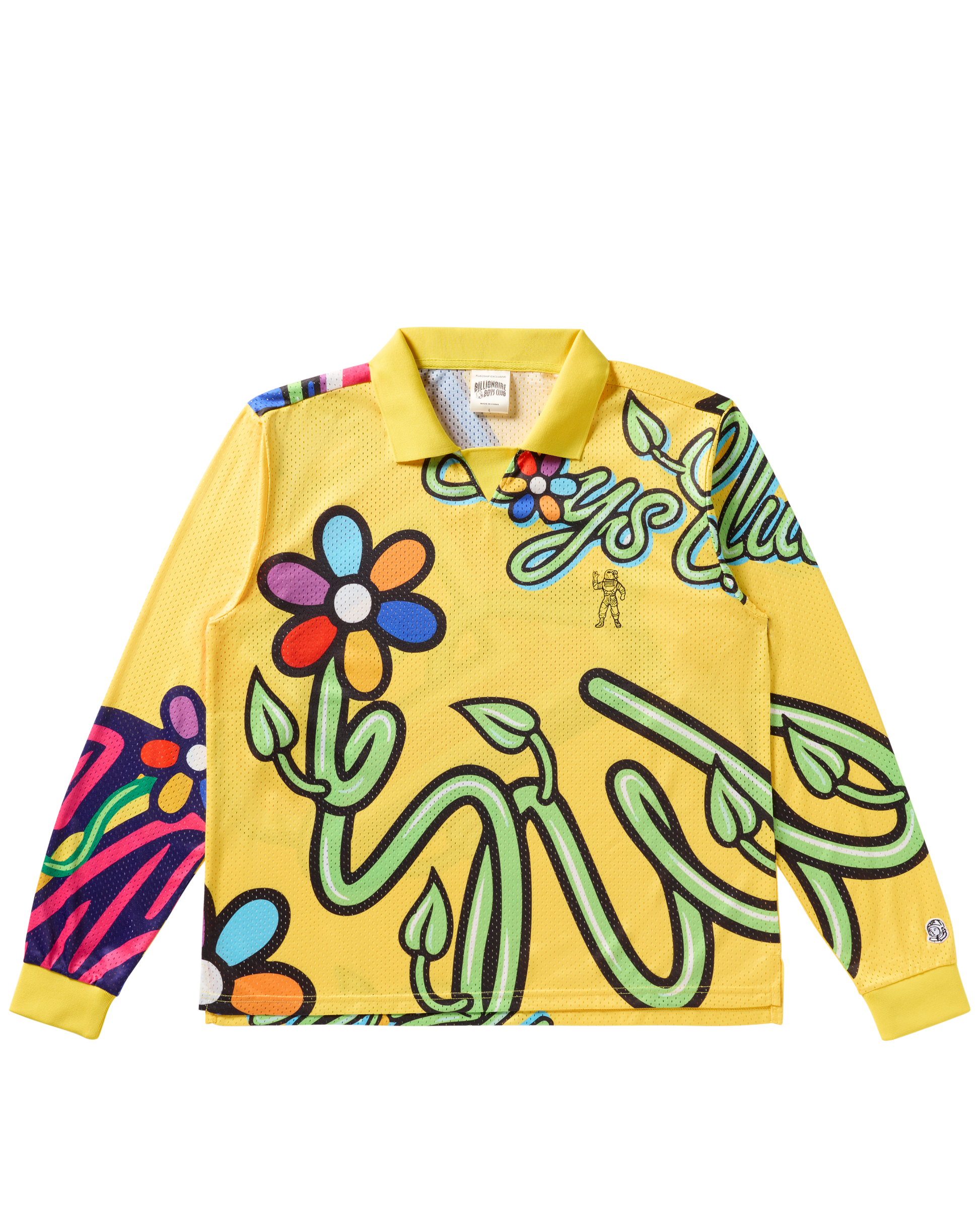 Futbol Jersey features a bright yellow base covered in Jae Tips' classic multicolored floral and vine artwork, along with the classic BBC logos and a Standing Astronaut on the front left chest.