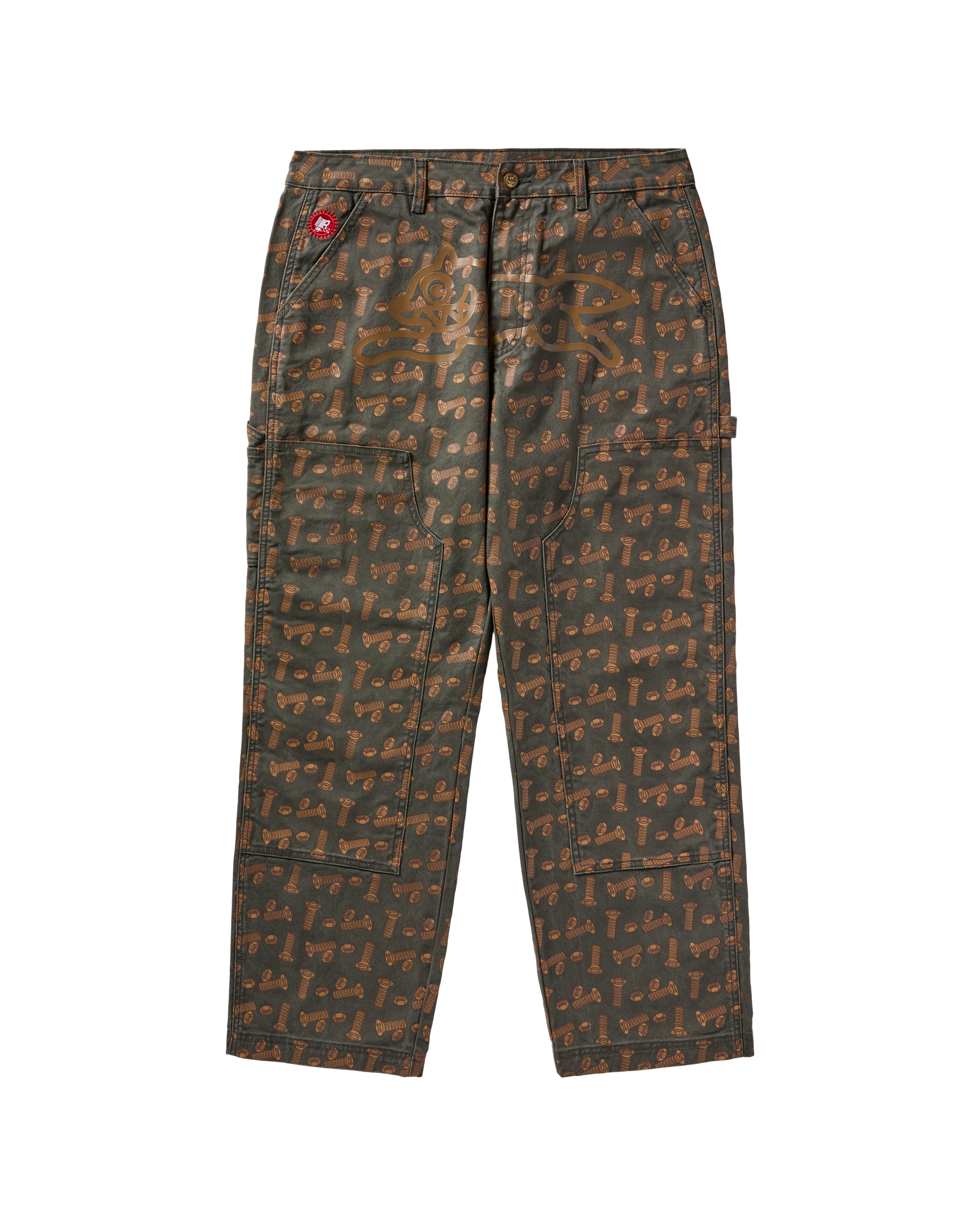 ICECREAM x BRONZE 56K Hardware Carpenter Pants feature an all-over screw graphic print with the classic running dog artwork at front thigh.