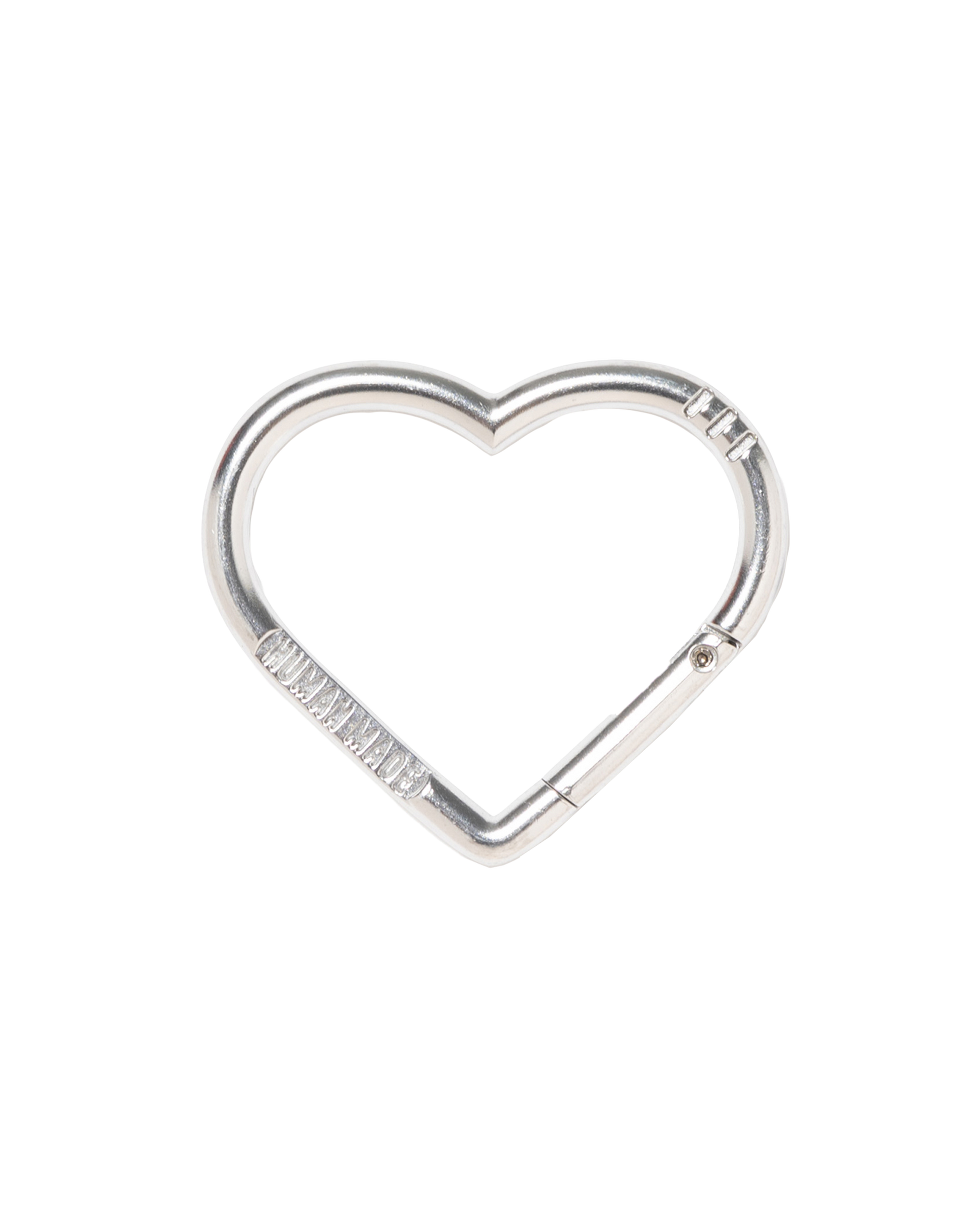 A heart-shaped carabiner featuring engraved text on each side.
