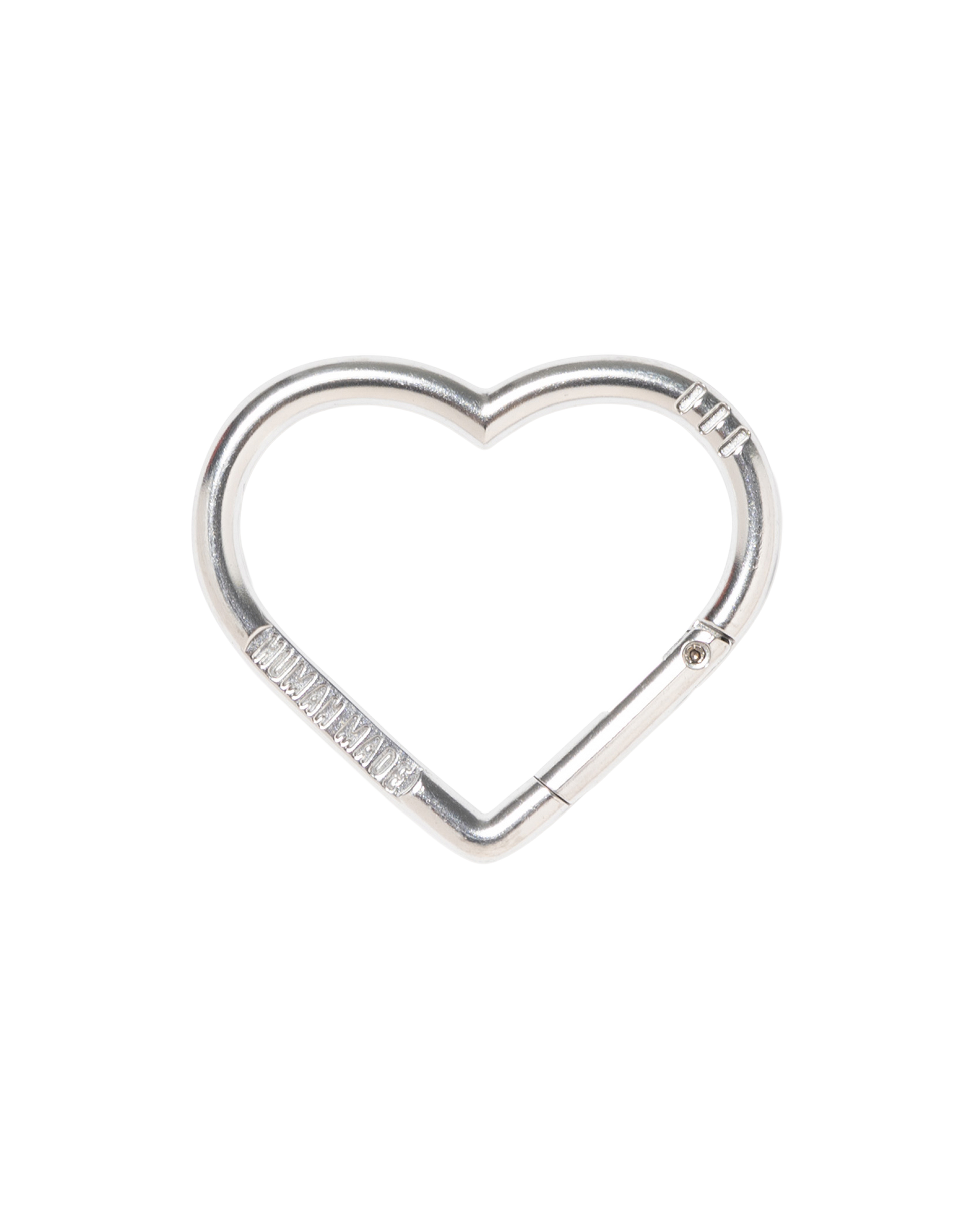 A heart-shaped carabiner featuring engraved text on each side.