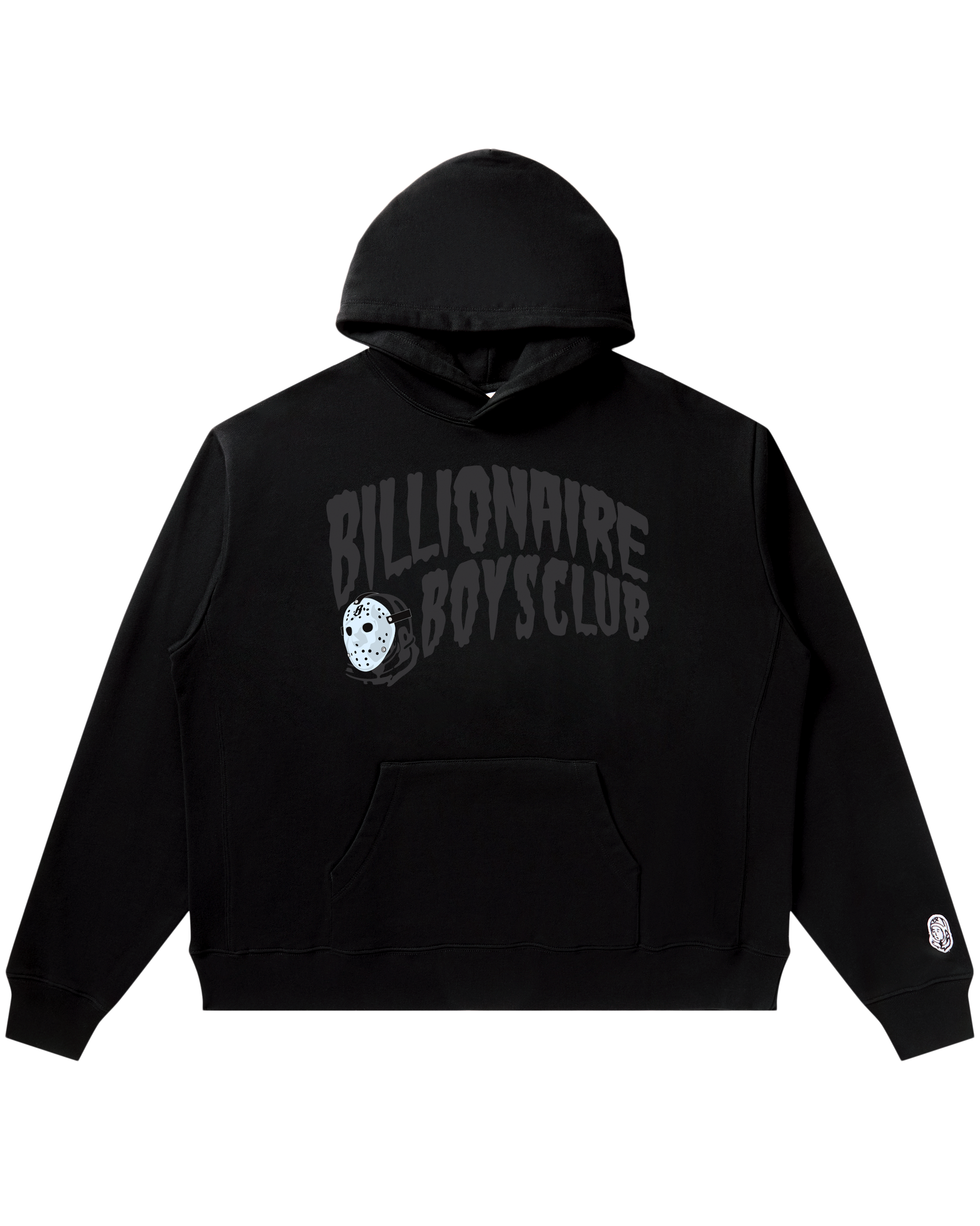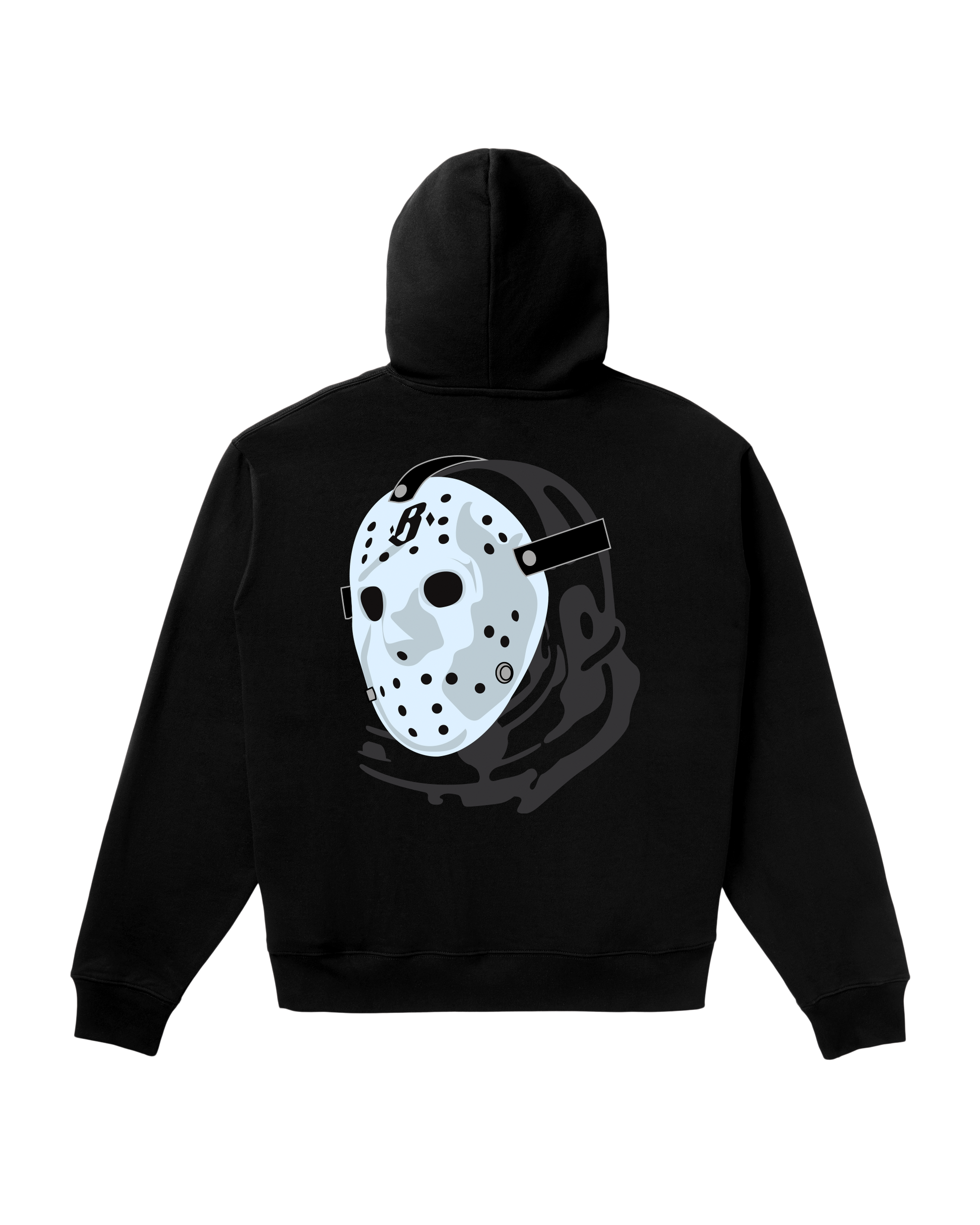 Pullover hoodie featuring a bold screen-printed hockey mask graphic at the front, complemented by embroidery patch detailing at the sleeve.