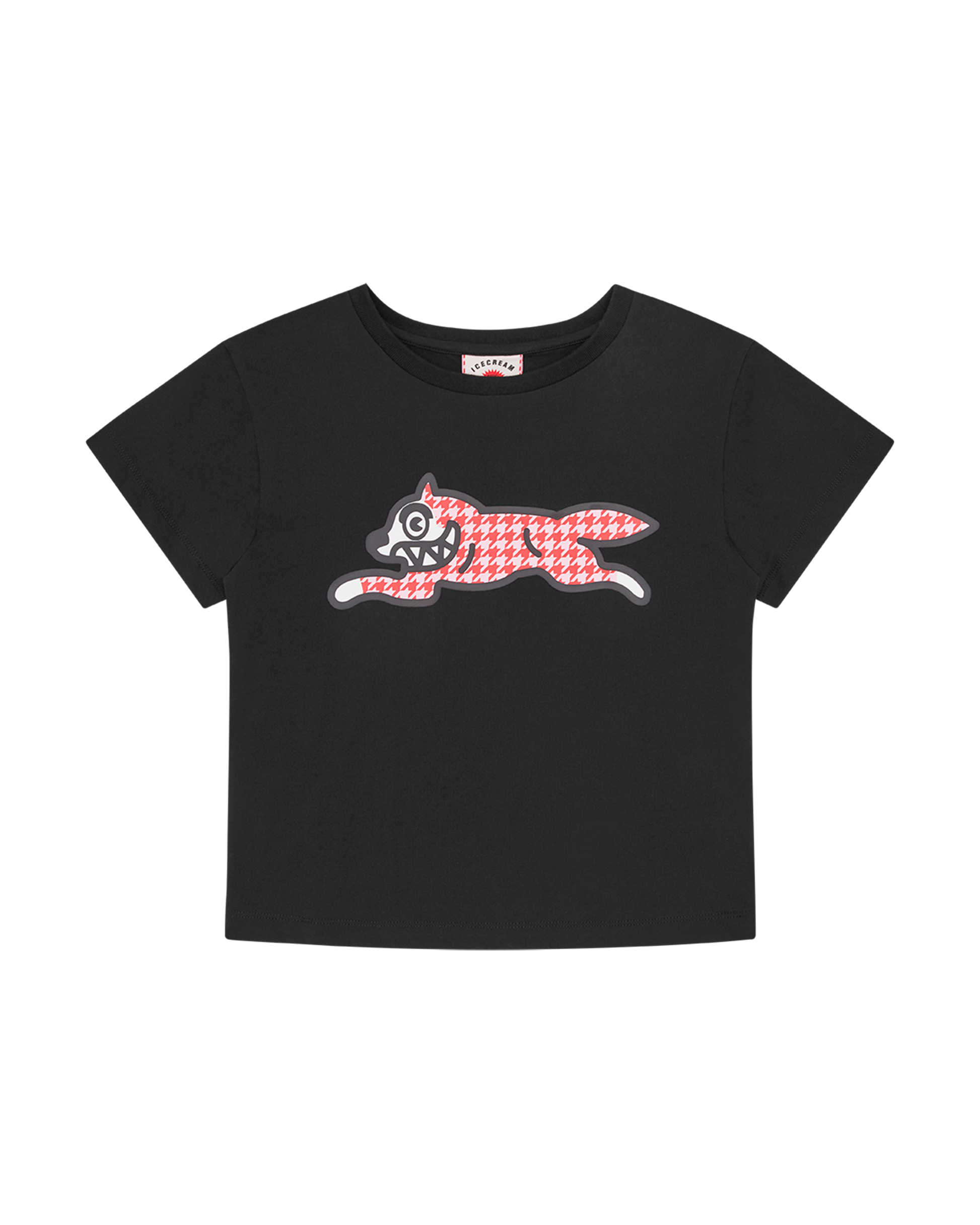 Houndstooth Running Dog Baby Tee coming with the signature Running Dog graphic houndstooth-filled on the chest. Baby tee fit.