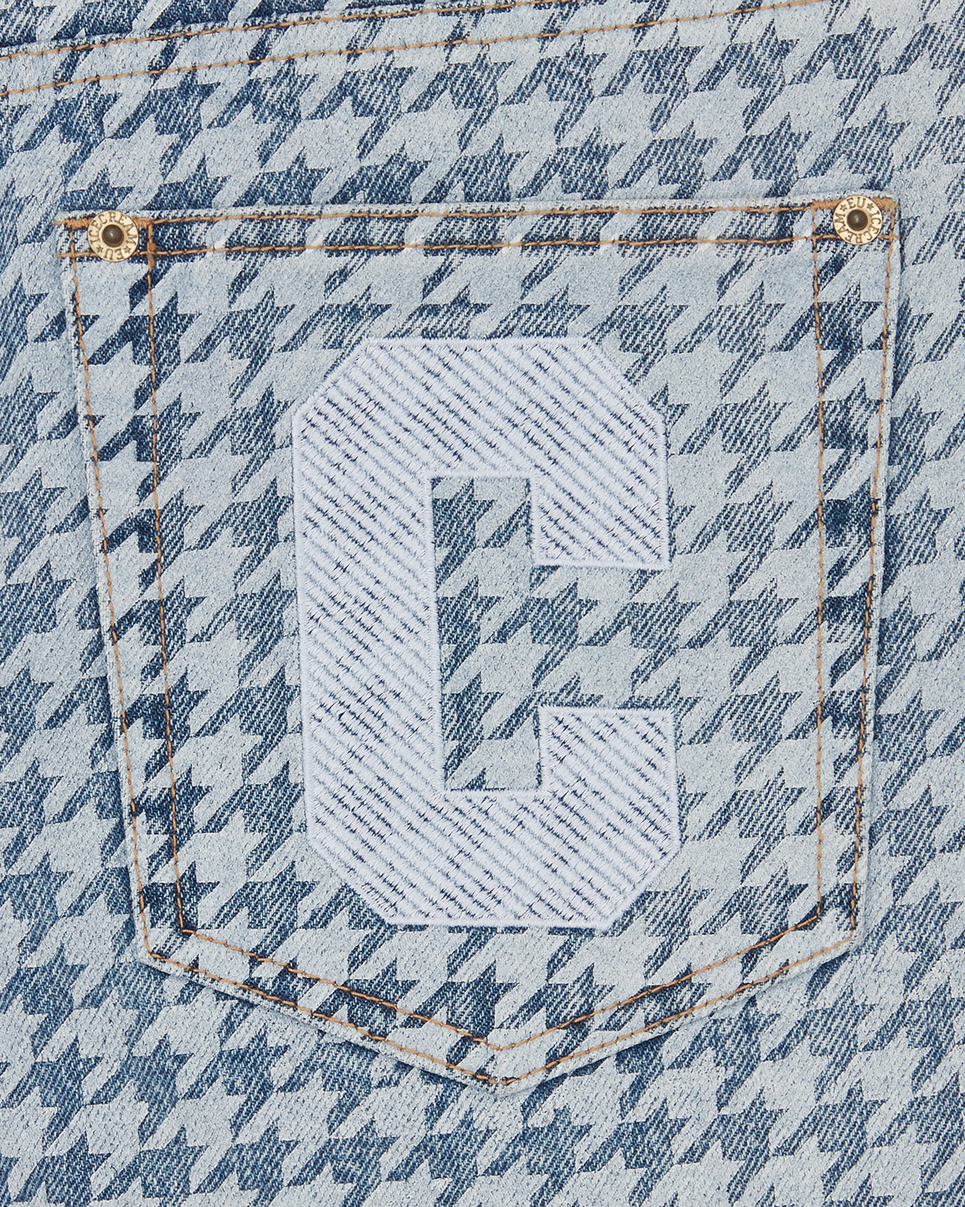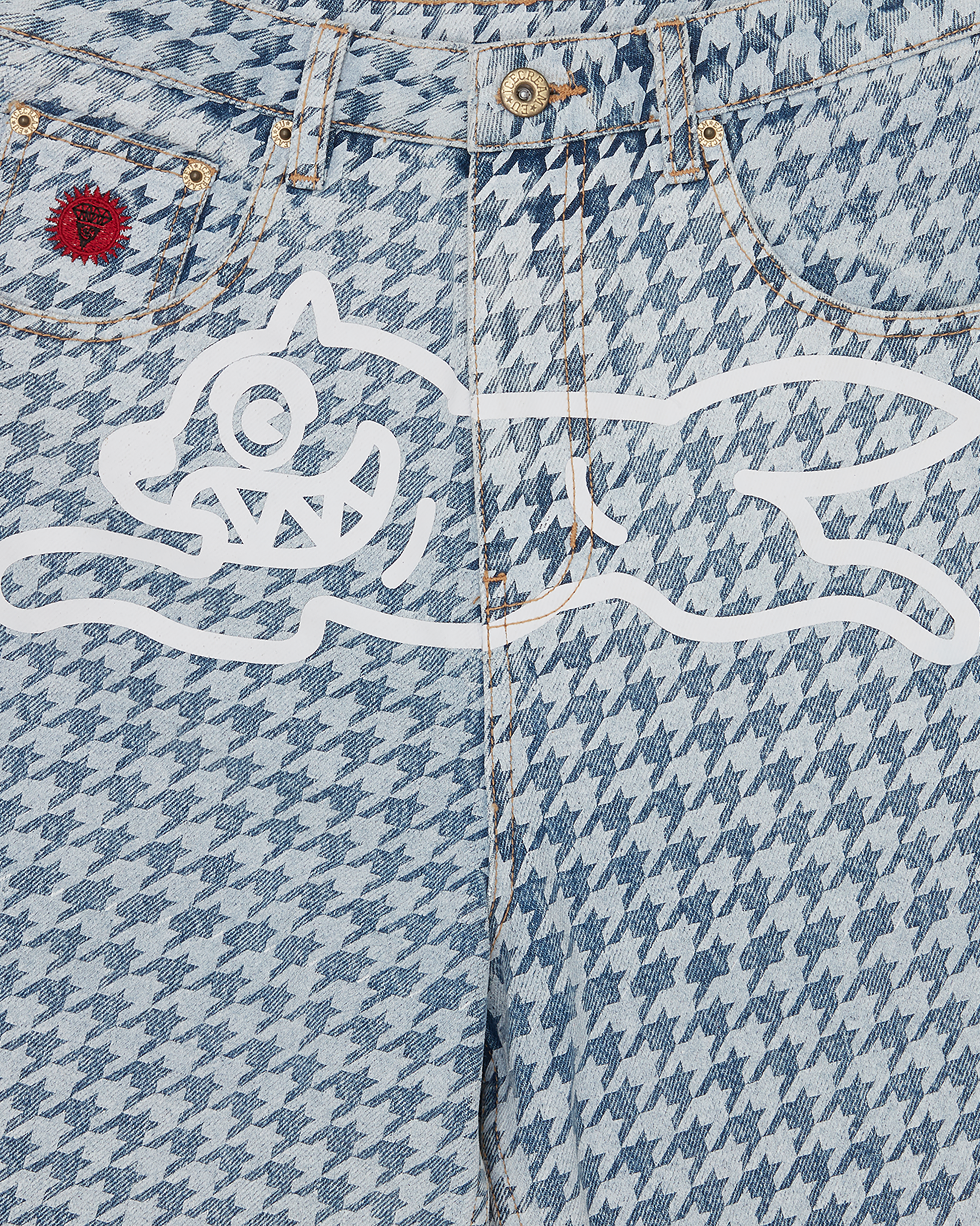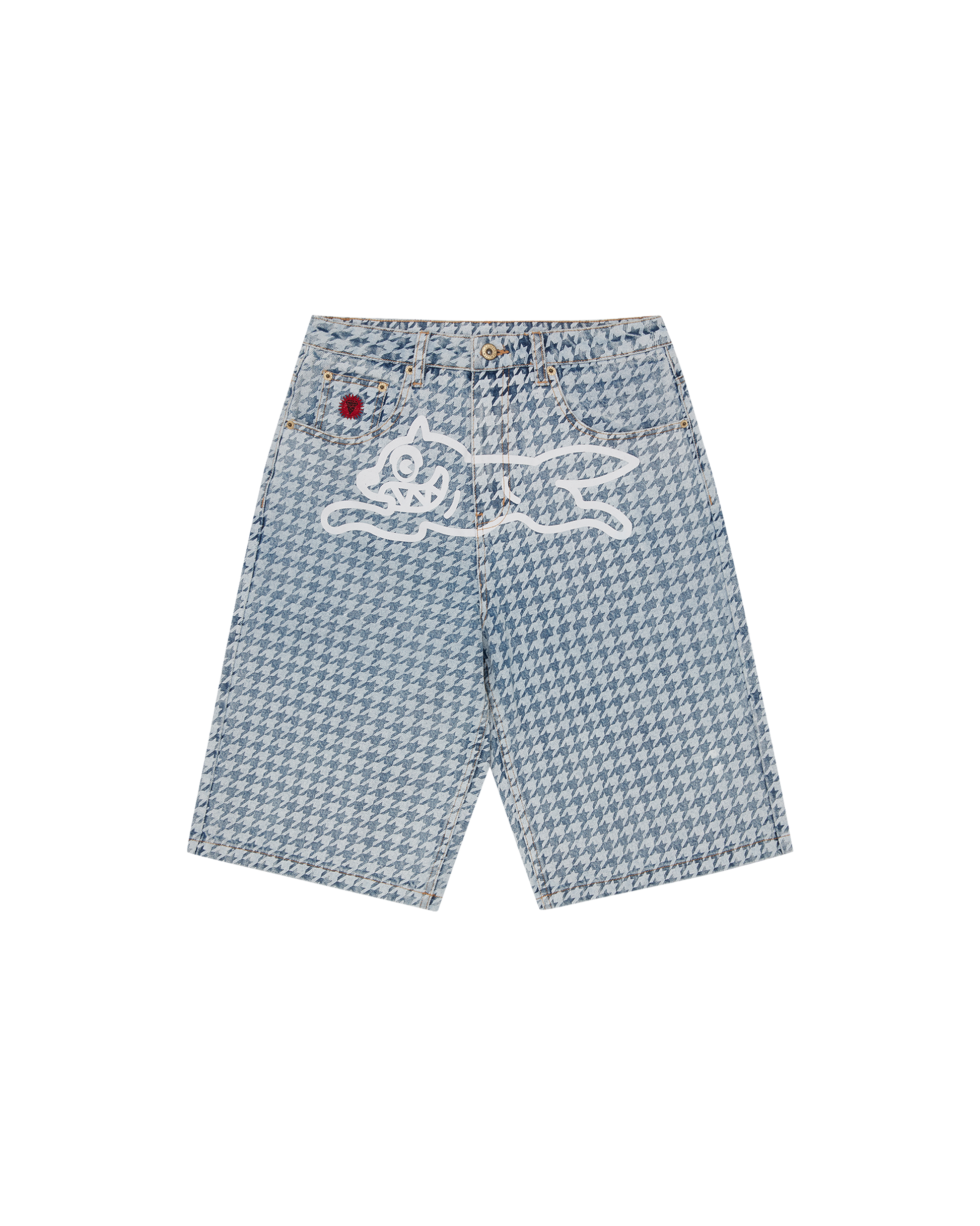 Houndstooth Running Dog Denim Shorts, featuring an all-over houndstooth graphic, the iconic screen-printed running dog graphic on the front, embroidered IC signet, embroidered "IC" lettering on the back pockets, and a zip-fastened fly. Loose fit.