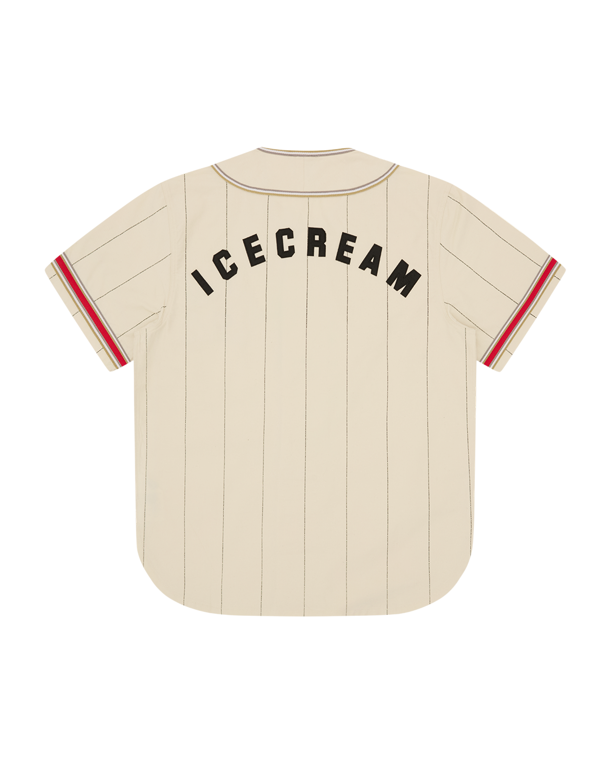 This IC Baseball Jersey features a chain-stitched IC felt patch on the front and an ICECREAM lettering felt patch on the back. It is detailed with striped tape on the sleeves and all-over vertical stripes composed of the ICECREAM logo.