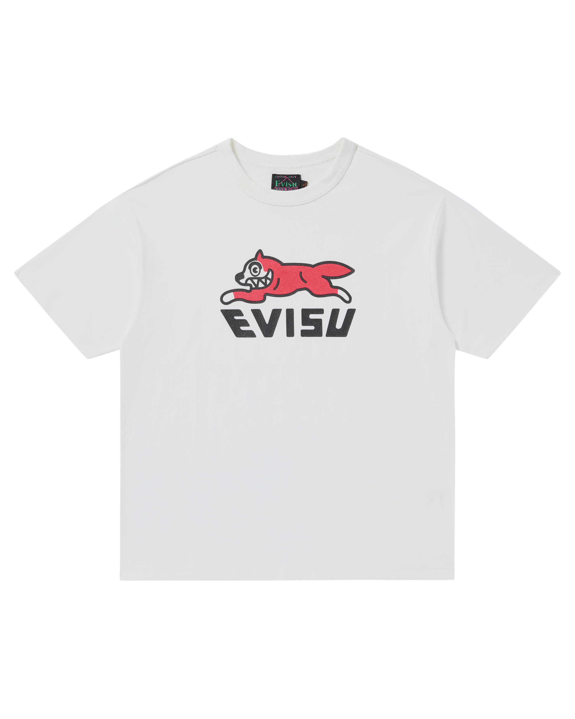 A relaxed-fit short sleeve tee featuring a bold logo with EVISU printed graphic across the chest. Made from 16S/1 100% cotton jersey, offering a soft, durable feel and a clean everyday silhouette.