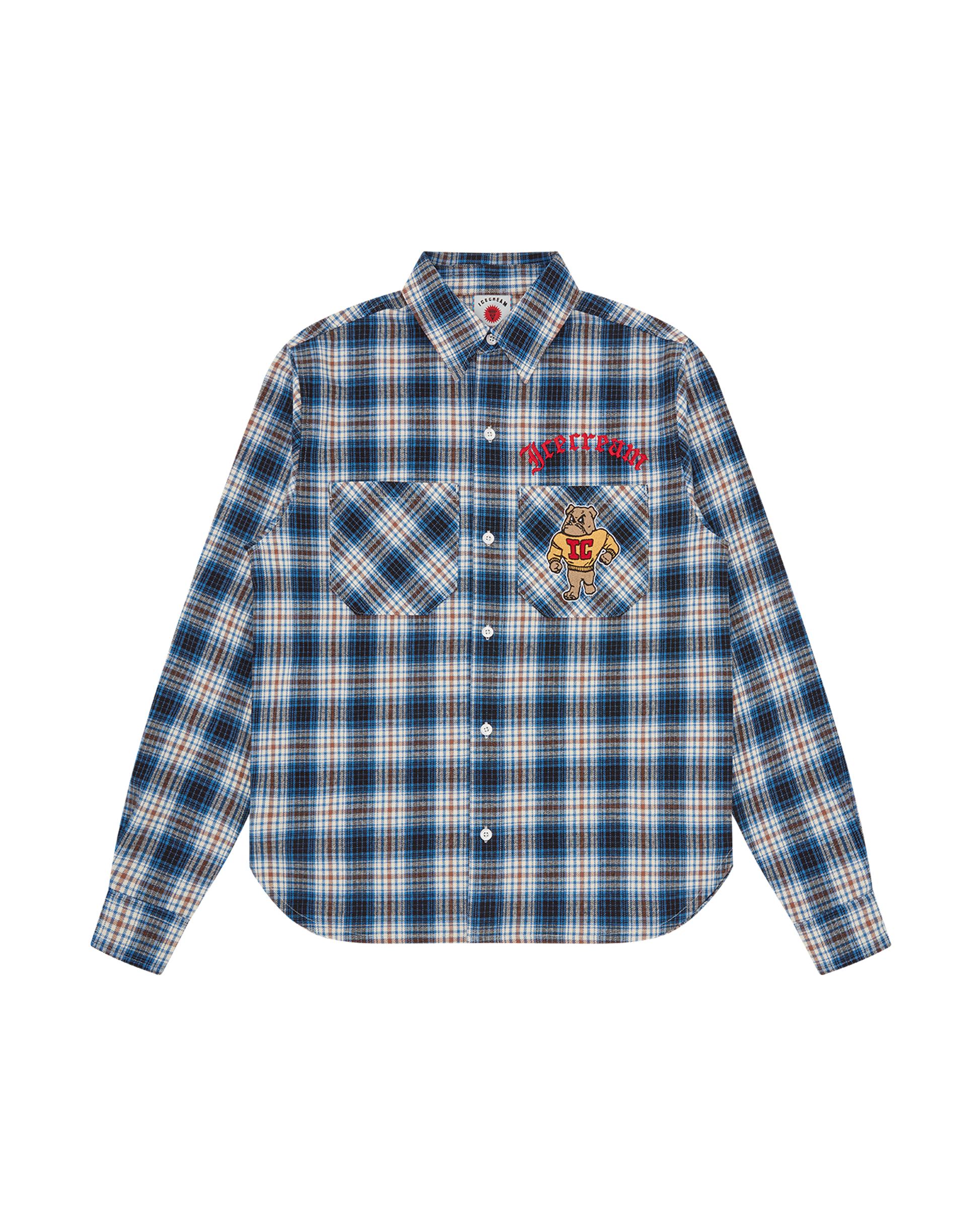 The Mascot Check LS Shirt features an Icecream patch logo on the chest pocket and the Icecream logo on the back, along with branded snap buttons.