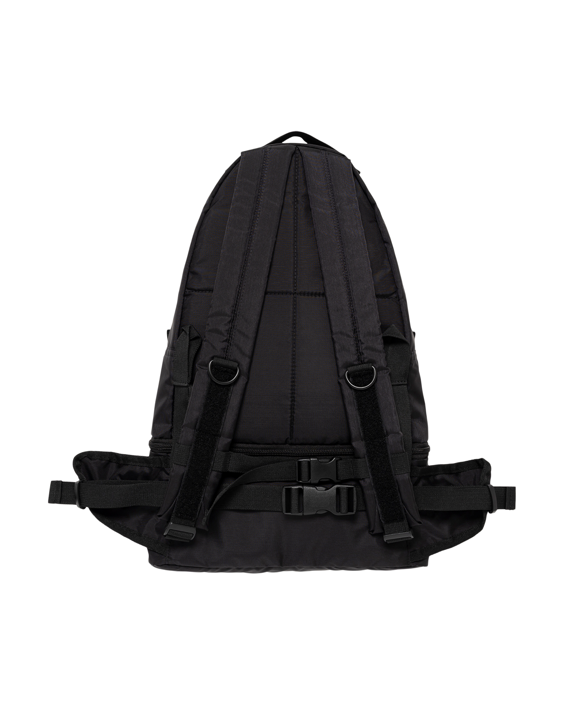Military-inspired backpack features adjustable chest and waist straps, a three-way design that separates the backpack and waist pouch, and a distinctive front pocket with the magic tape’s loop surface exposed.
