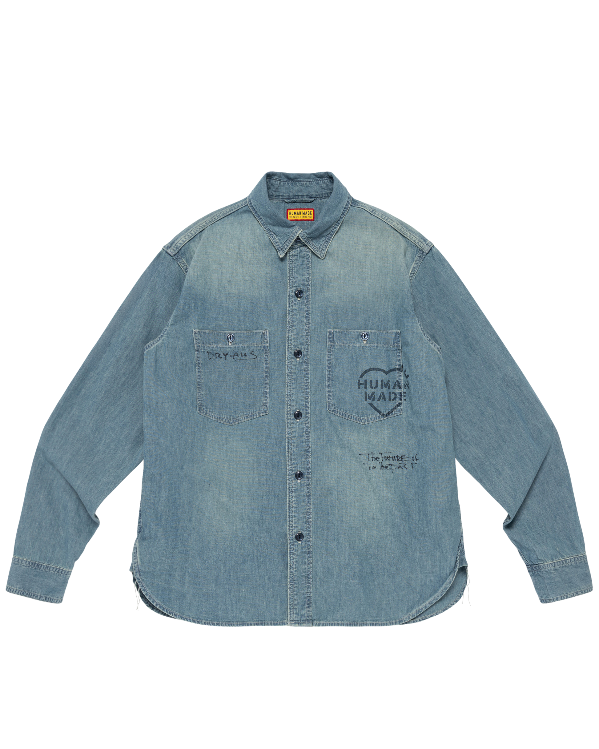 Military Chambray Shirt features a Wash processing the creates a vintage look, Military-inspired graphics on the front and back, Shell-like buttons with the brand logo, and Patch pockets on the chest.