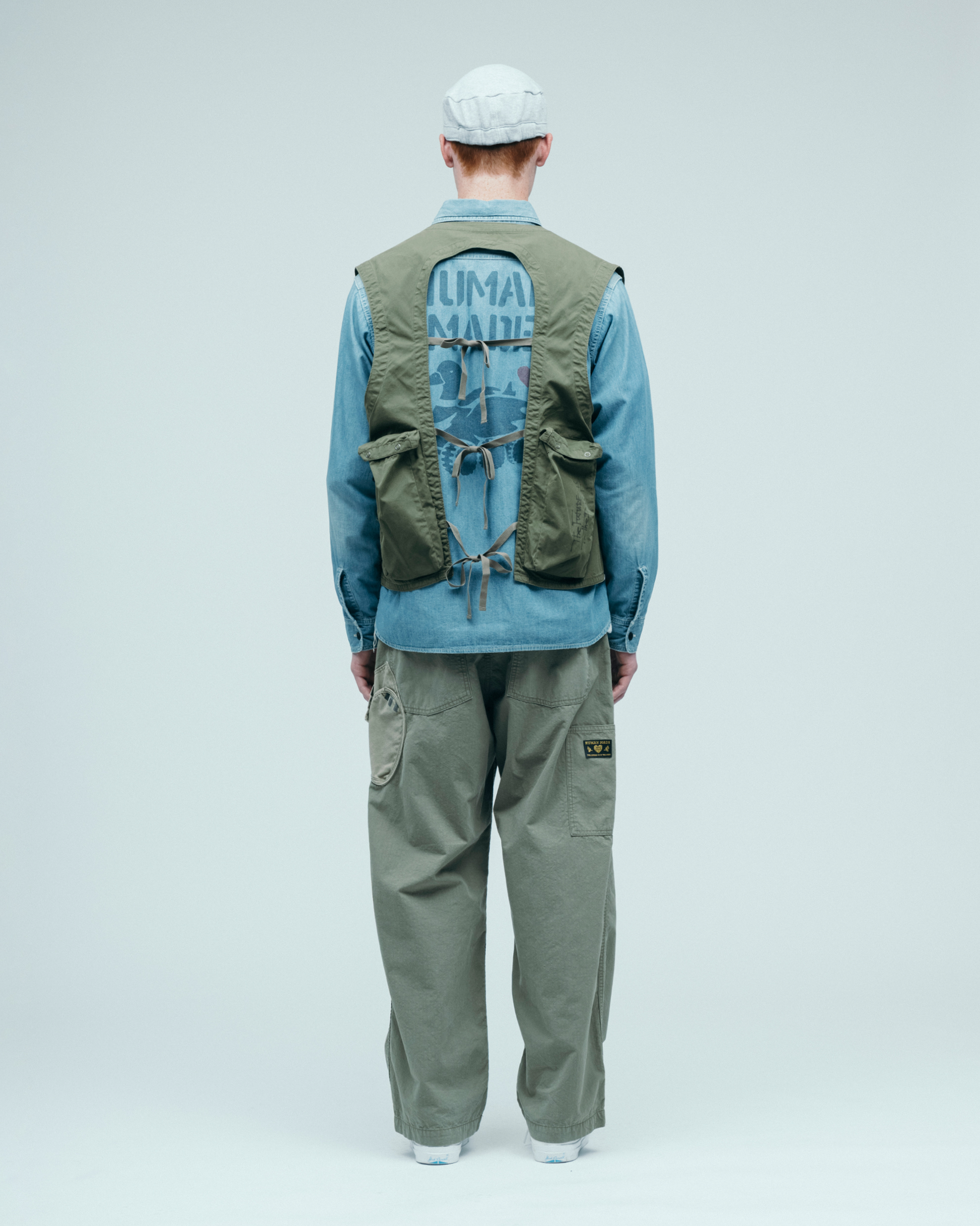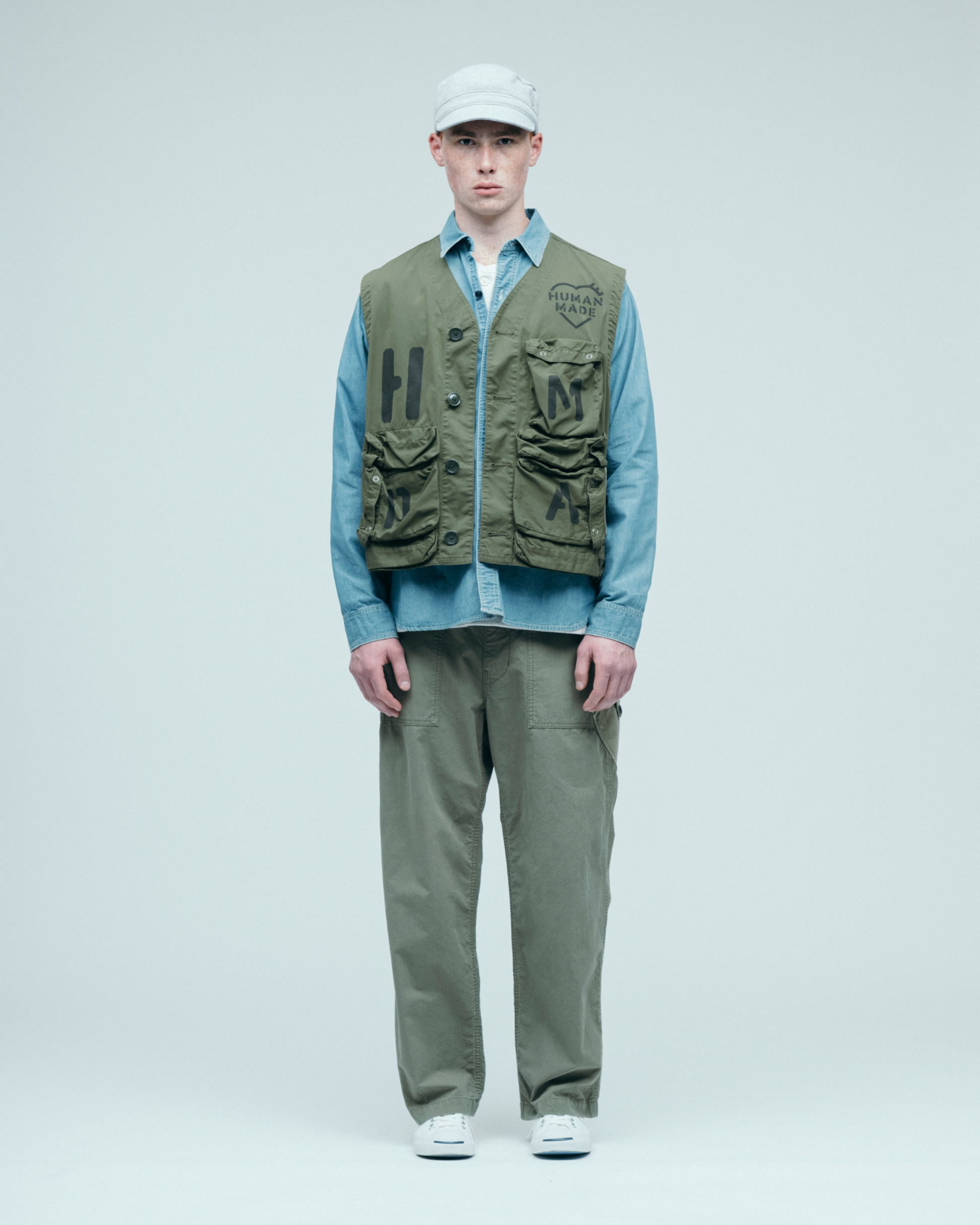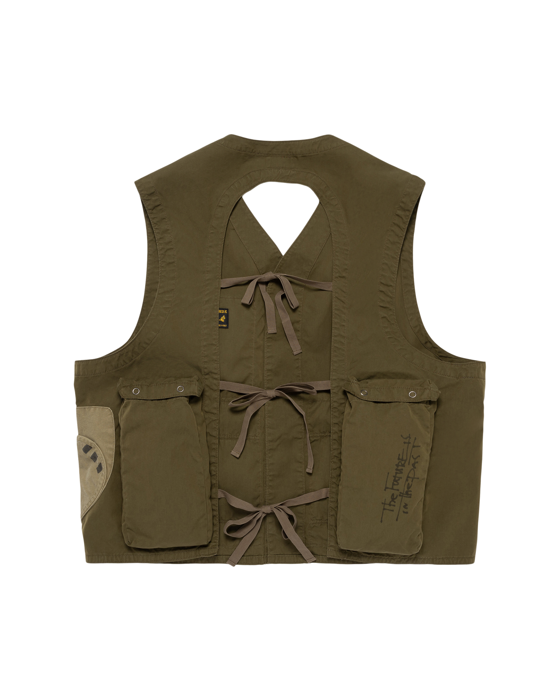 Military Vest features Stencil-style graphics on the front and back ・ Multi-pockets with ring snap button closures ・ Heart motif seam pocket on the side ・ Three straps on the back for fit adjustments