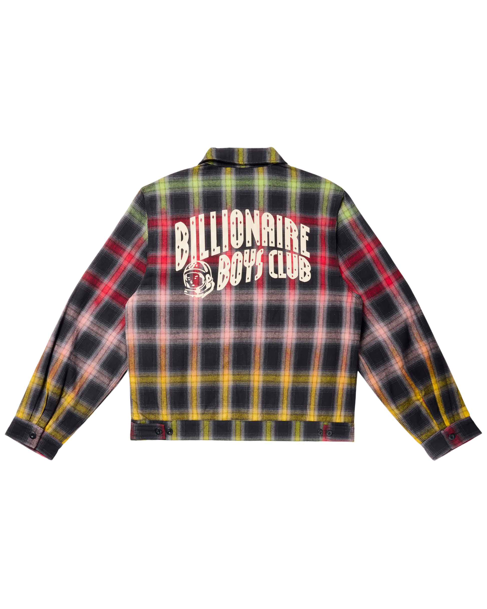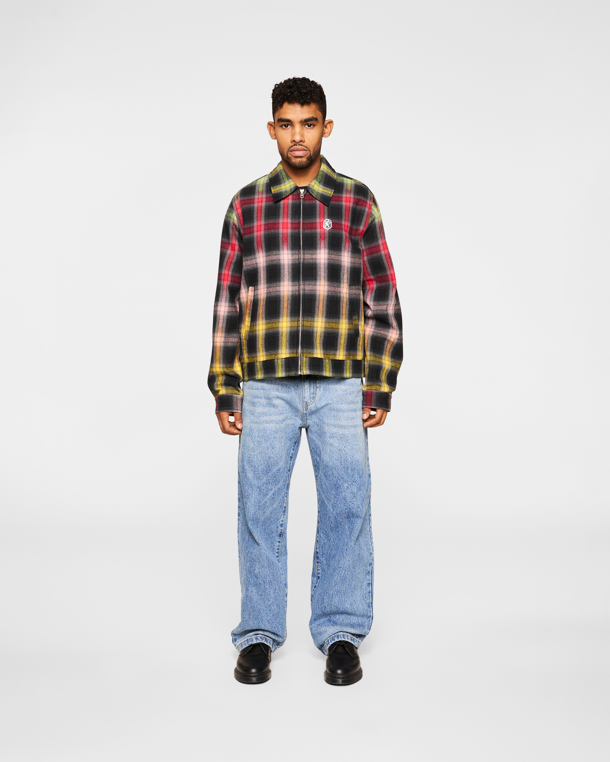 The Mixer Workmans Jacket features a plaid design, with the Helmet head patch on the front and the Arch logo printed on the back.