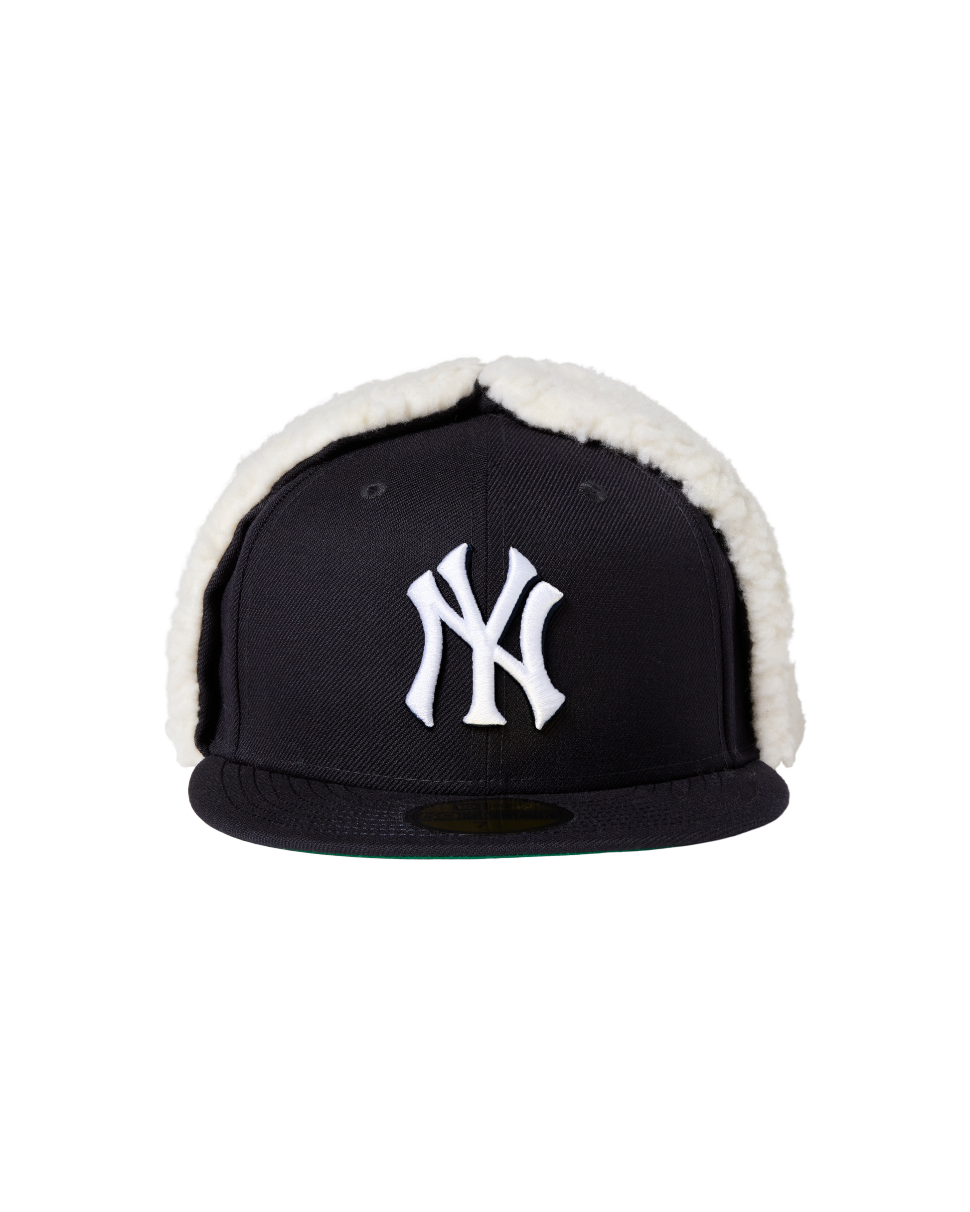 The New Era NY Yankees Trapper Fitted features adjustable flaps, fleece lining, an embroidered NYY logo on the front panel, and a BBC script logo on the back.