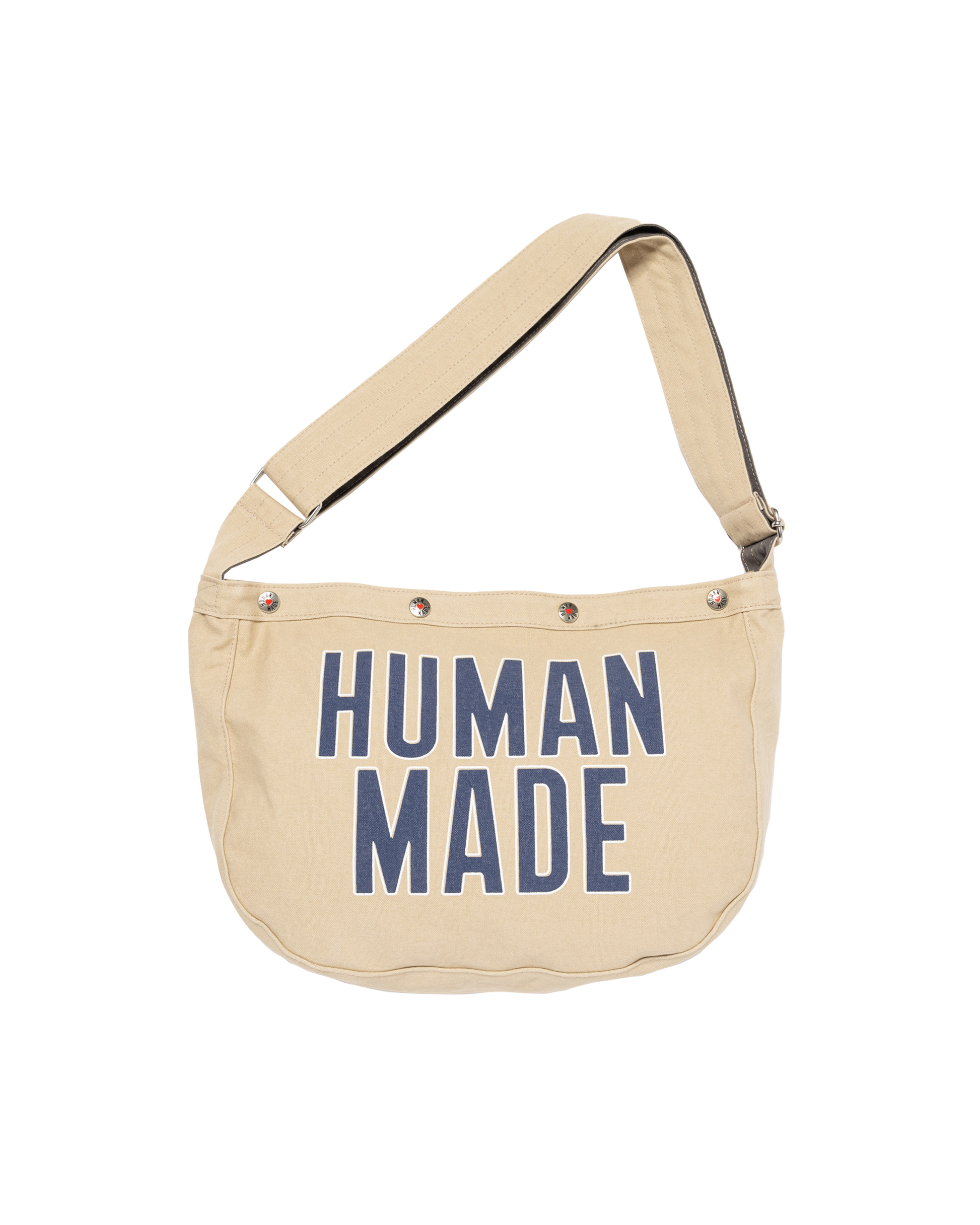The Paperboy Bag is crafted from durable 12oz cotton canvas with a distressed finish for a vintage look. It features snap buttons for secure closure and displays the iconic HUMAN MADE graphic.