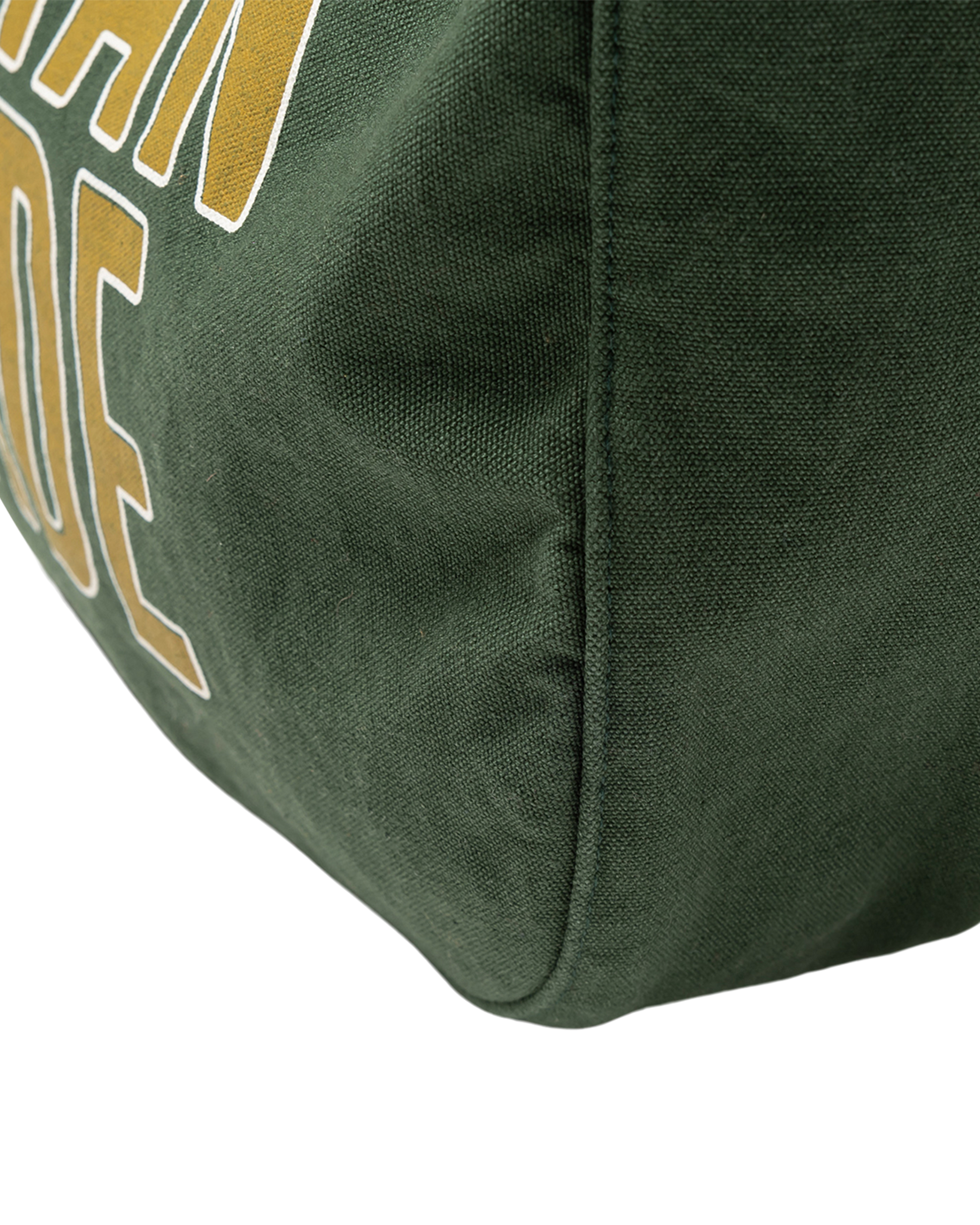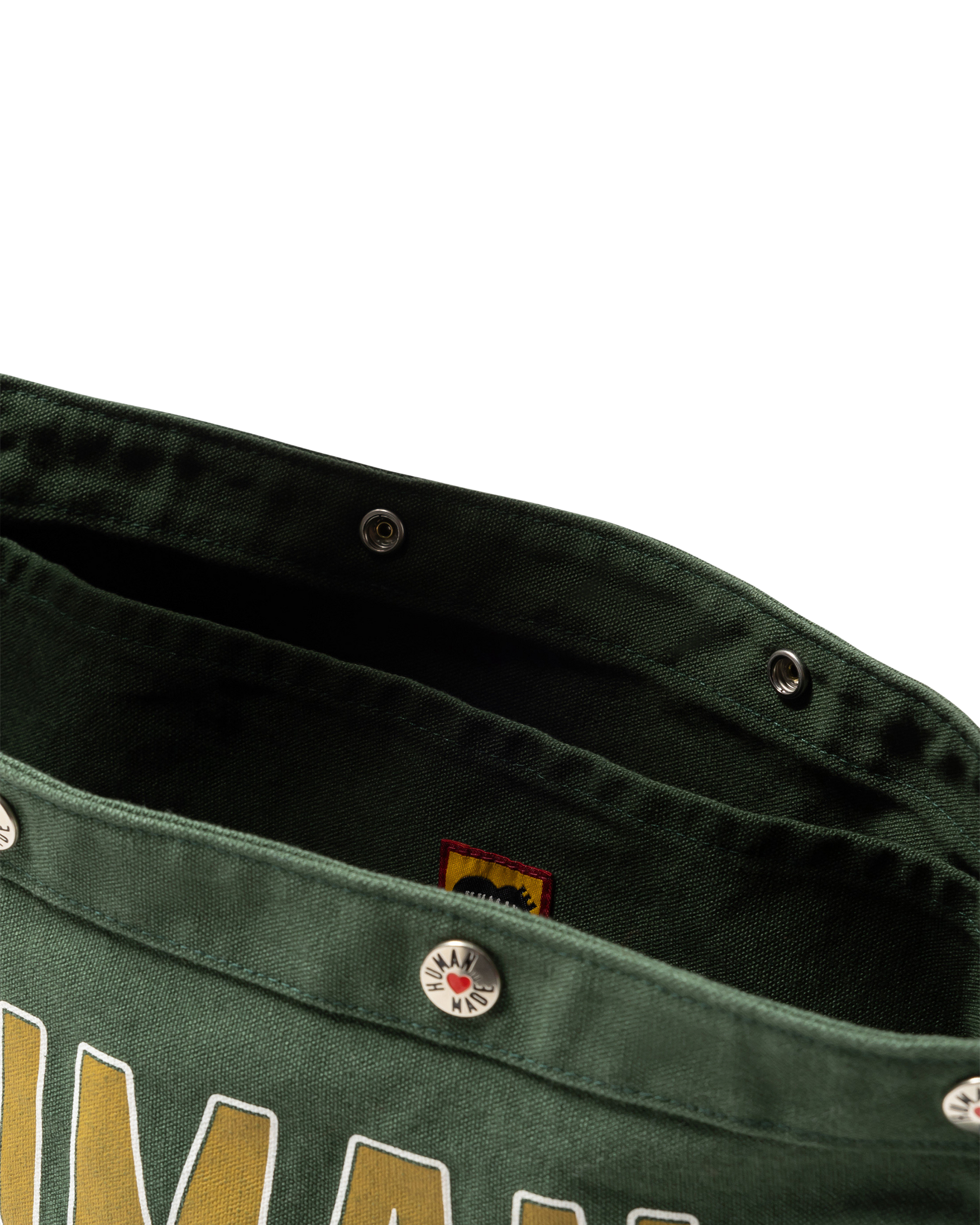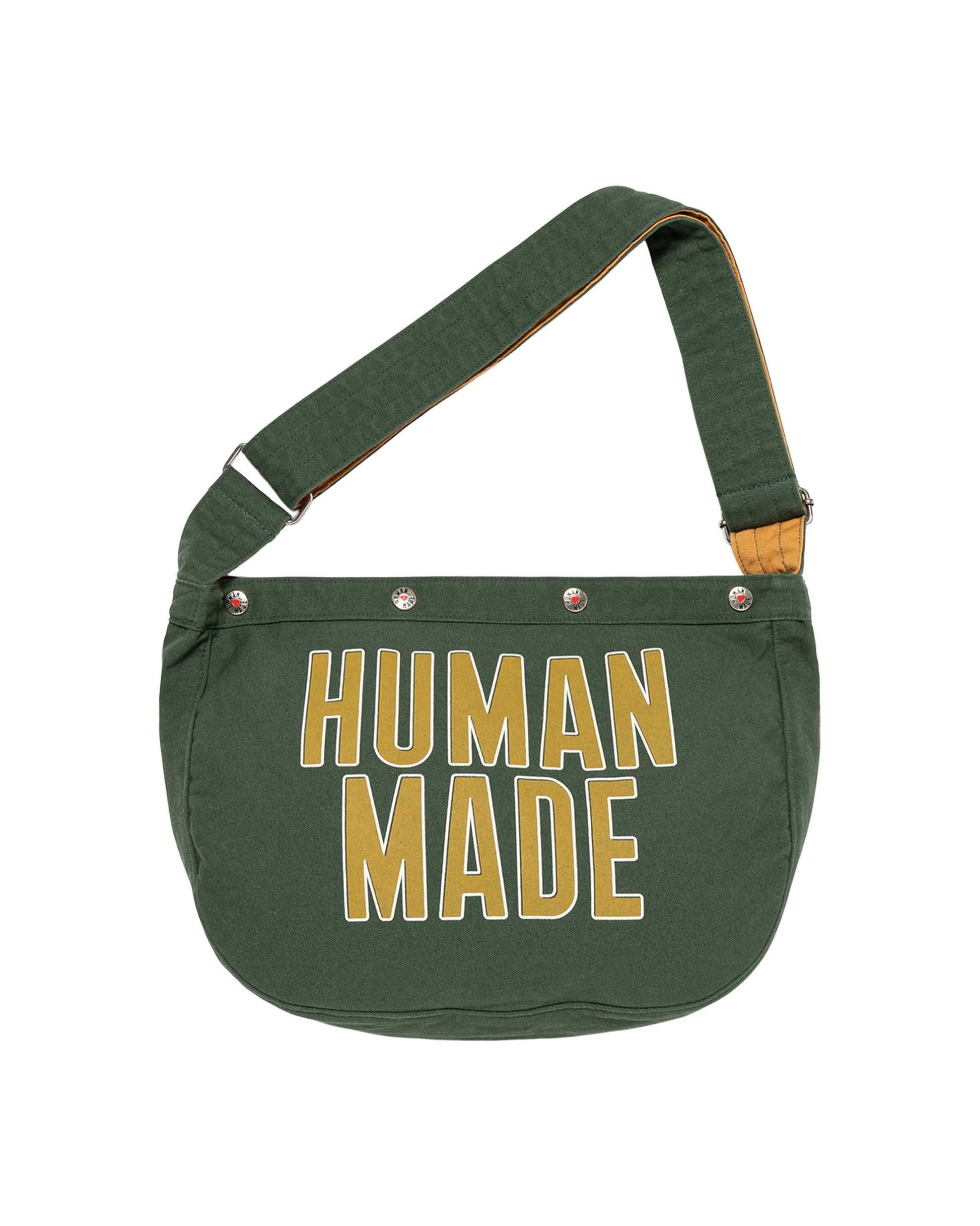 The Paperboy Bag is crafted from durable 12oz cotton canvas with a distressed finish for a vintage look. It features snap buttons for secure closure and displays the iconic HUMAN MADE graphic.