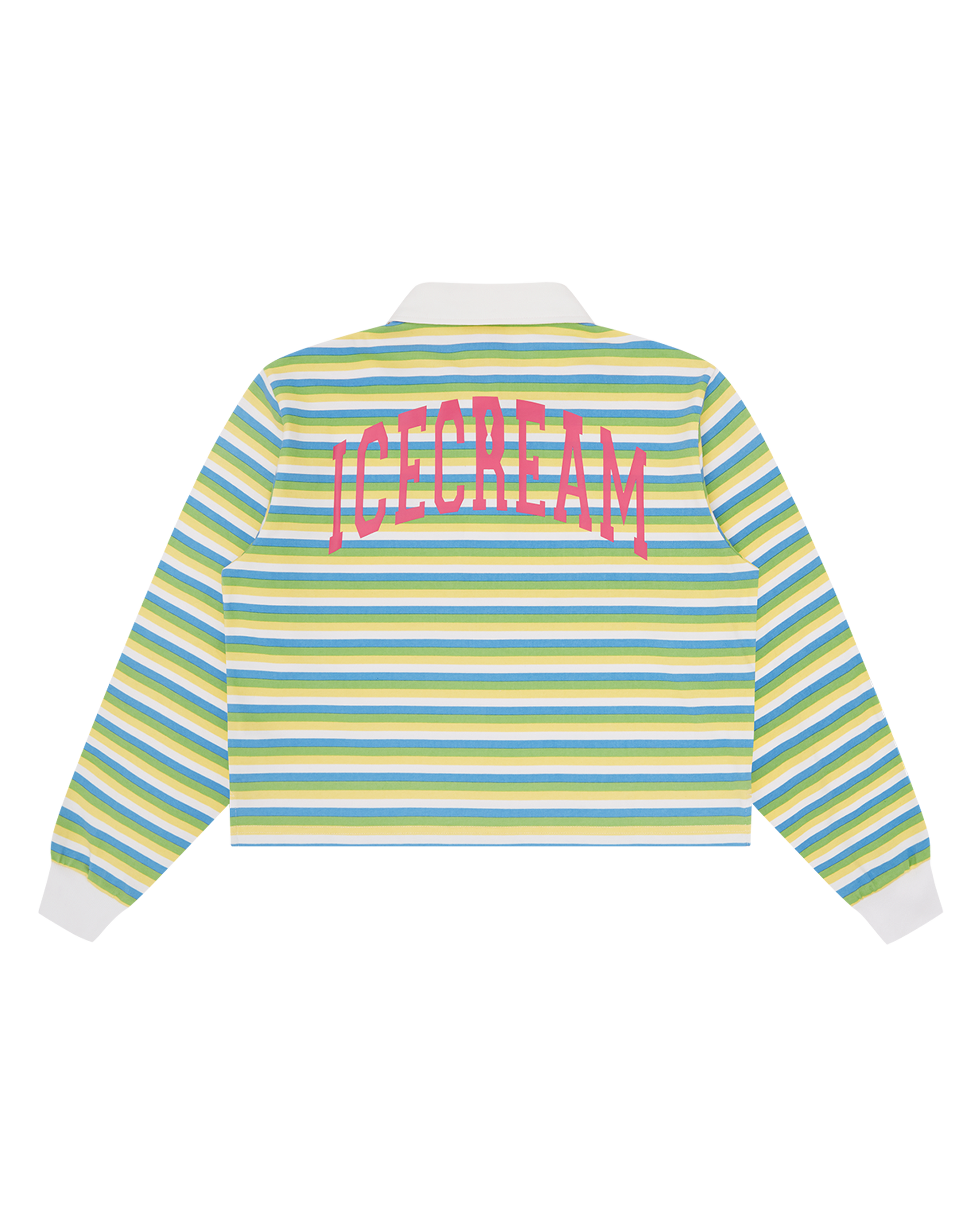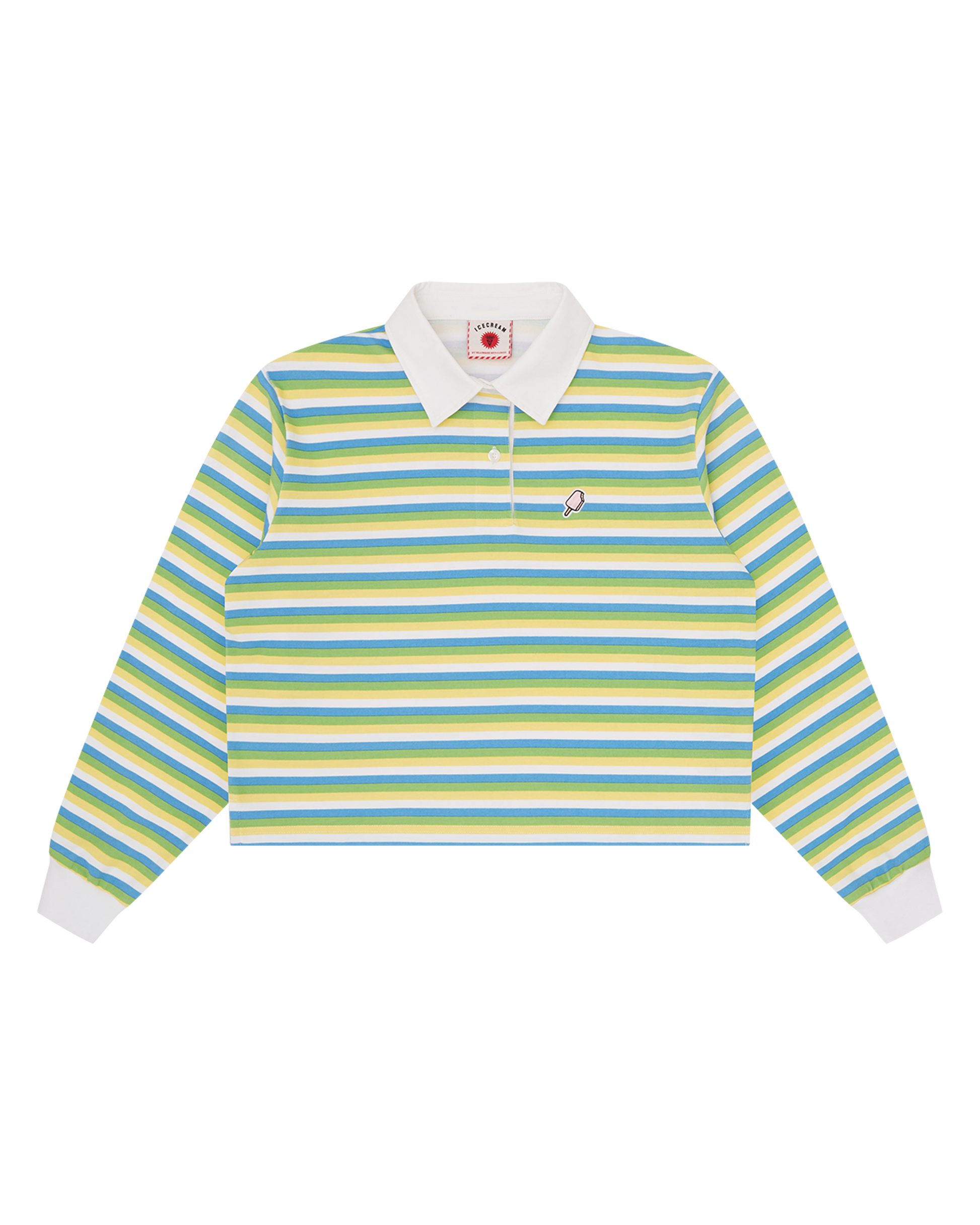 The Popsicle Striped Cropped Rugby Shirt features an embroidered popsicle at the chest, contrasting stripes, and branded buttons. Detailed with printed ICECREAM lettering on the back, it offers a boxy, street-ready fit.
