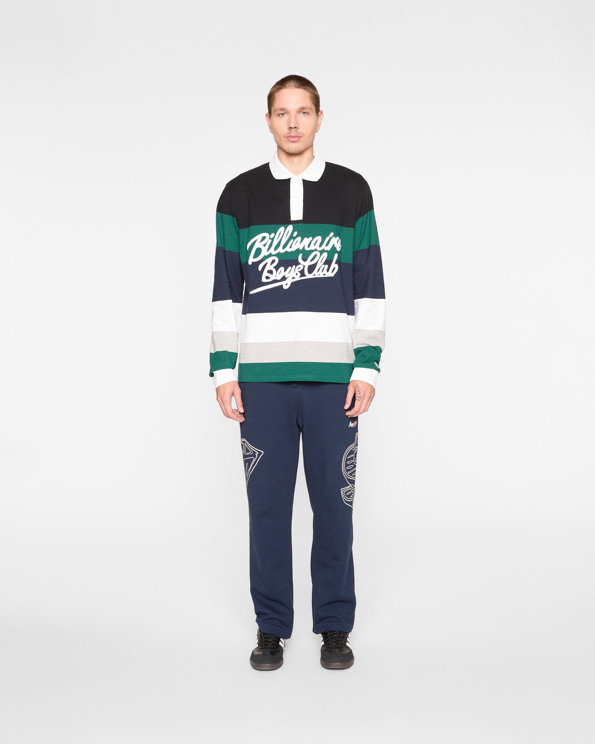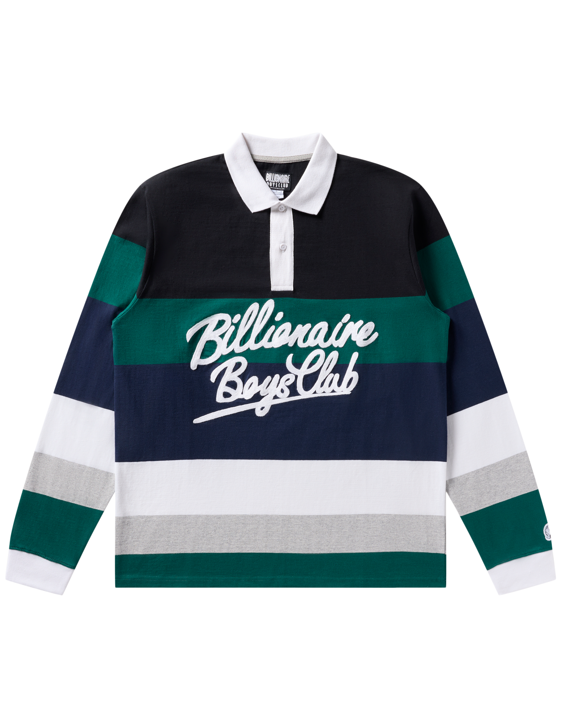 The Rugby Jersey LS Knit features a button-front collar and placket design, multi-toned color blocking, and the front-chest embroidered Script logo.