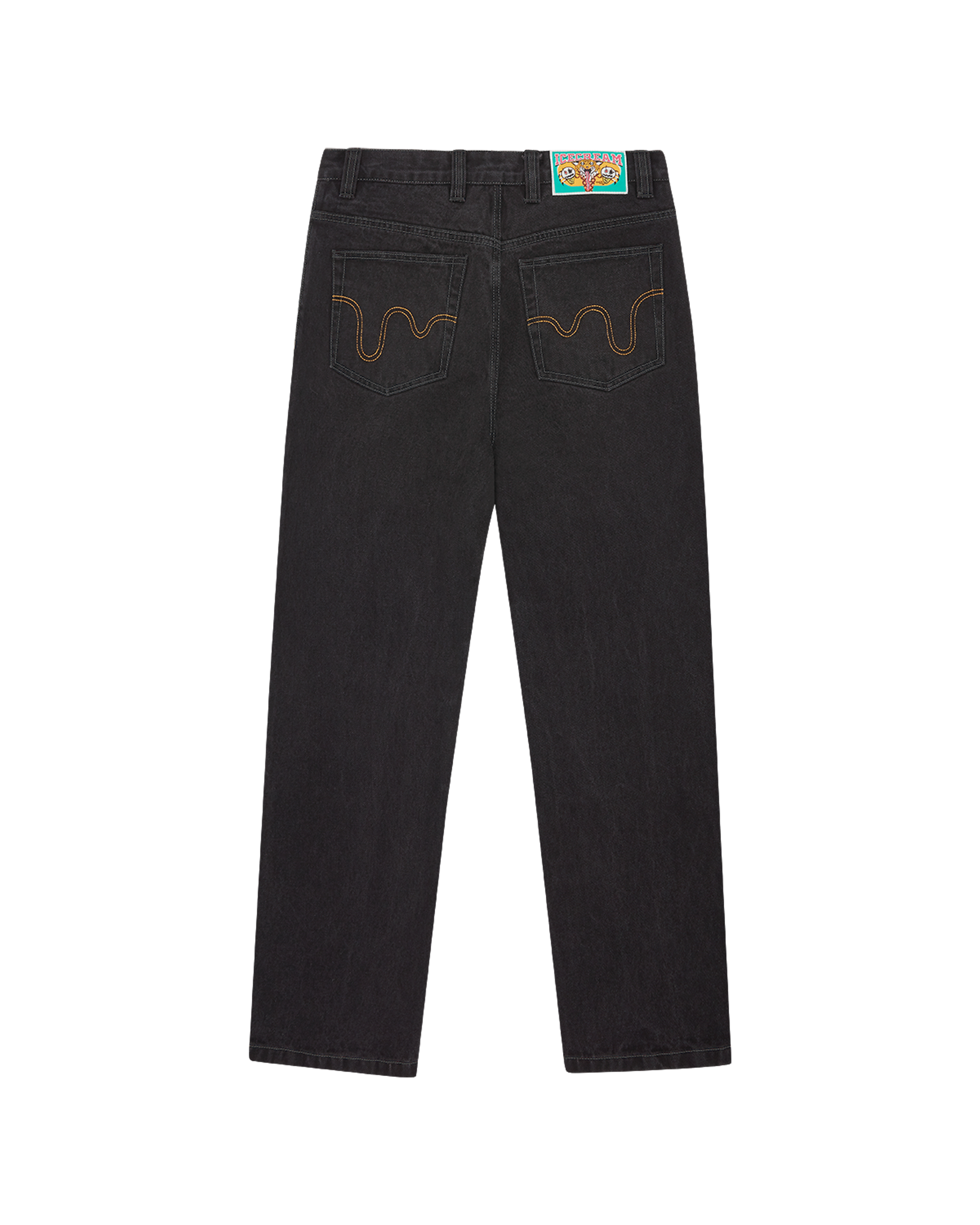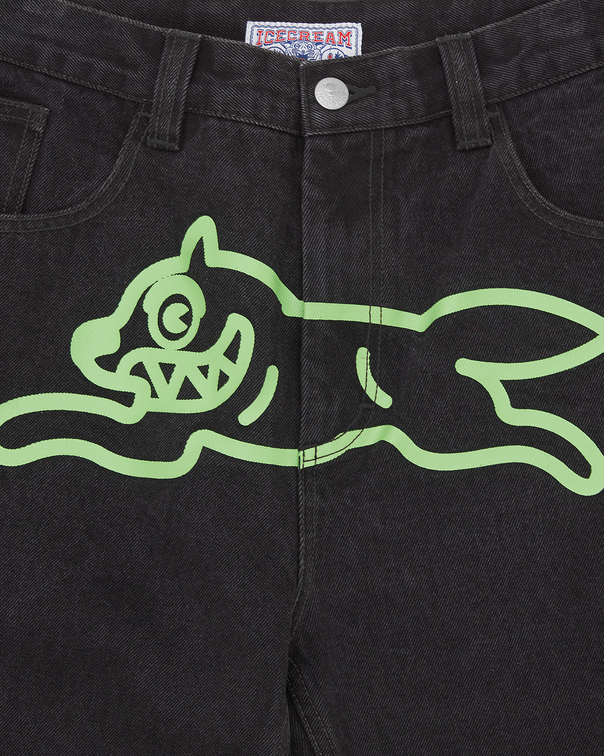 Running Dog Double Scoop Denim Pant, features a screen-printed running dog graphic on the front, embroidered double scoop signet at coin pocket, and drip detailing on the back pockets.