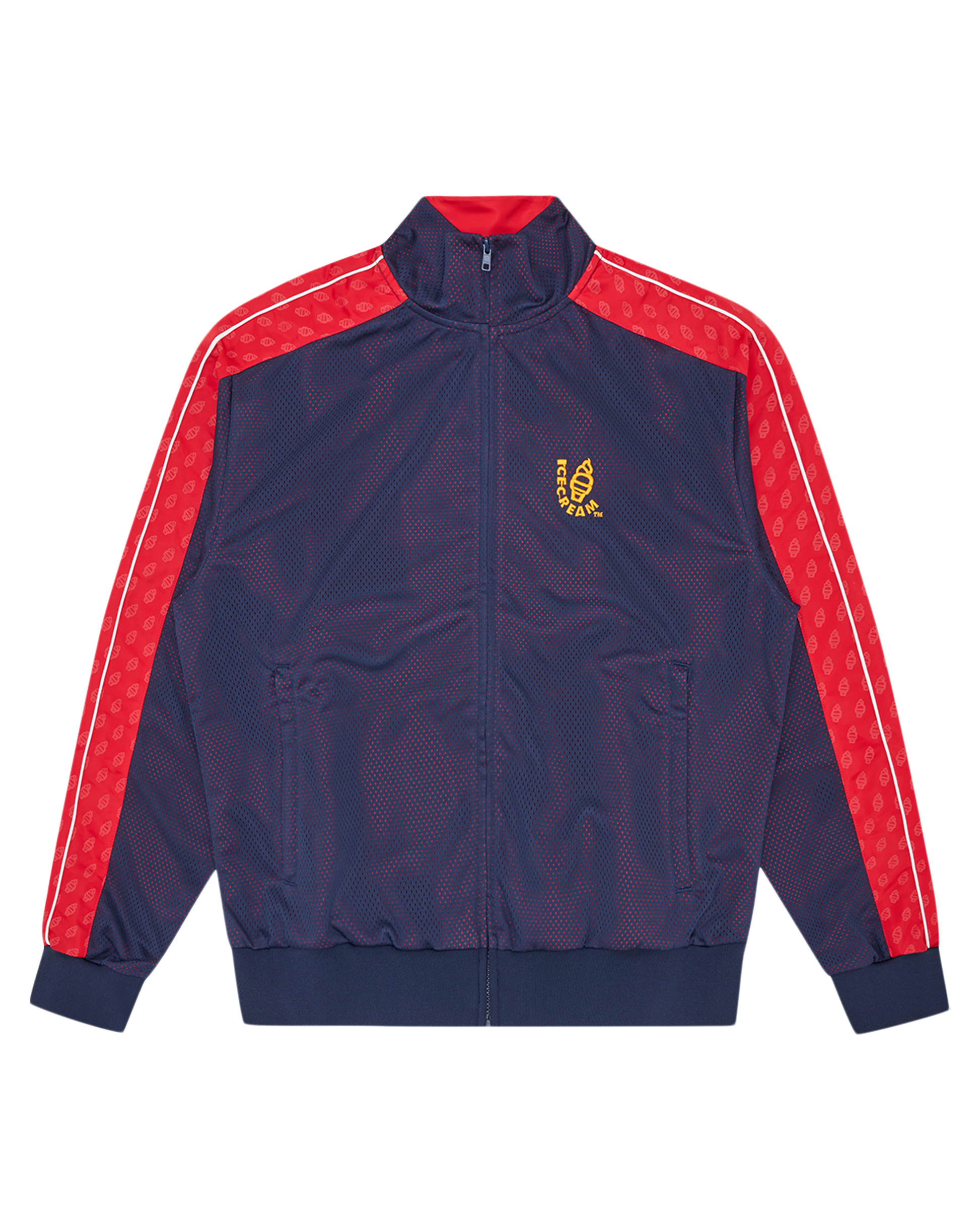 Soft Serve Layered Mesh Track Top featuring a double-layer mesh construction with green over blue, finished with the OG ICECREAM Soft Serve logo embroidered on the chest and printed on both the sleeve panels.