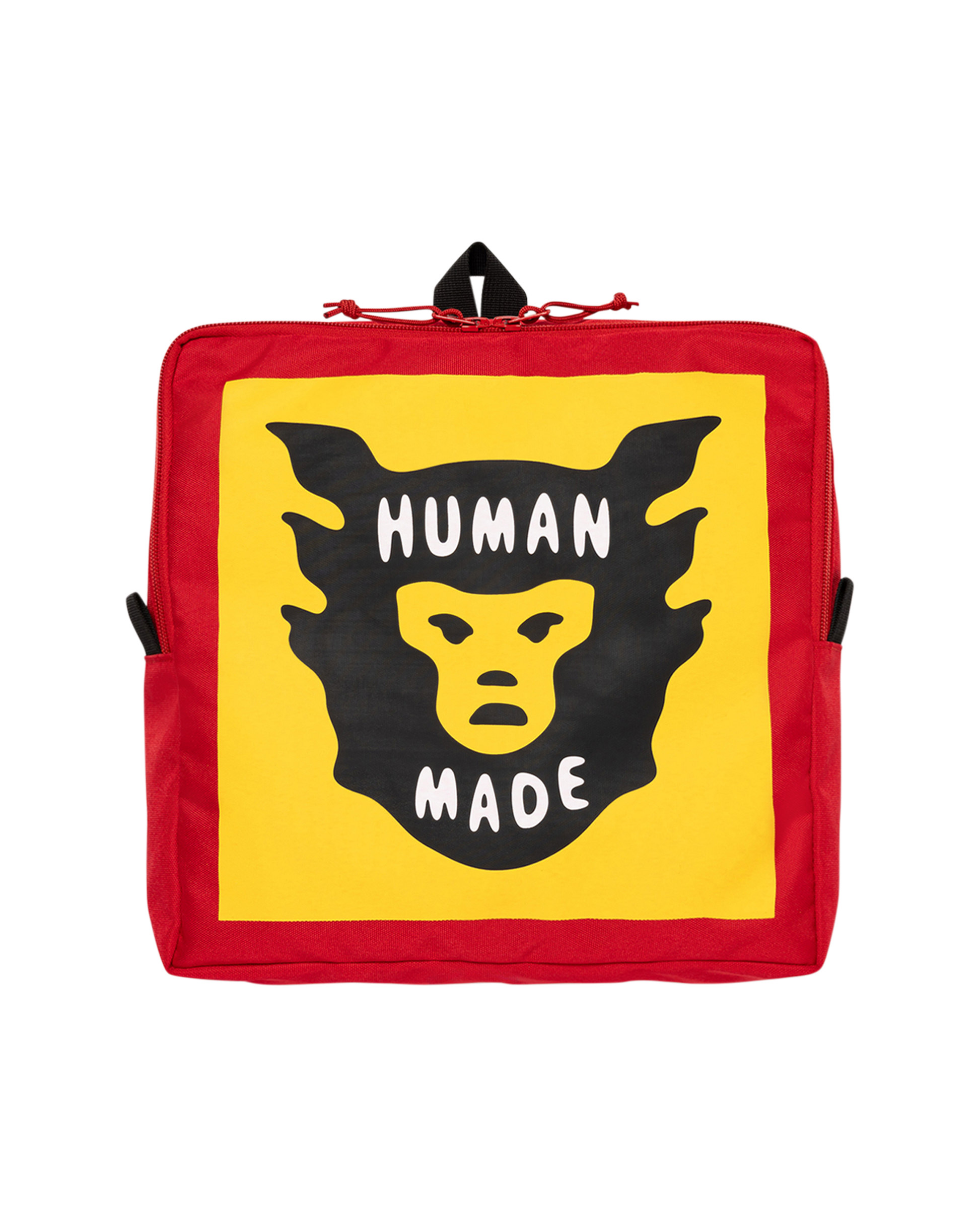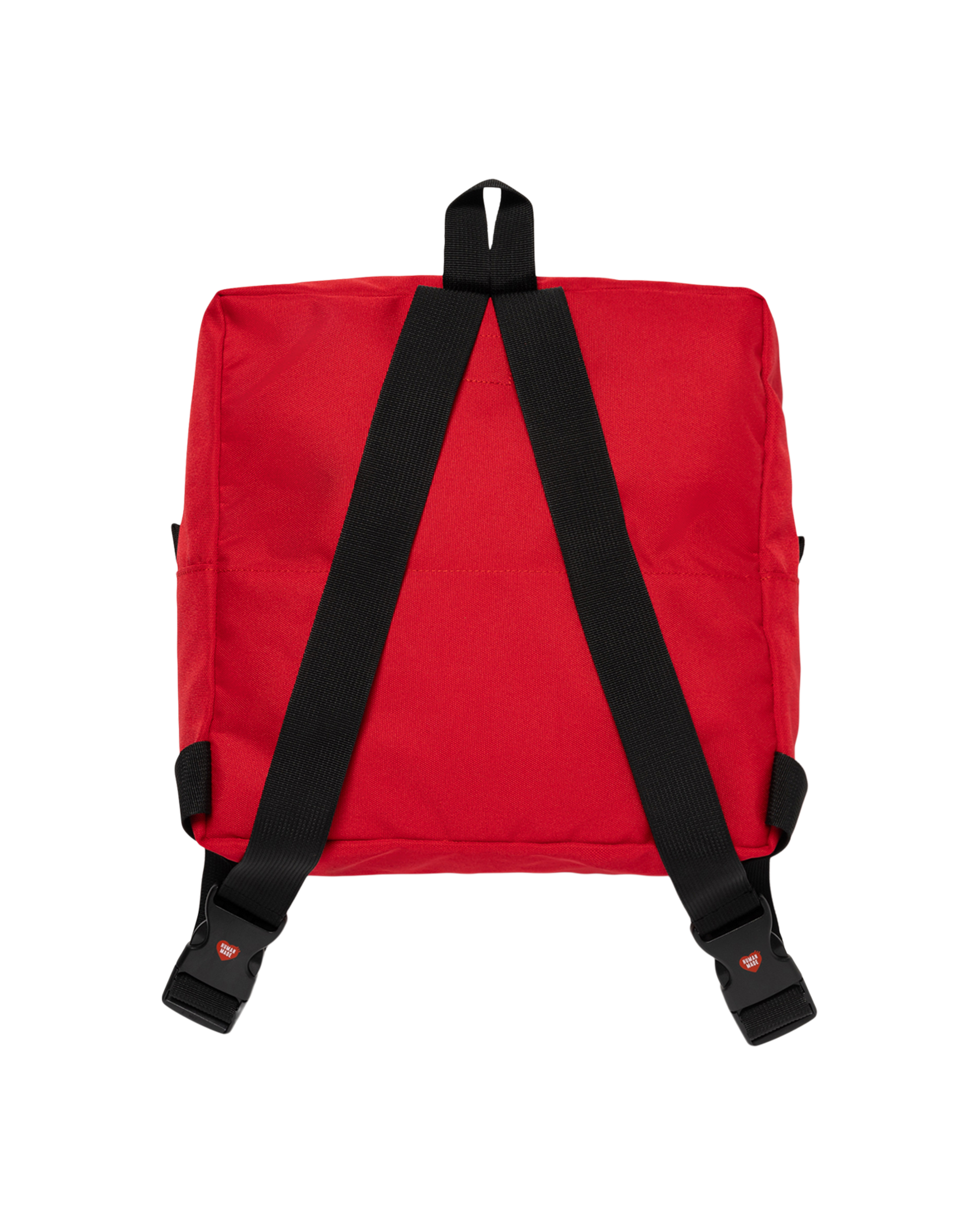 The Square backpack features bold colors, straps with heart logo buckles, and the Human Made brand logo on the front.